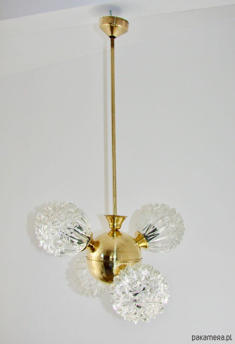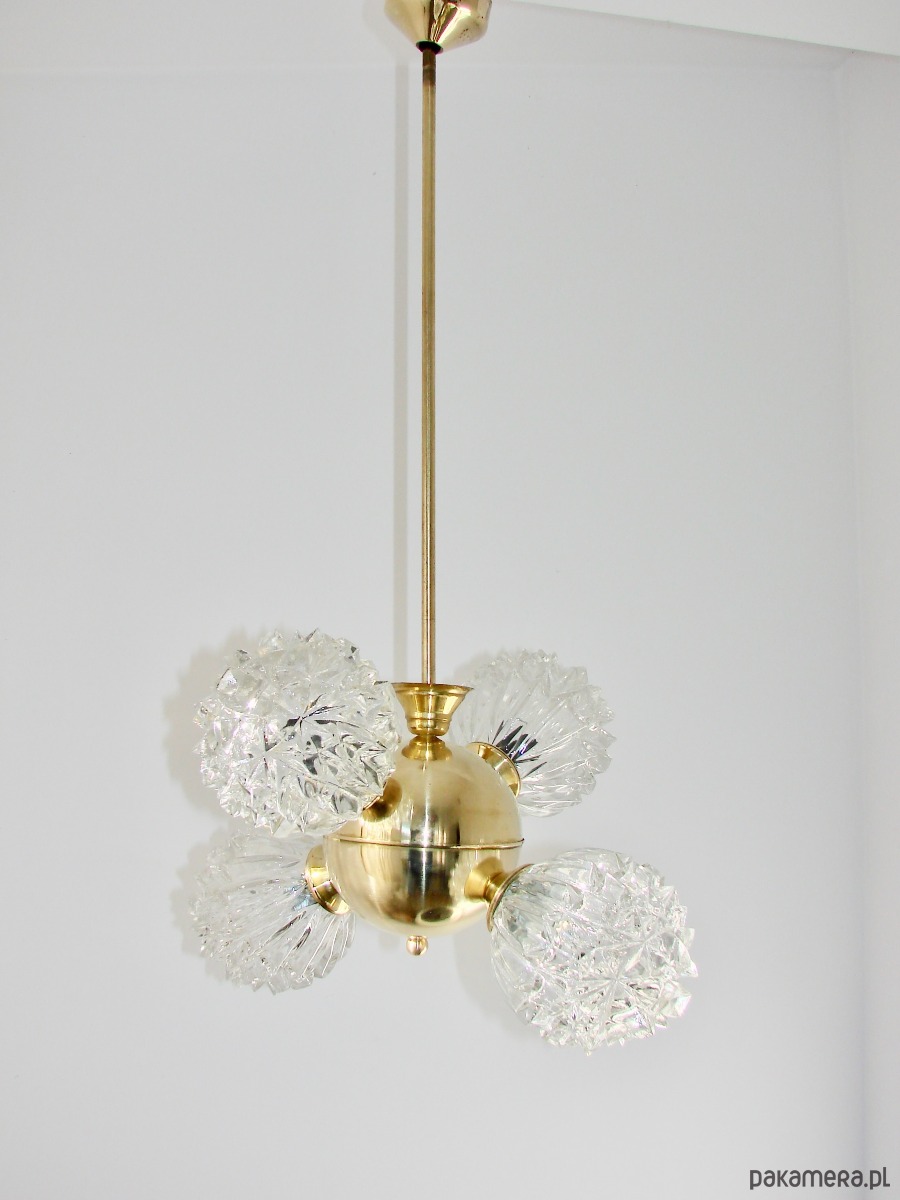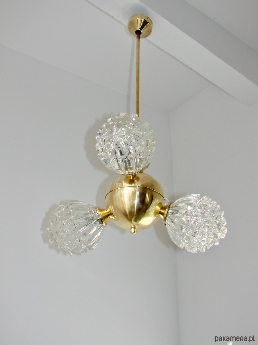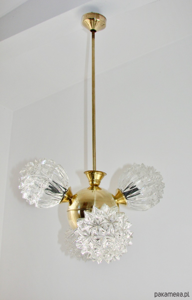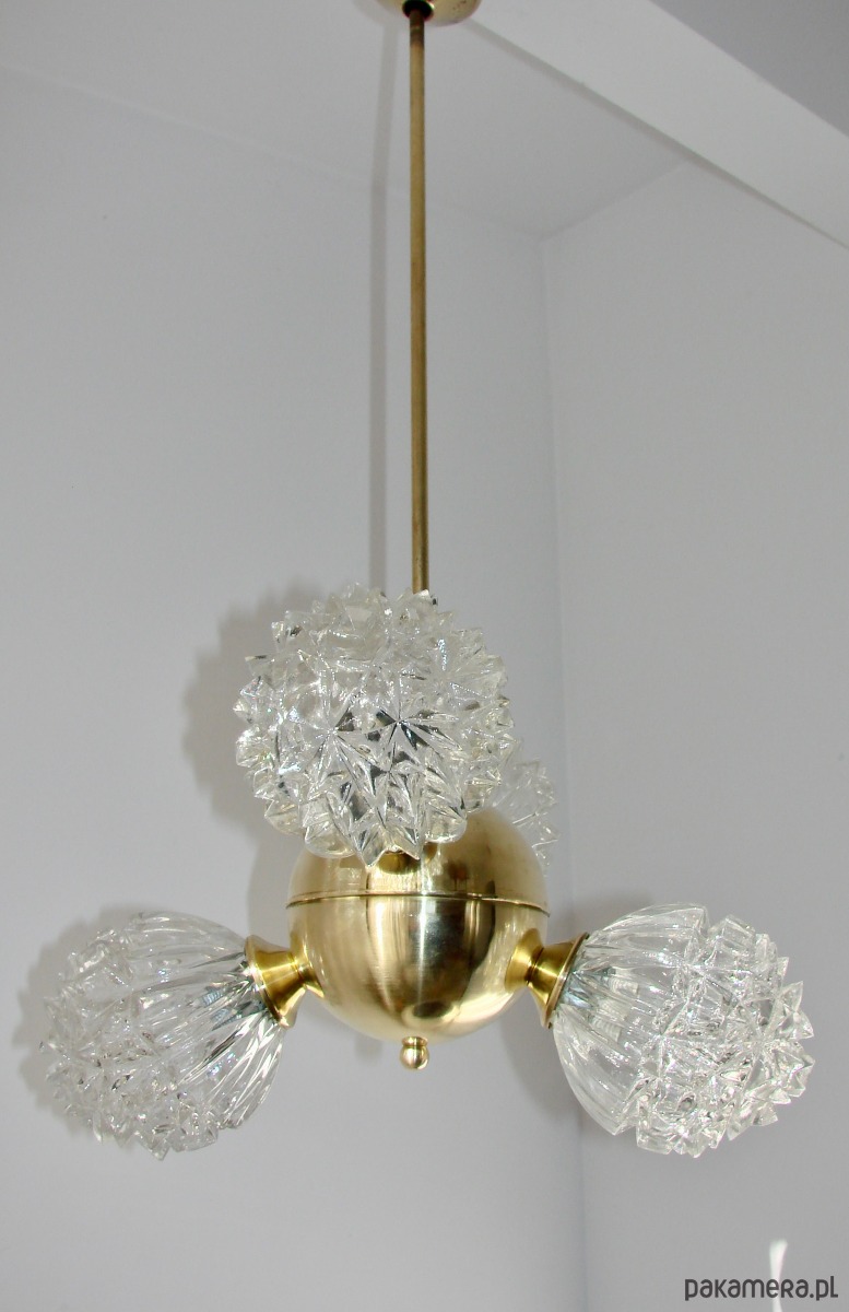Piękny przykład wzornictwa vintage w stylu mid-century. Lampa została wykonana z polerowanego mosiądzu oraz szkła fornirowanego, które tworzy efektowne, dekoracyjne klosze o strukturze kryształów. Konstrukcja jest solidna i wyjątkowo dekoracyjna — idealna do salonu, jadalni lub wnętrz w stylu retro, glamour czy modern vintage.