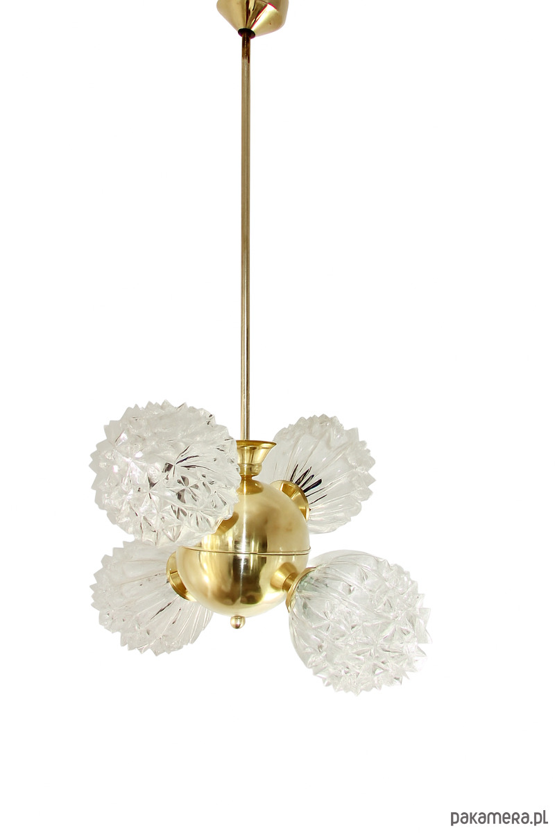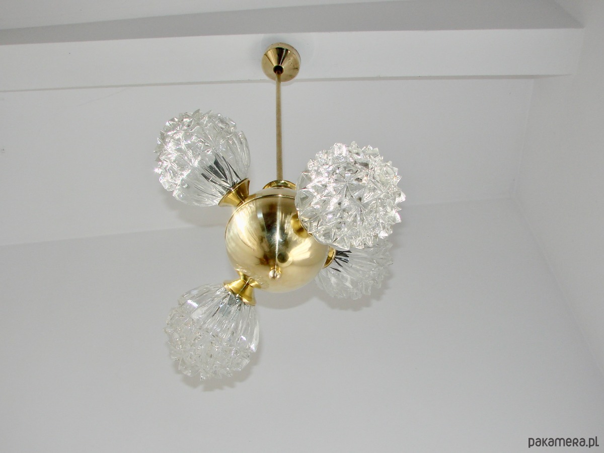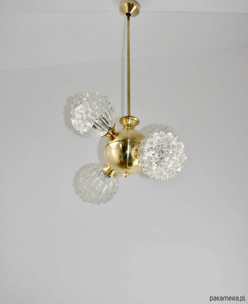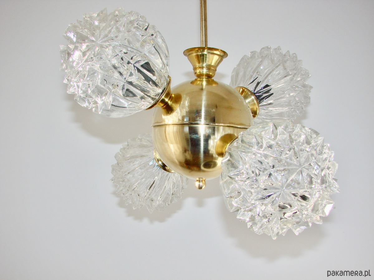 Piękny przykład wzornictwa vintage w stylu mid-century. Lampa została wykonana z polerowanego mosiądzu oraz szkła fornirowanego, które tworzy efektowne, dekoracyjne klosze o strukturze kryształów. Konstrukcja jest solidna i wyjątkowo dekoracyjna — idealna do salonu, jadalni lub wnętrz w stylu retro, glamour czy modern vintage.