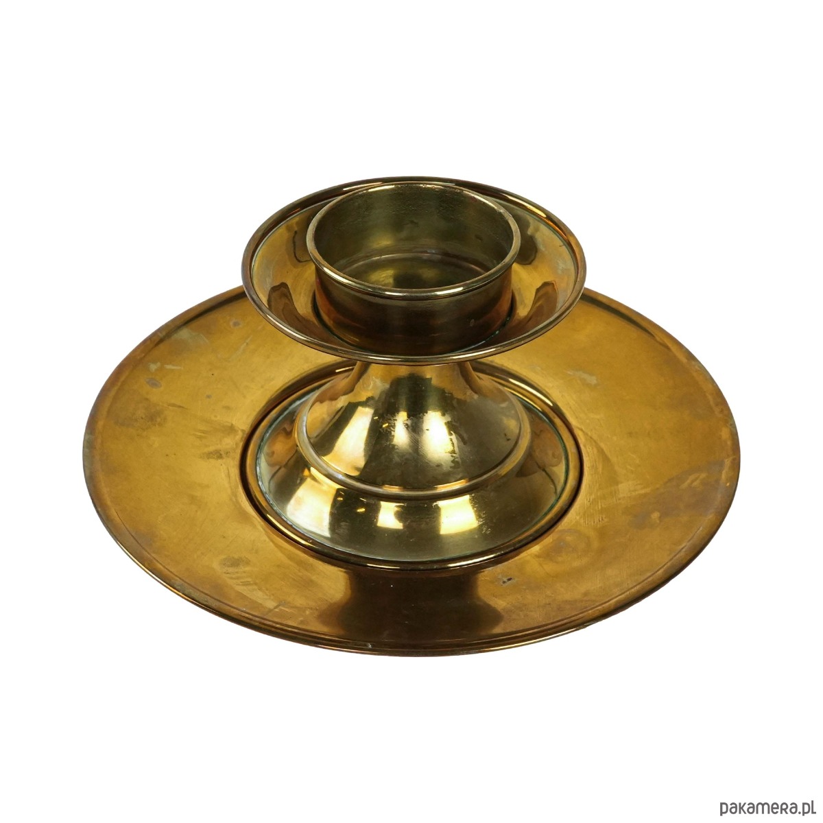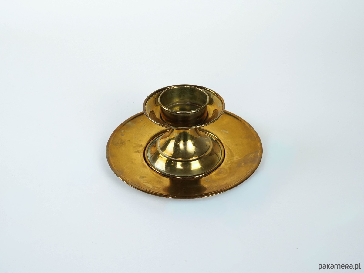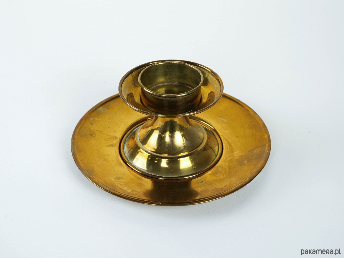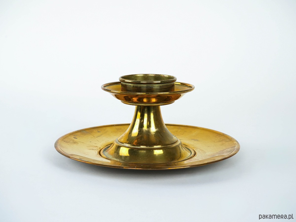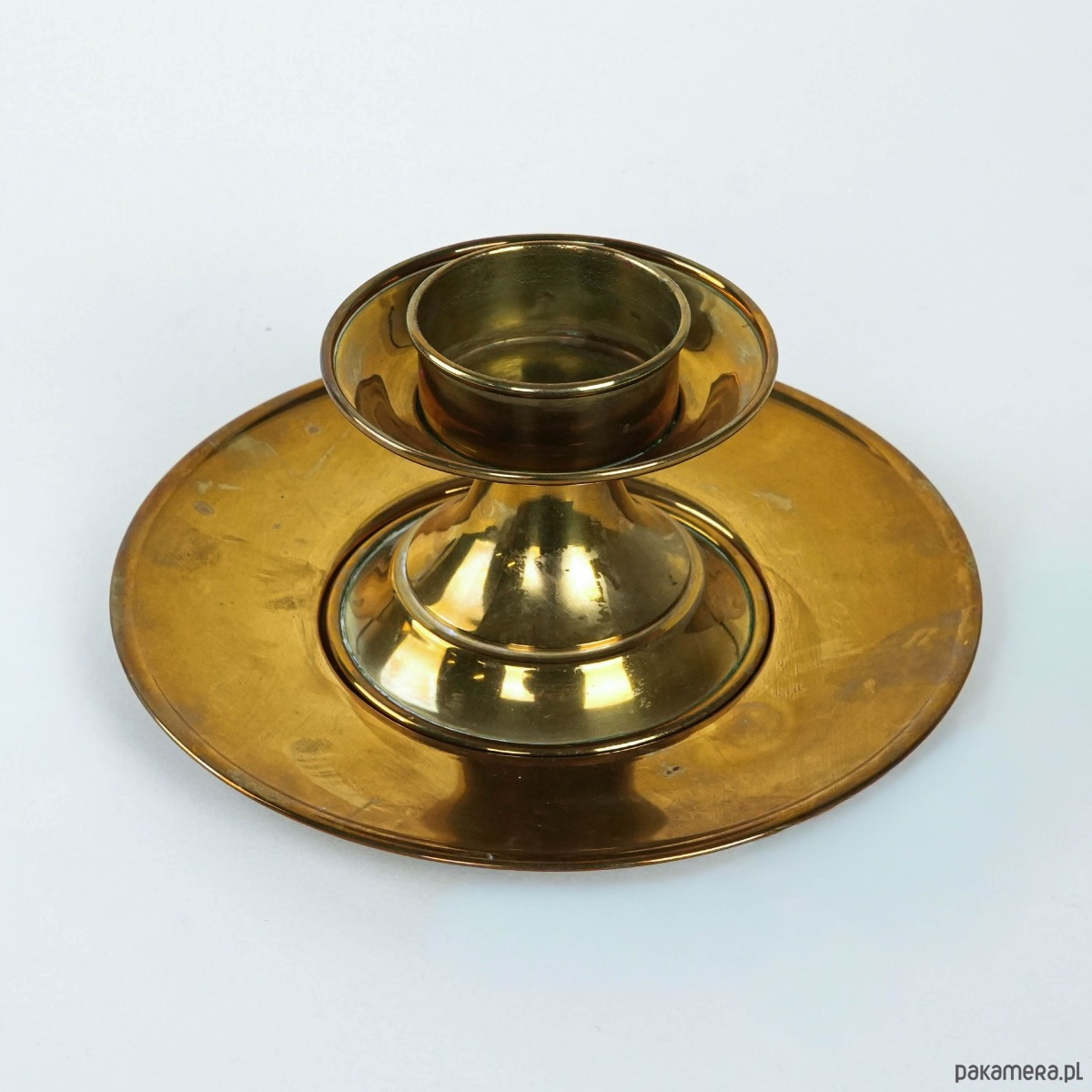 Świecznik wykonany z polerowanego mosiądzu, z szeroką podstawką zabezpieczającą przed skapującym woskiem. Prosty, modernistyczny kształt podkreśla funkcjonalny charakter przedmiotu, a jednocześnie nadaje mu elegancji. Oryginalny egzemplarz vintage, ceniony przez kolekcjonerów designu użytkowego drugiej połowy XX wieku.