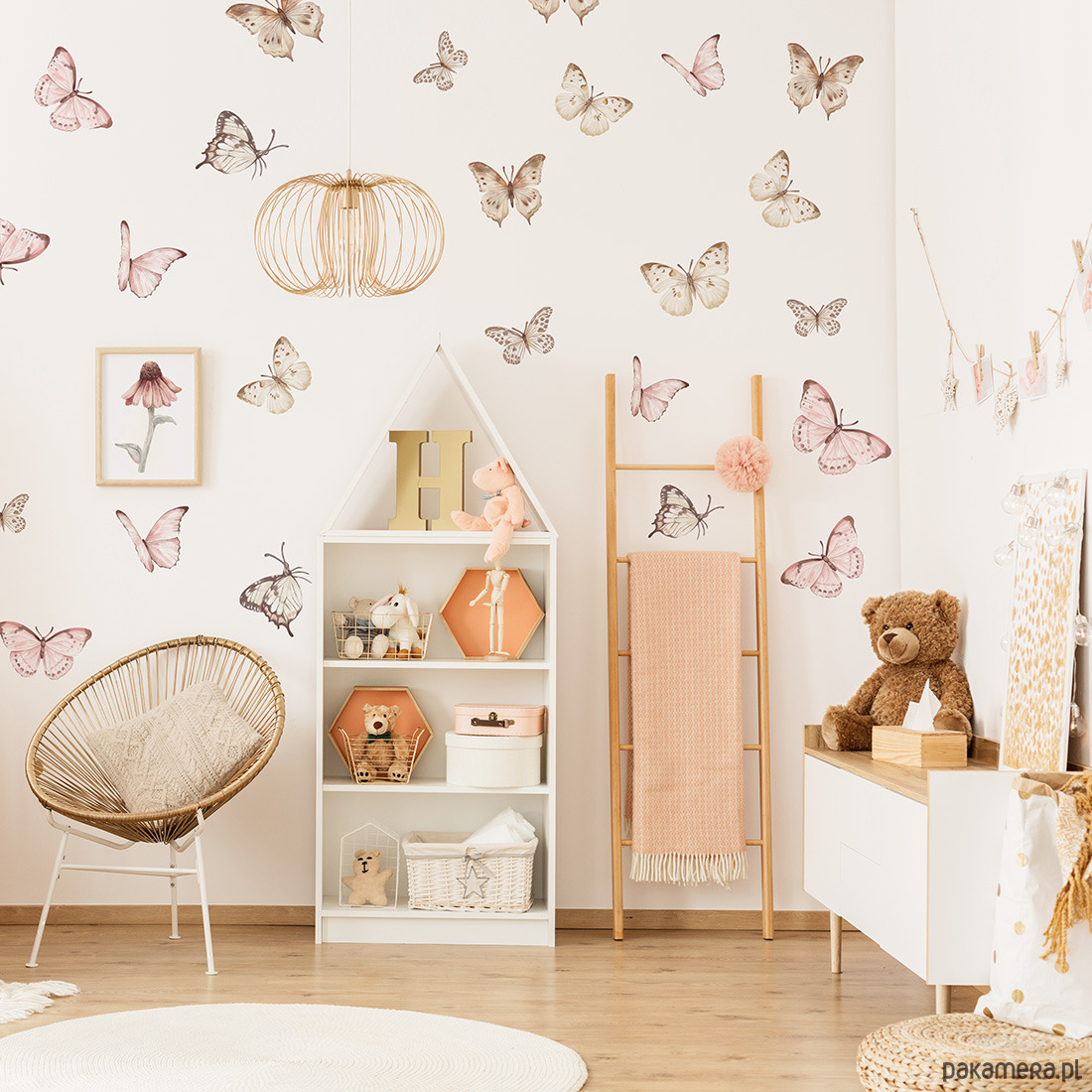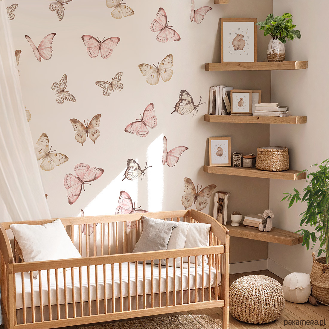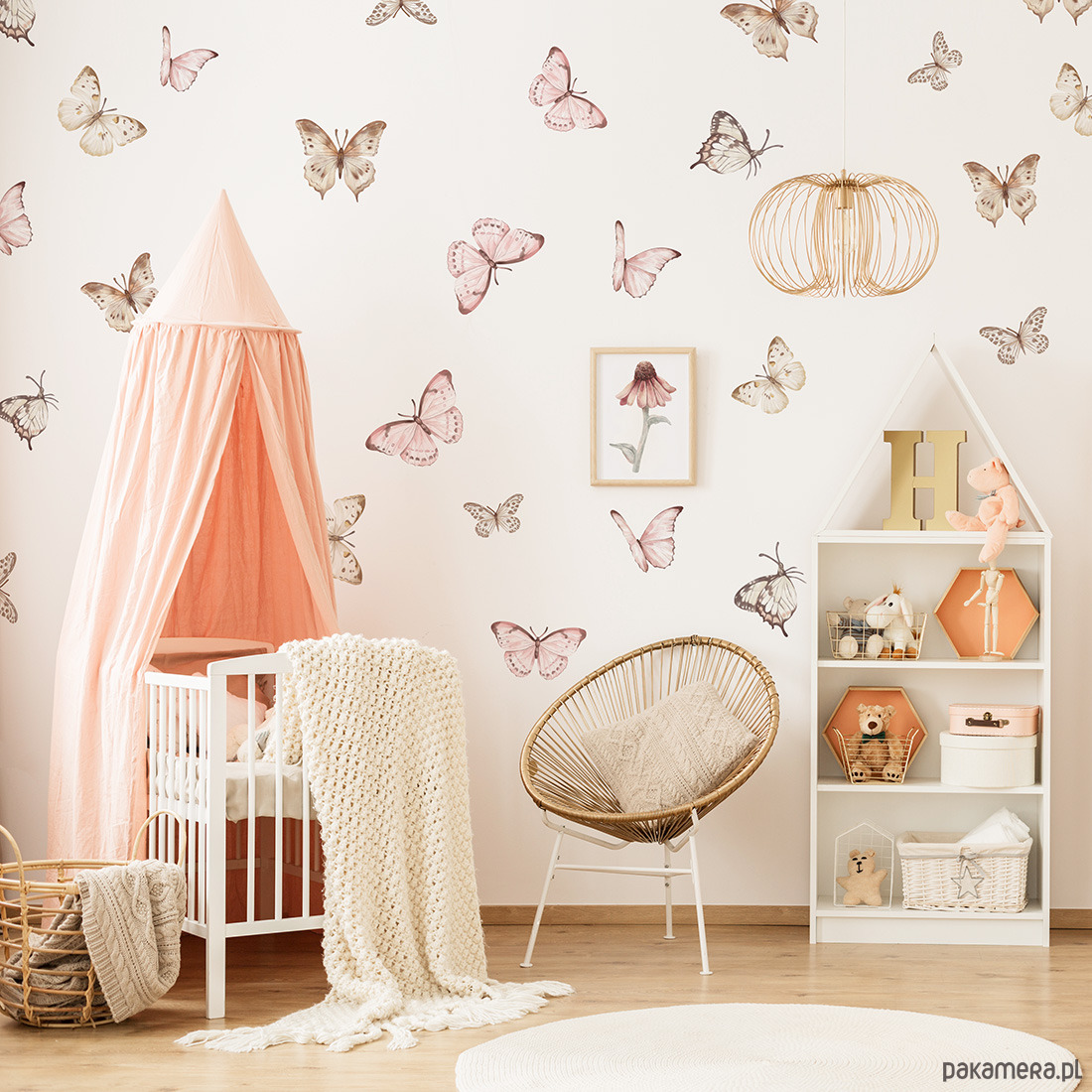 Delikatne naklejki motyle - w odcieniach różu i beżu to ręcznie malowane ilustracje, które dodadzą wnętrzu lekkości i subtelnego uroku.