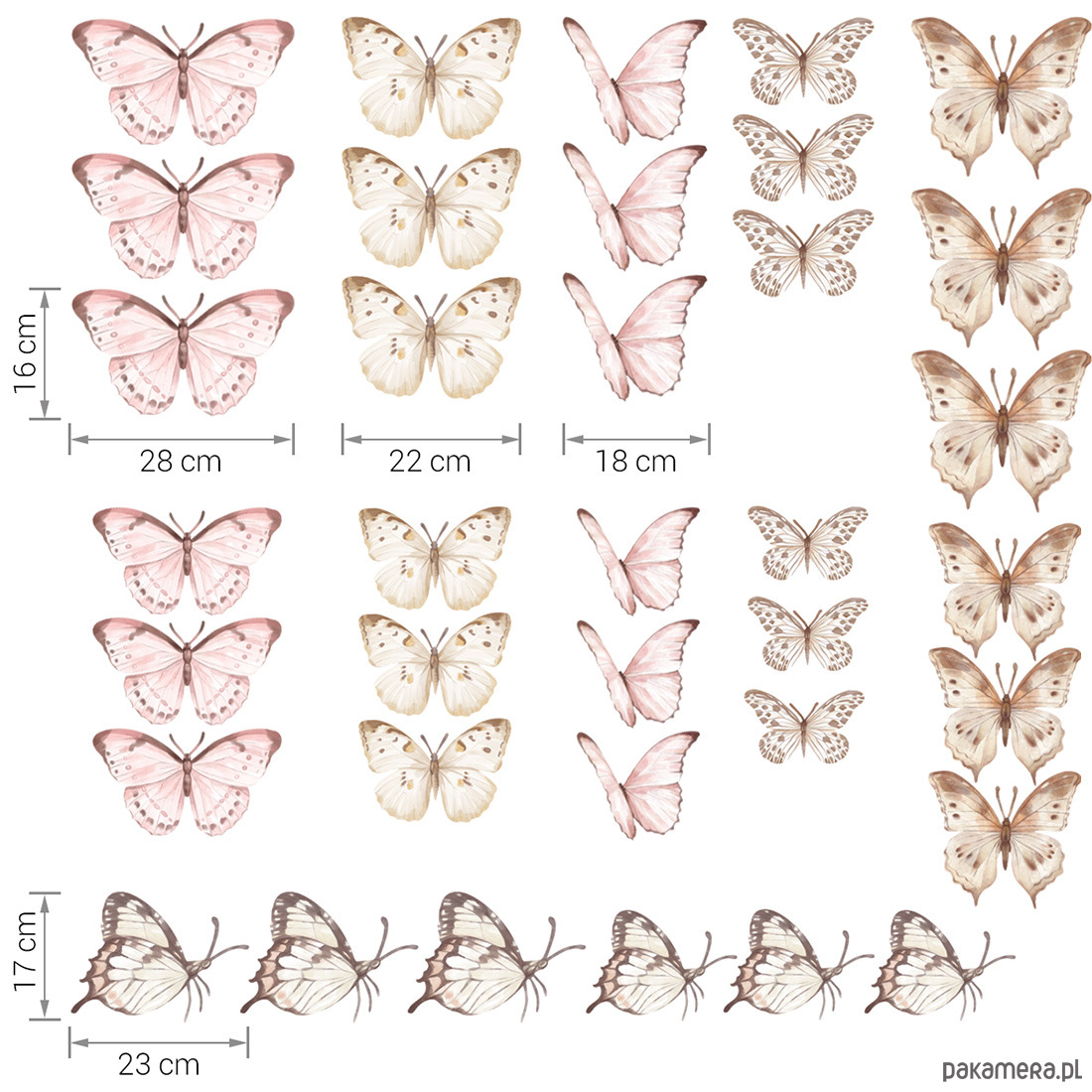 W skład zestawu wchodzi: 36 sztuk motyli o różnym kształcie i wymiarach. Dokładne wymiary podane są na ostatnim zdjęciu.
