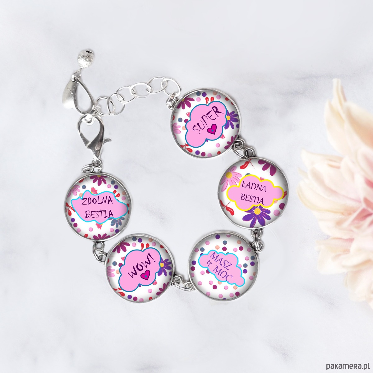 Bransoletka z oryginalną grafiką artystyczną z motywacyjnymi napisami, zatopioną pod wypukłym szkłem, dającym efekt 3D, w oprawie w kolorze srebra.