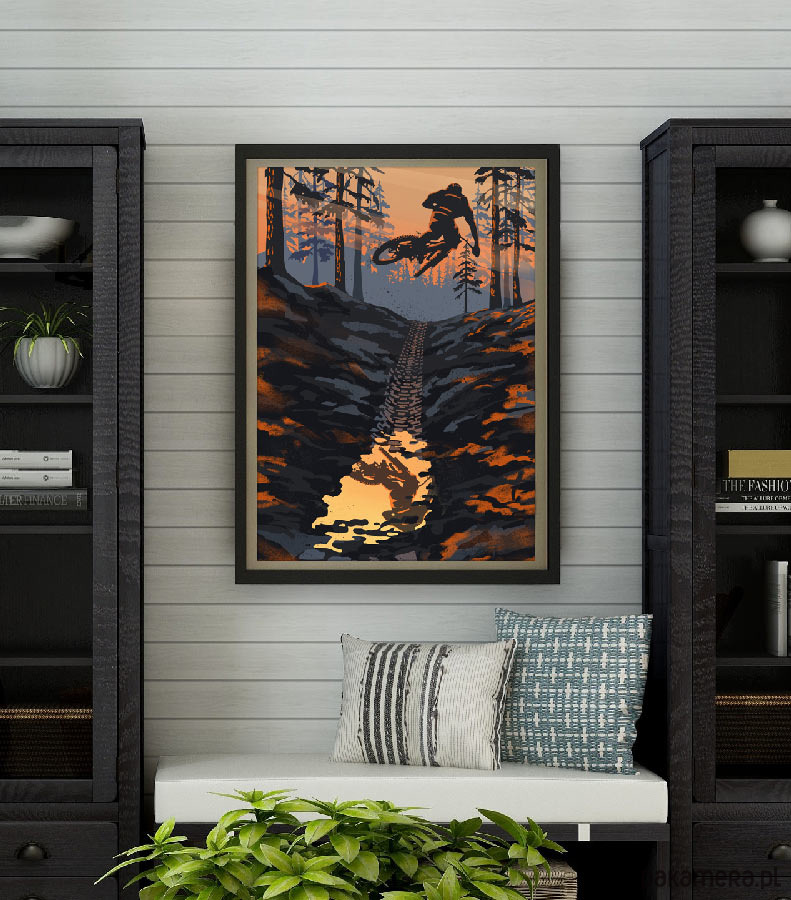 Plakat w stylu vintage inspirowany kolarstwem górskim (MTB). Przedstawia rowerzystę na tle zachodzącego słońca.