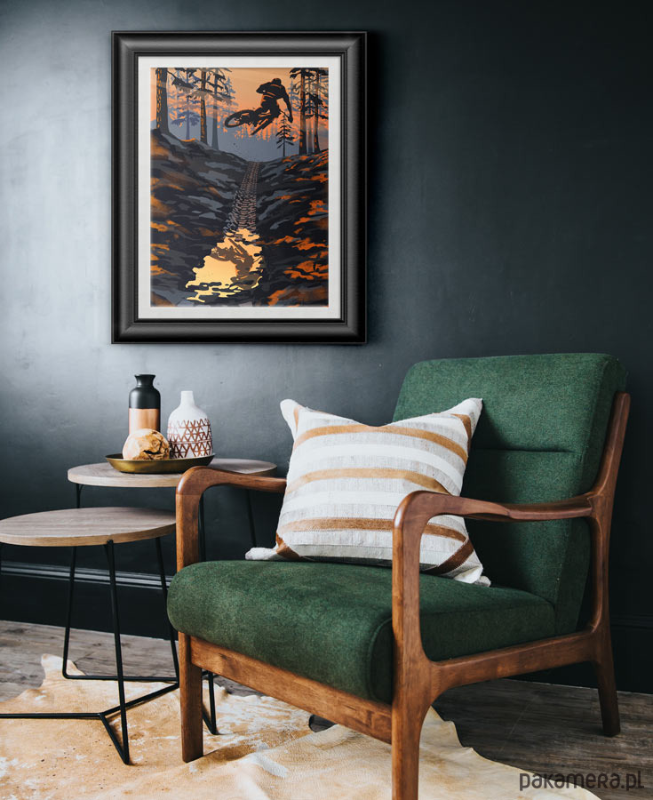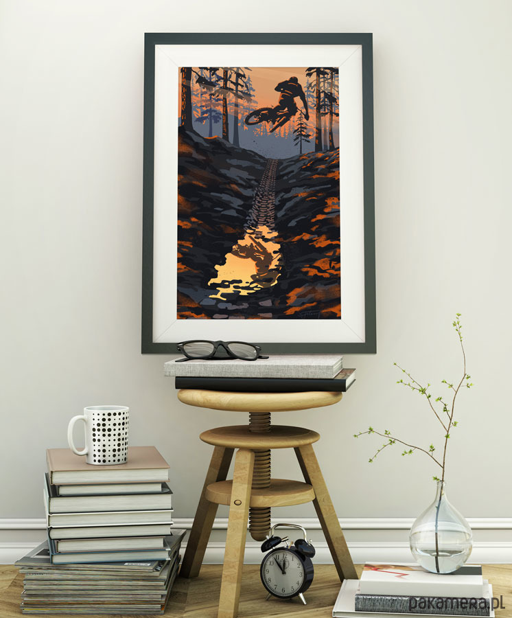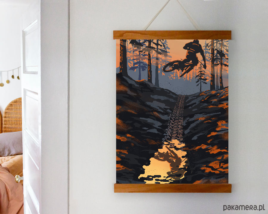 Plakat w stylu vintage inspirowany kolarstwem górskim (MTB). Przedstawia rowerzystę na tle zachodzącego słońca.