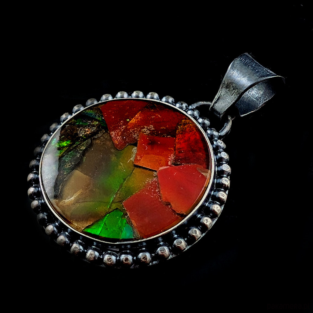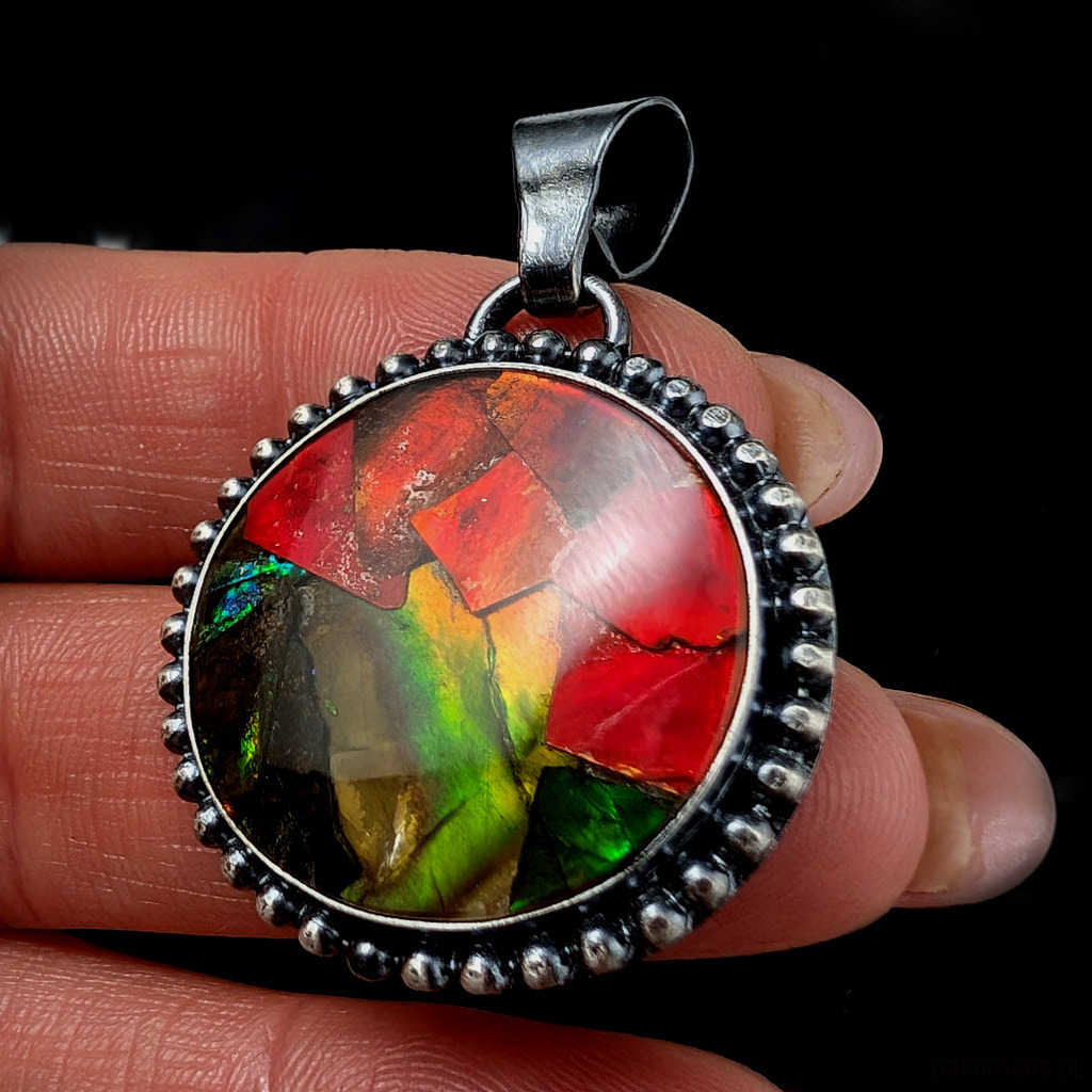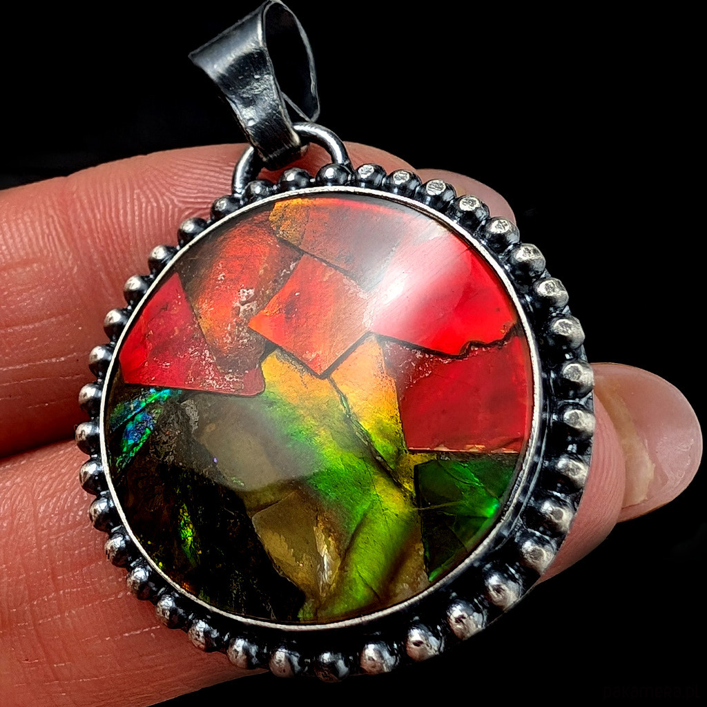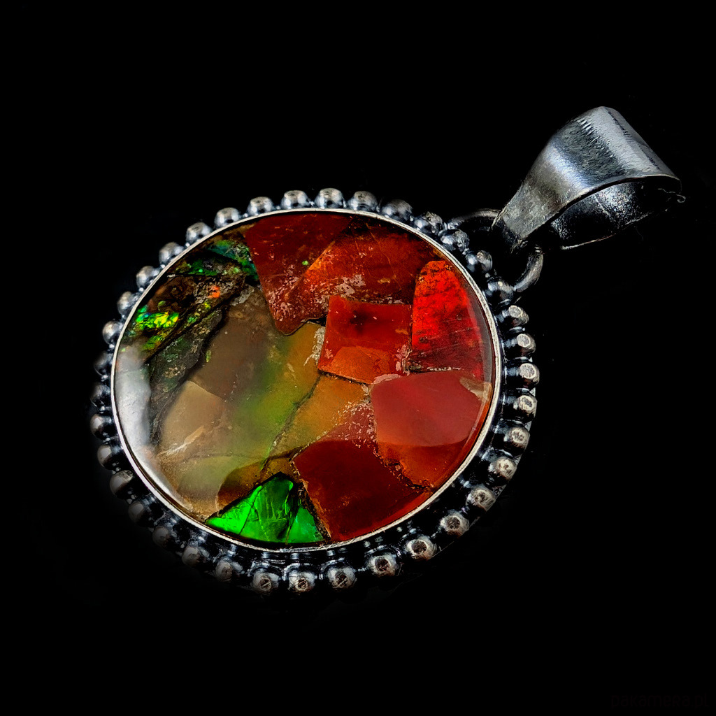 Wisior w stylu "no filter needed". Brak słów, by opisać piękno kamienia. Pięknie wybarwiony wisior z oprawionym w oksydowane srebro próby 925 rzadkim ammolitem- kompozyt ammolitu oraz amonitu z kwarcem. Niesamowite barwy opalizujące w jesiennych odcieniach. Waga 9,7 g. Wymiary oprawy 30 mm. Długość 42 mm. Zapakowany w odobne pudłeczko.