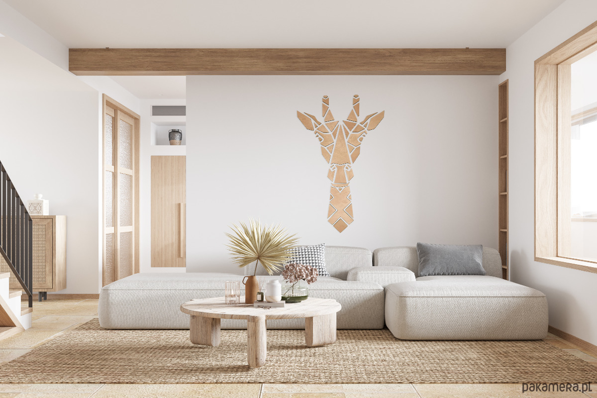 Mozaika drewniana przedstawiająca żyrafę w wersji geometrycznej. W przesyłce znajdą Państwo szablon do przyklejenia mozaiki na ścianie.