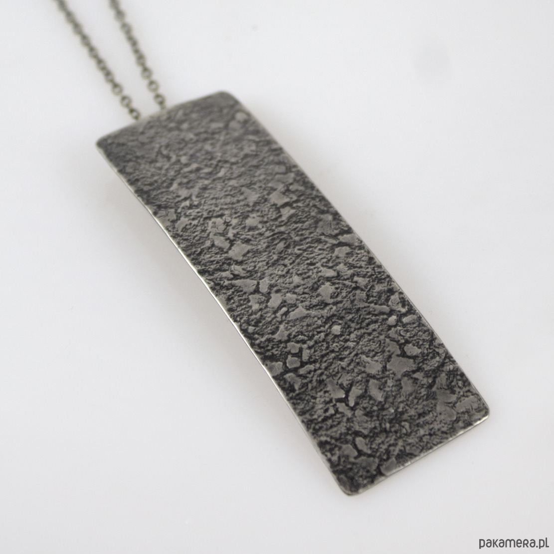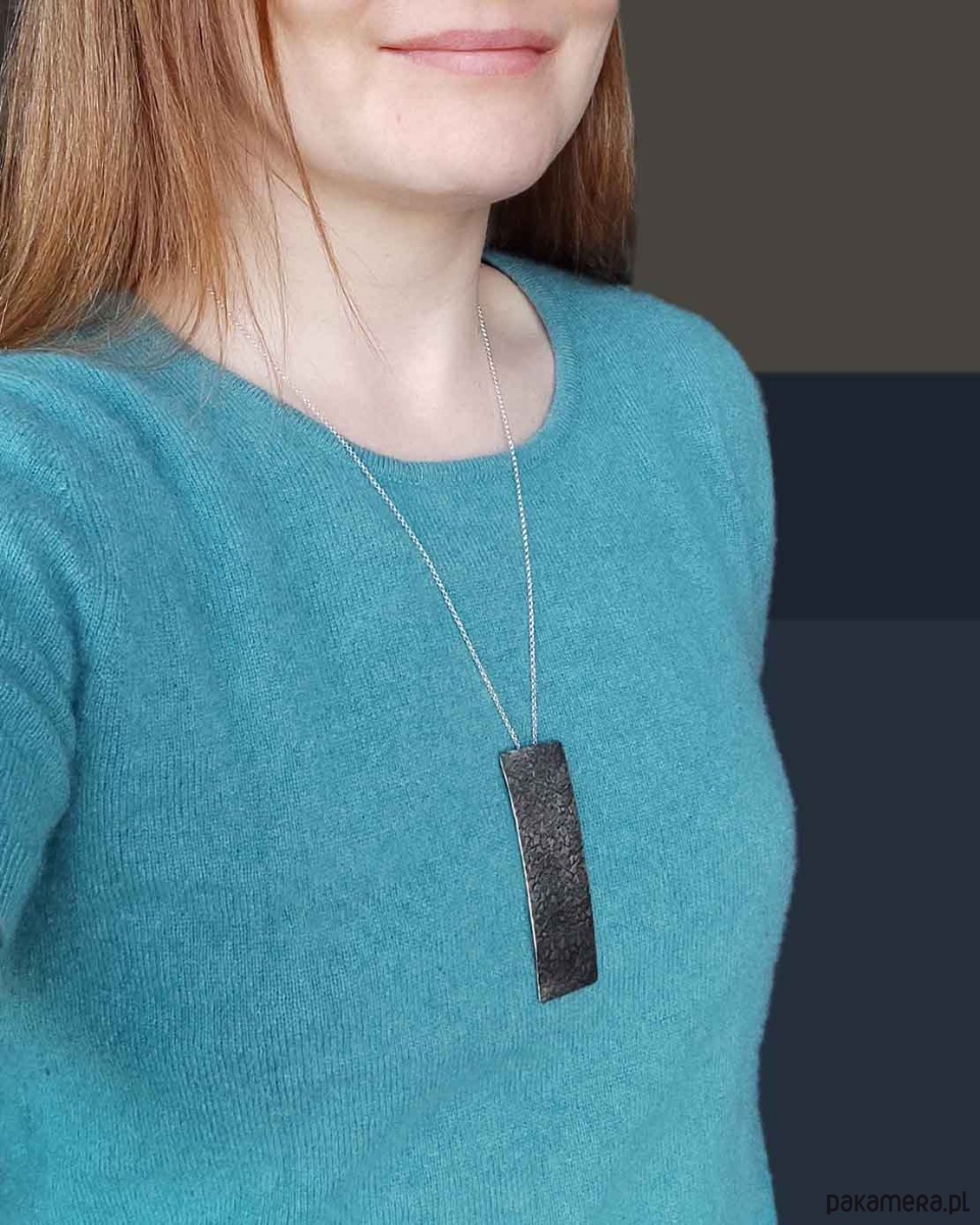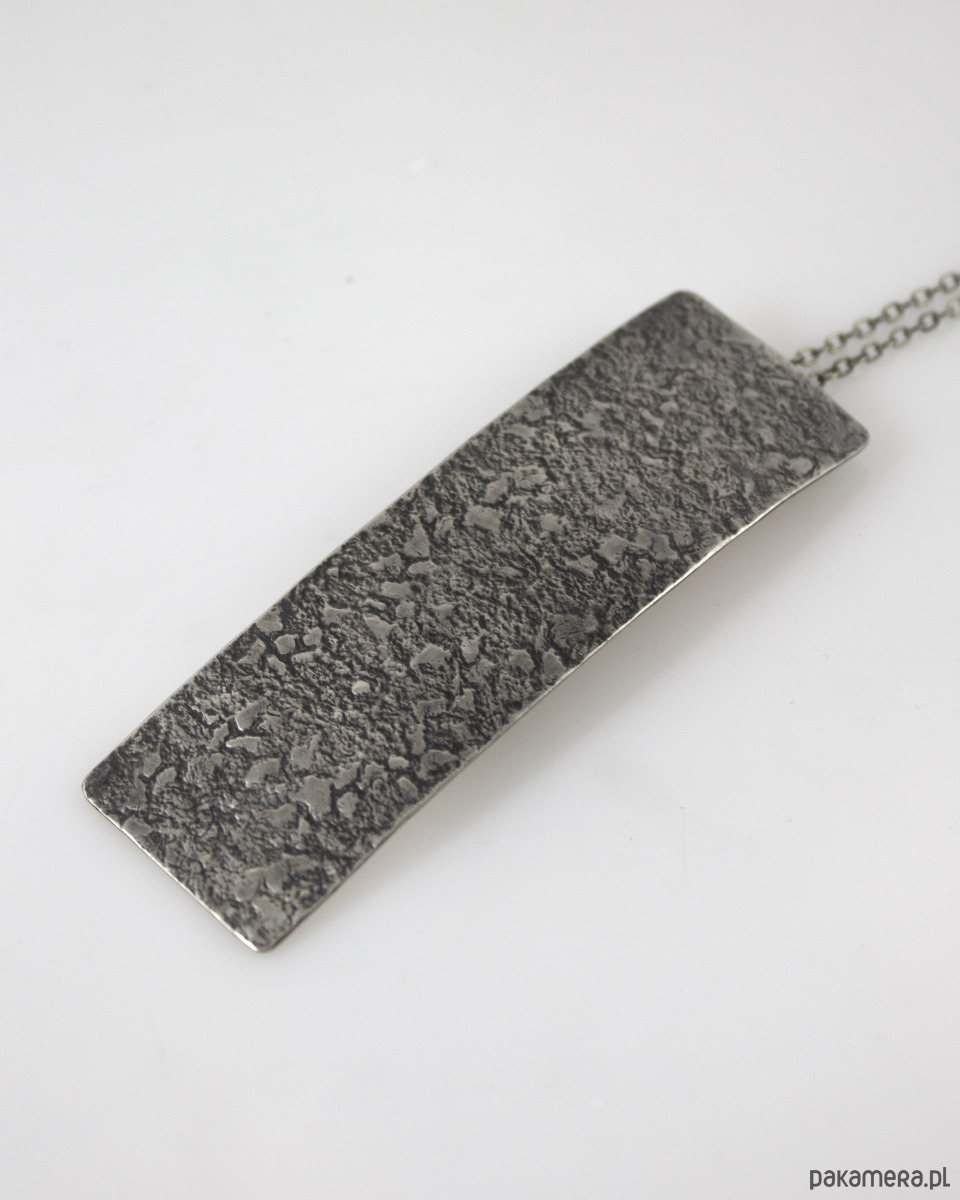 Wisior został wykonany ręcznie z metalu w kolorze zbliżonym do srebra, ma nieregularną fakturę i jest lekko patynowany w procesie oksydacji (bez użycia sztucznych barwników). Całkowita długość wisiorka to ok 8 cm. W komplecie łańcuszek do zawieszenia w dopasowanym kolorze.