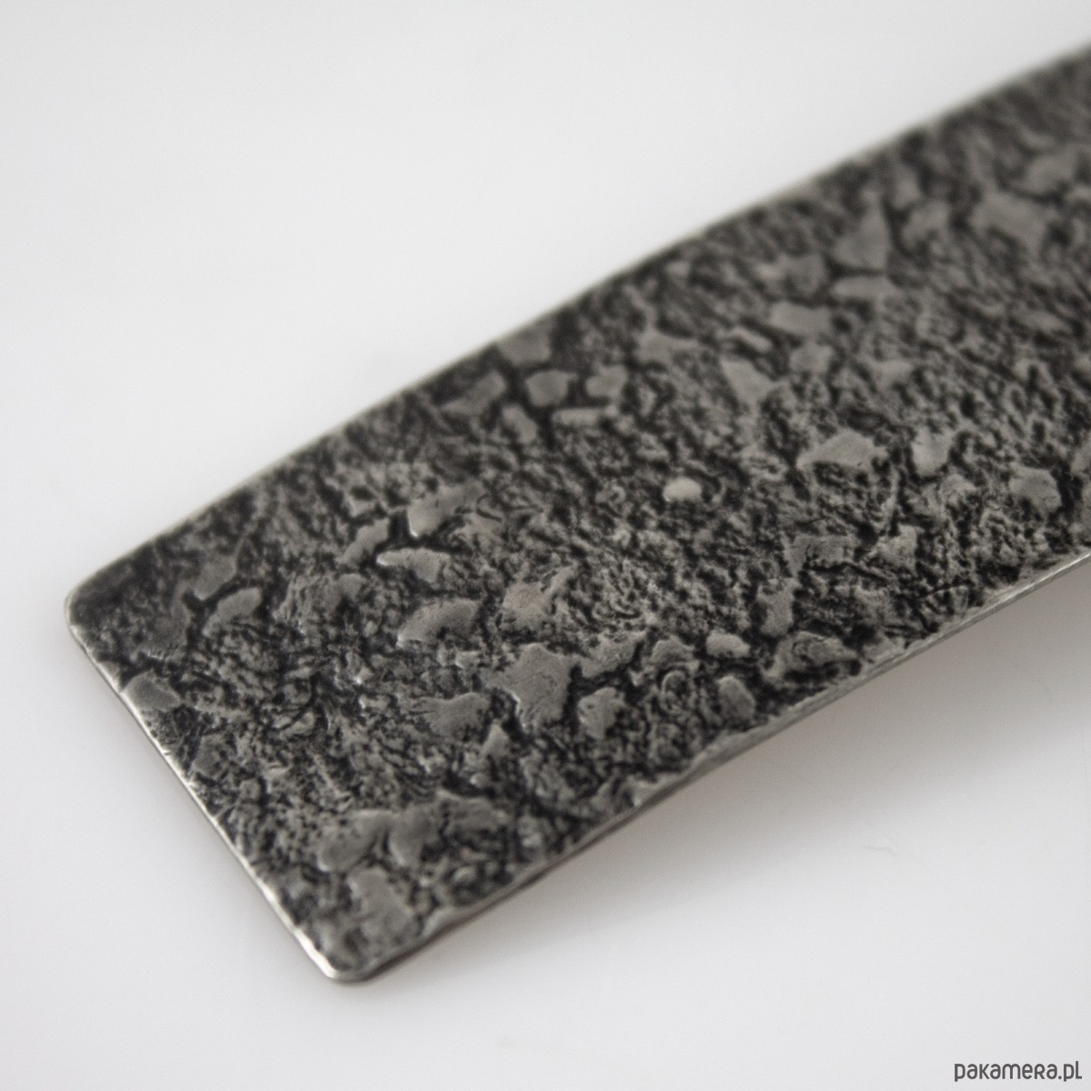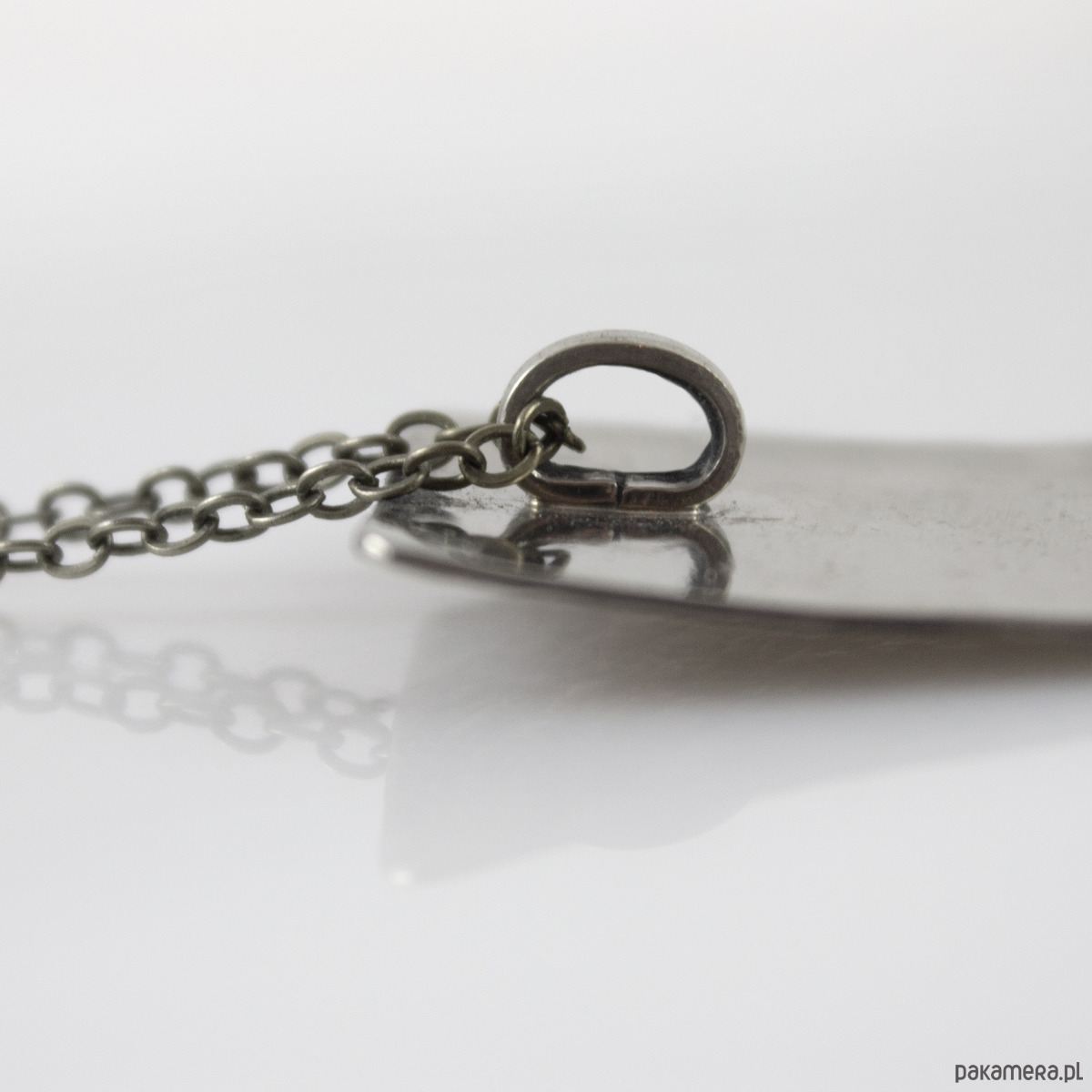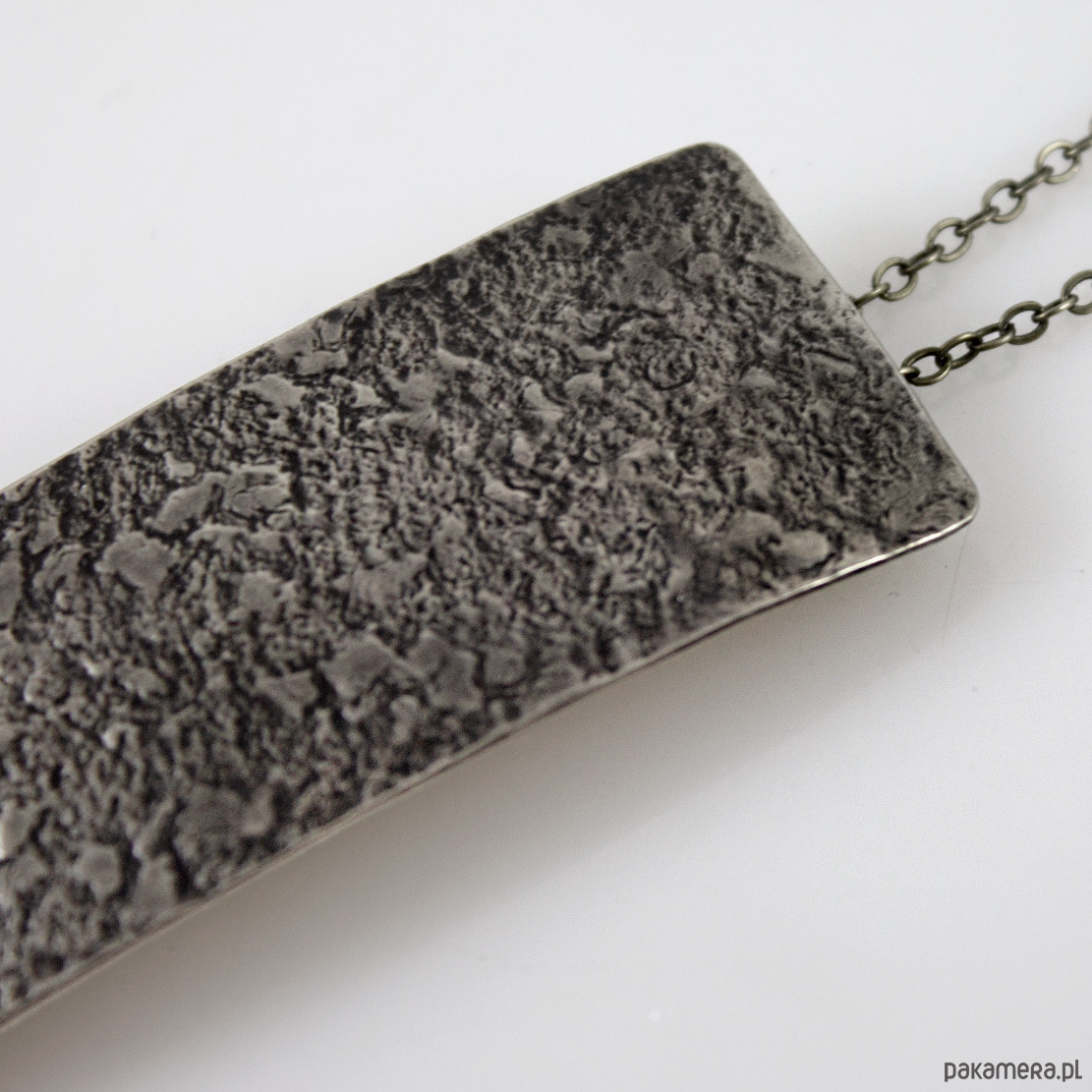 Wisior został wykonany ręcznie z metalu w kolorze zbliżonym do srebra, ma nieregularną fakturę i jest lekko patynowany w procesie oksydacji (bez użycia sztucznych barwników). Całkowita długość wisiorka to ok 8 cm. W komplecie łańcuszek do zawieszenia w dopasowanym kolorze.