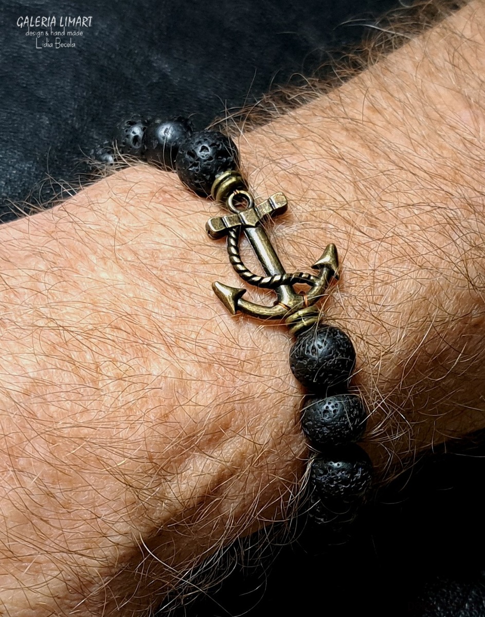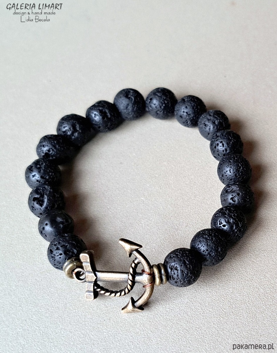 Efektowna bransoletka z kulek (10 mm) lawy wulkanicznej ozdobionej efektowną kotwicą z mosiądzu. Na elastycznym nośniku, co bardzo ułatwia wkładanie i noszenie bransoletki.