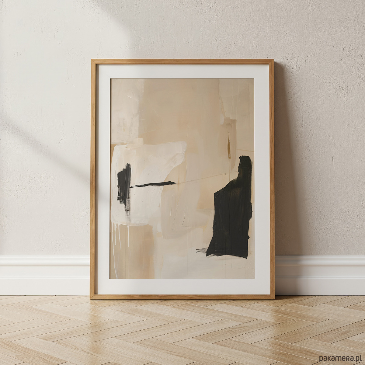Minimalistyczny plakat abstrakcyjny utrzymany w eleganckiej, neutralnej palecie beżu, piasku, ciepłej szarości i kontrastowej czerni. Kompozycja oparta na geometrycznych podziałach, wyważonych plamach koloru oraz subtelnych, dynamicznych liniach nadaje całości nowoczesny, architektoniczny charakter.