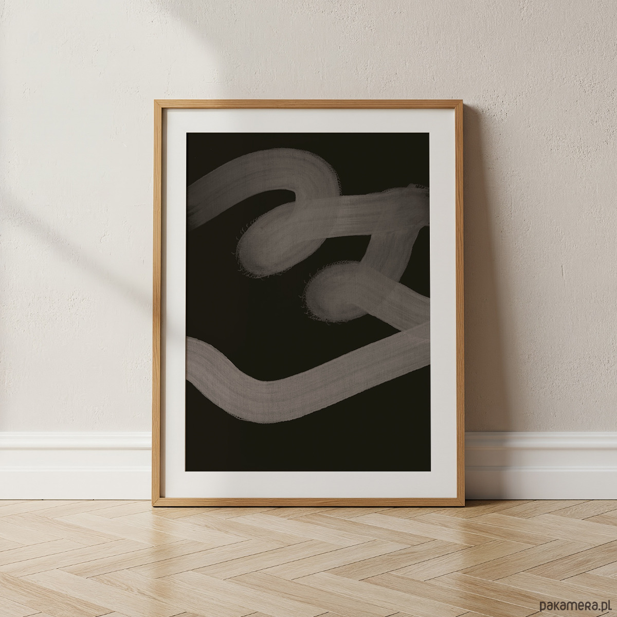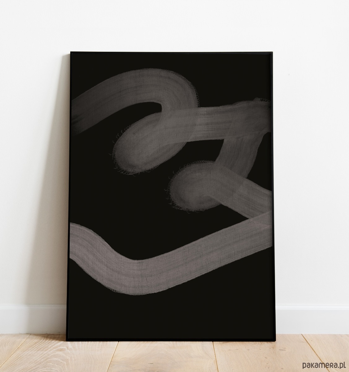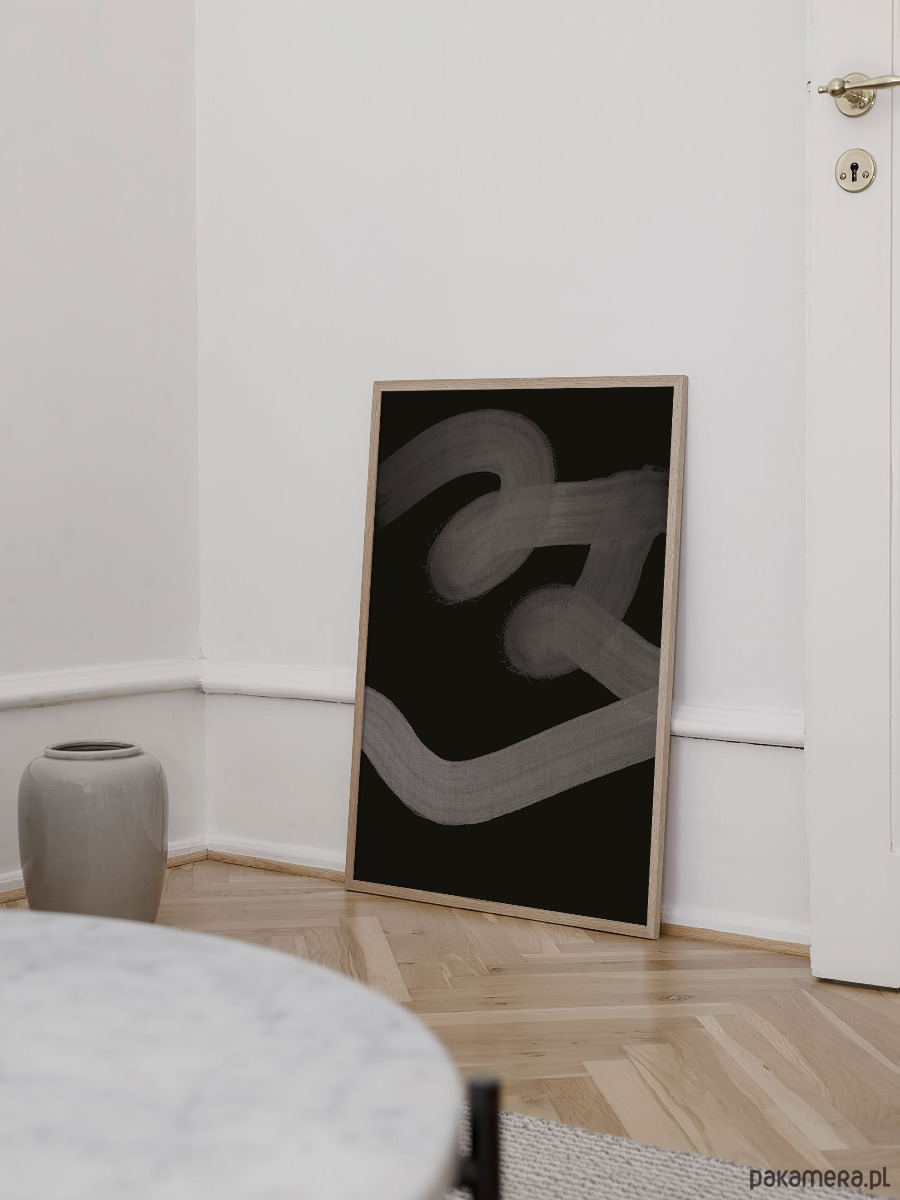 Minimalistyczny plakat abstrakcyjny w kontrastowej kolorystyce czerni i szarości. Proste, organiczne formy i ręcznie prowadzona linia tworzą nowoczesną, spokojną kompozycję, która dobrze uzupełnia współczesne wnętrza.