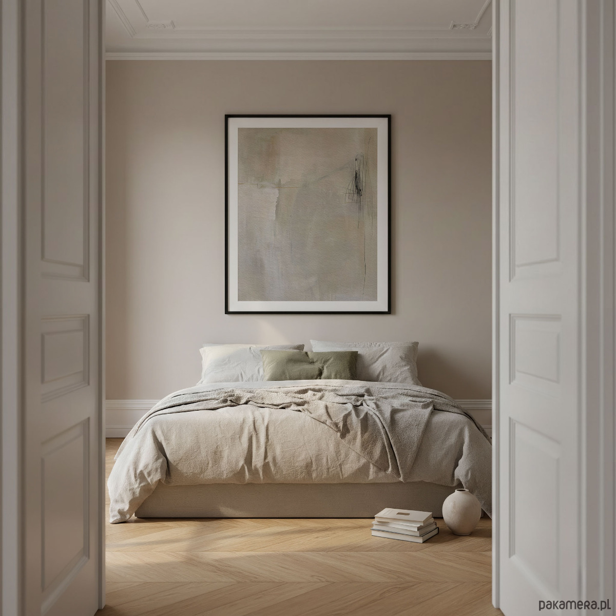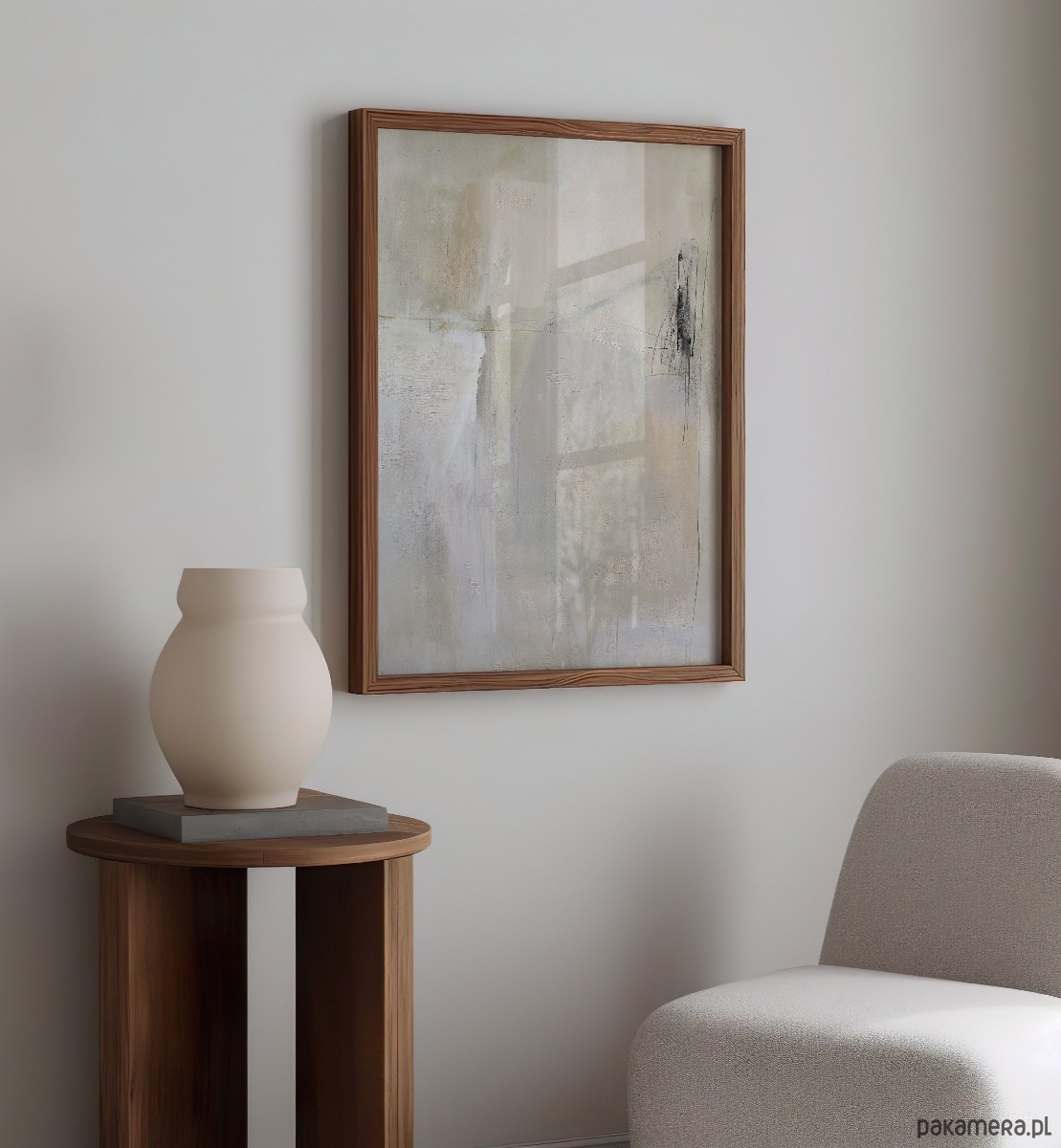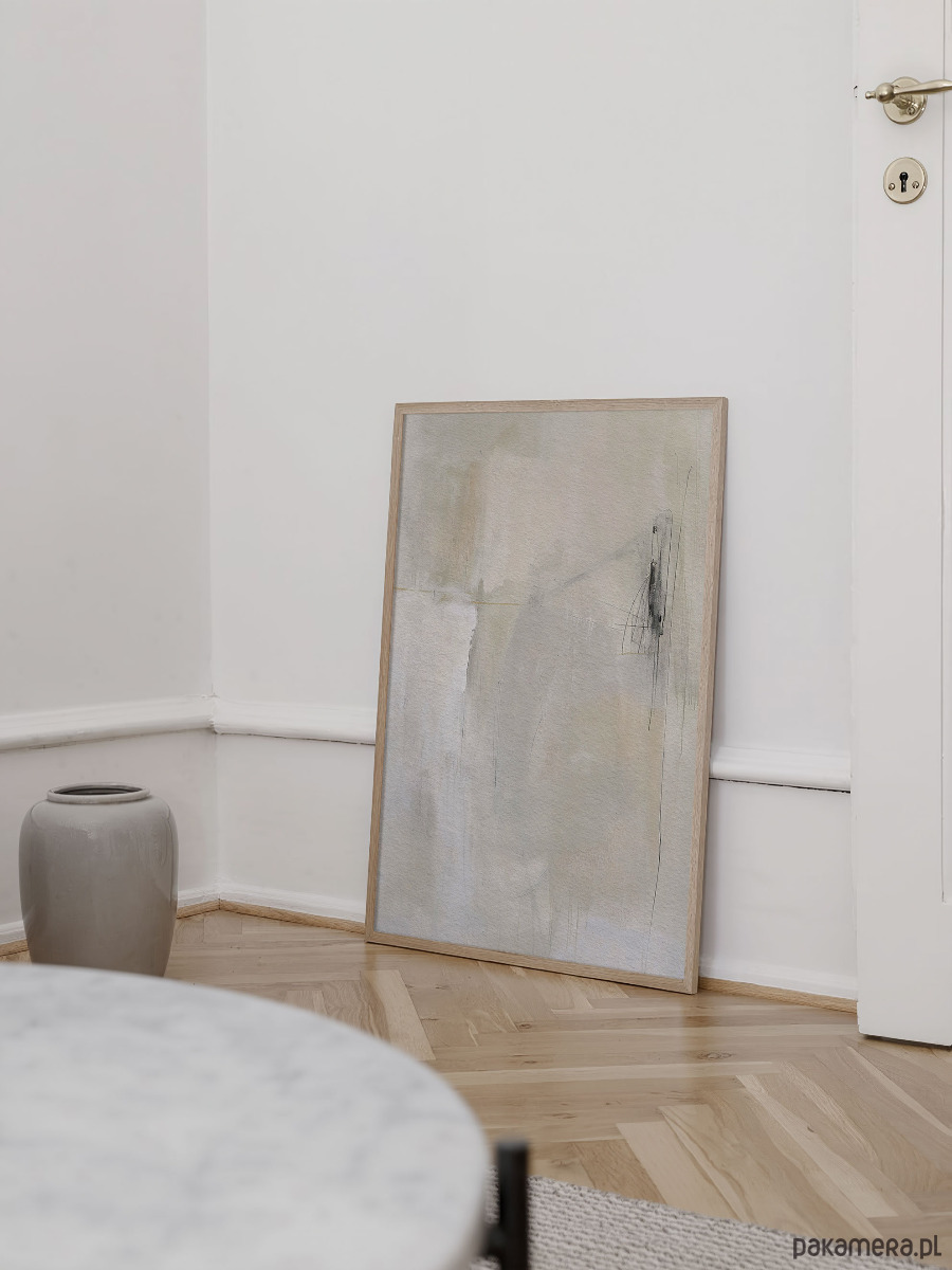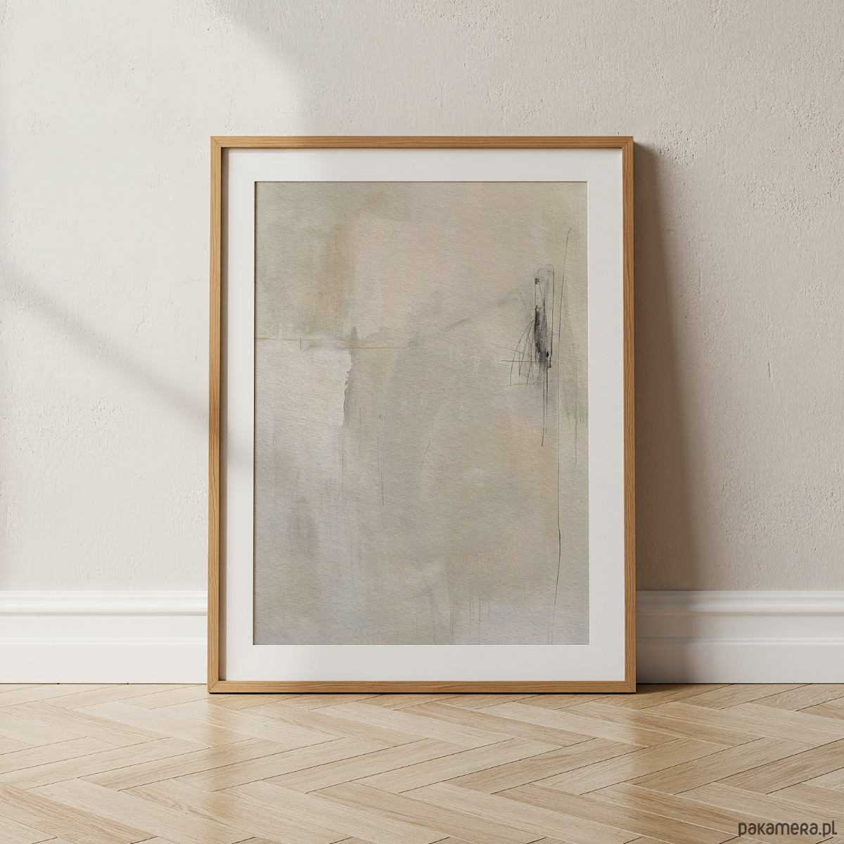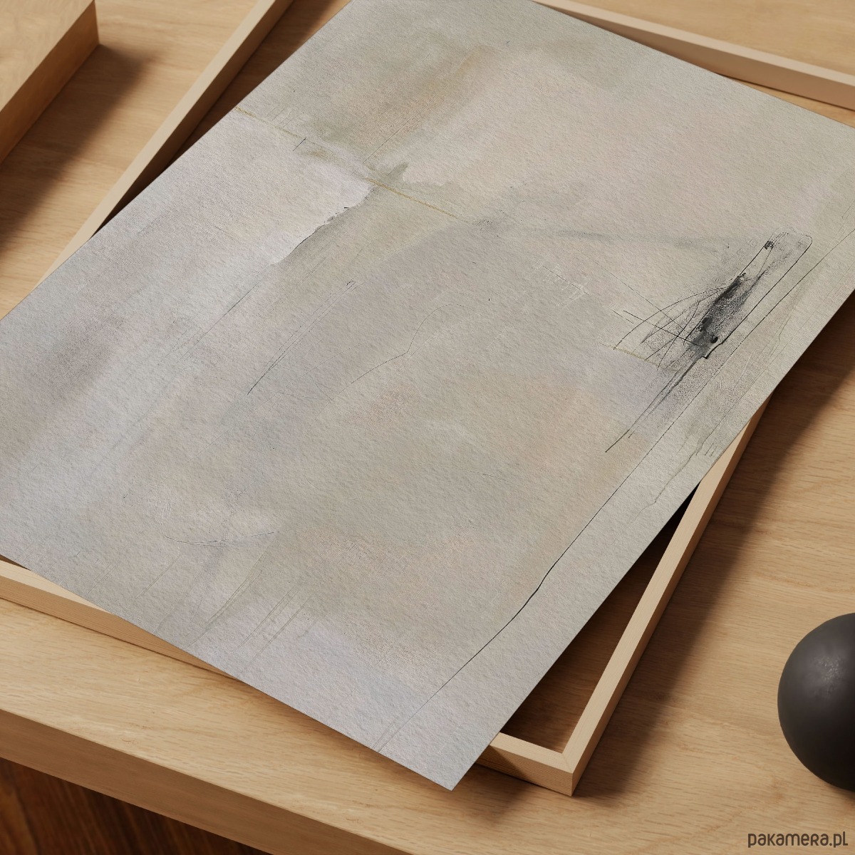Minimalistyczny plakat abstrakcyjny utrzymany w bardzo delikatnej, neutralnej palecie barw. Miękkie przejścia tonalne w odcieniach ciepłego beżu, złamanej szarości i subtelnych, pastelowych akcentów tworzą spokojną, wyciszoną kompozycję o niemal akwarelowym charakterze.
