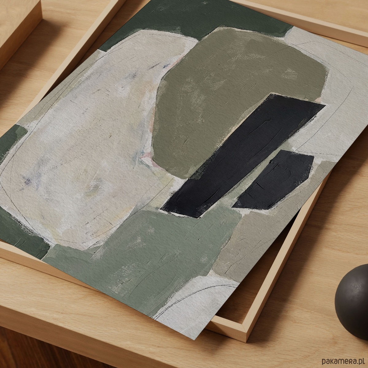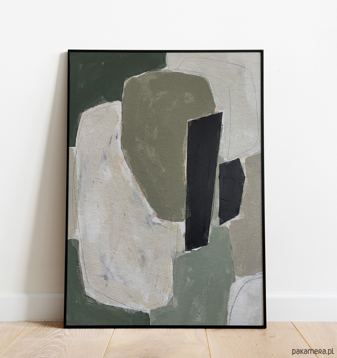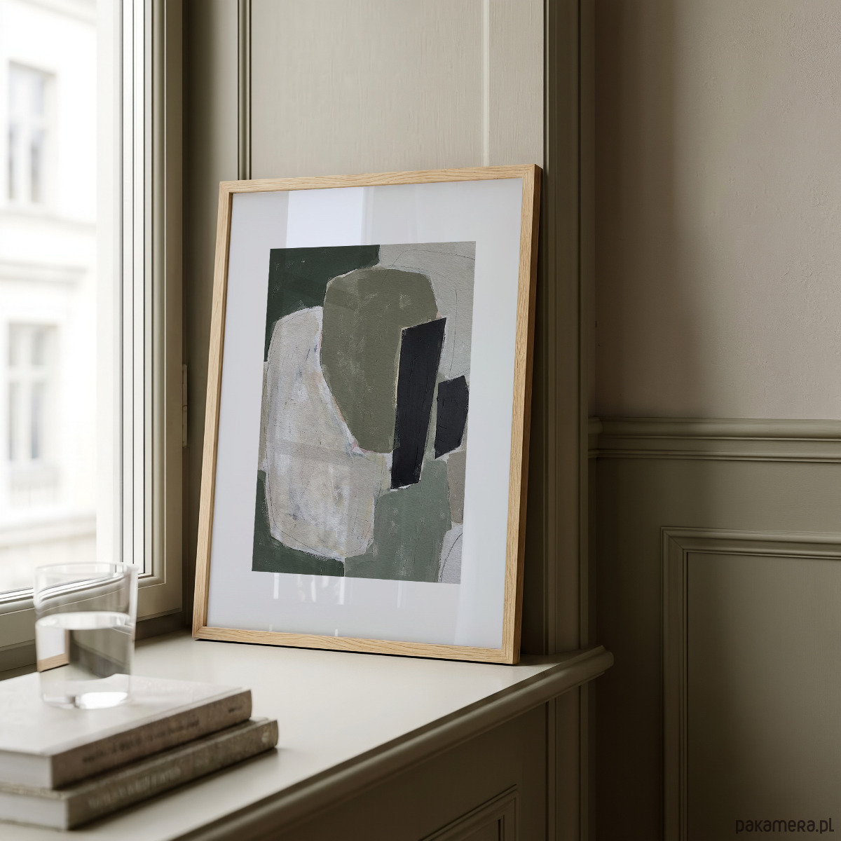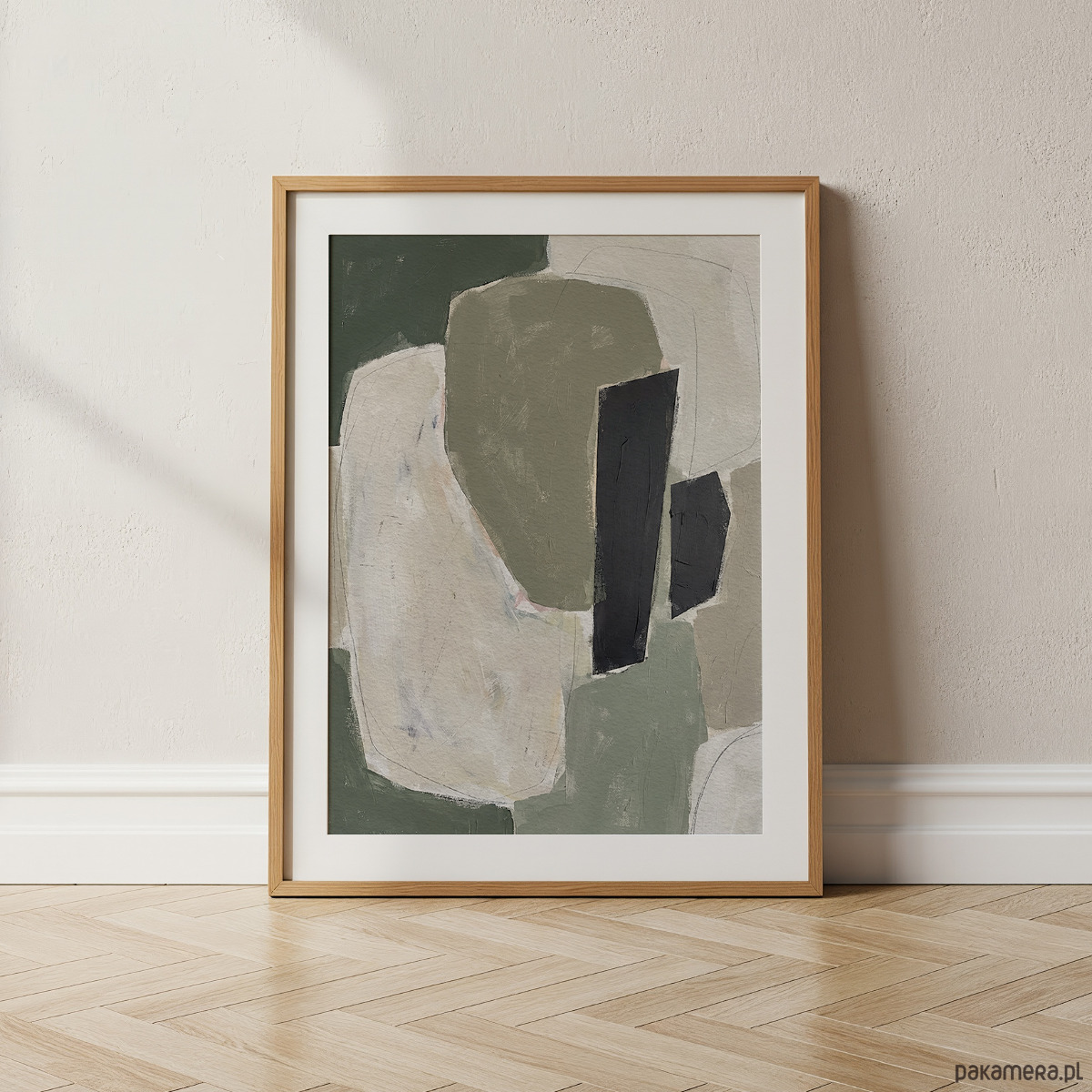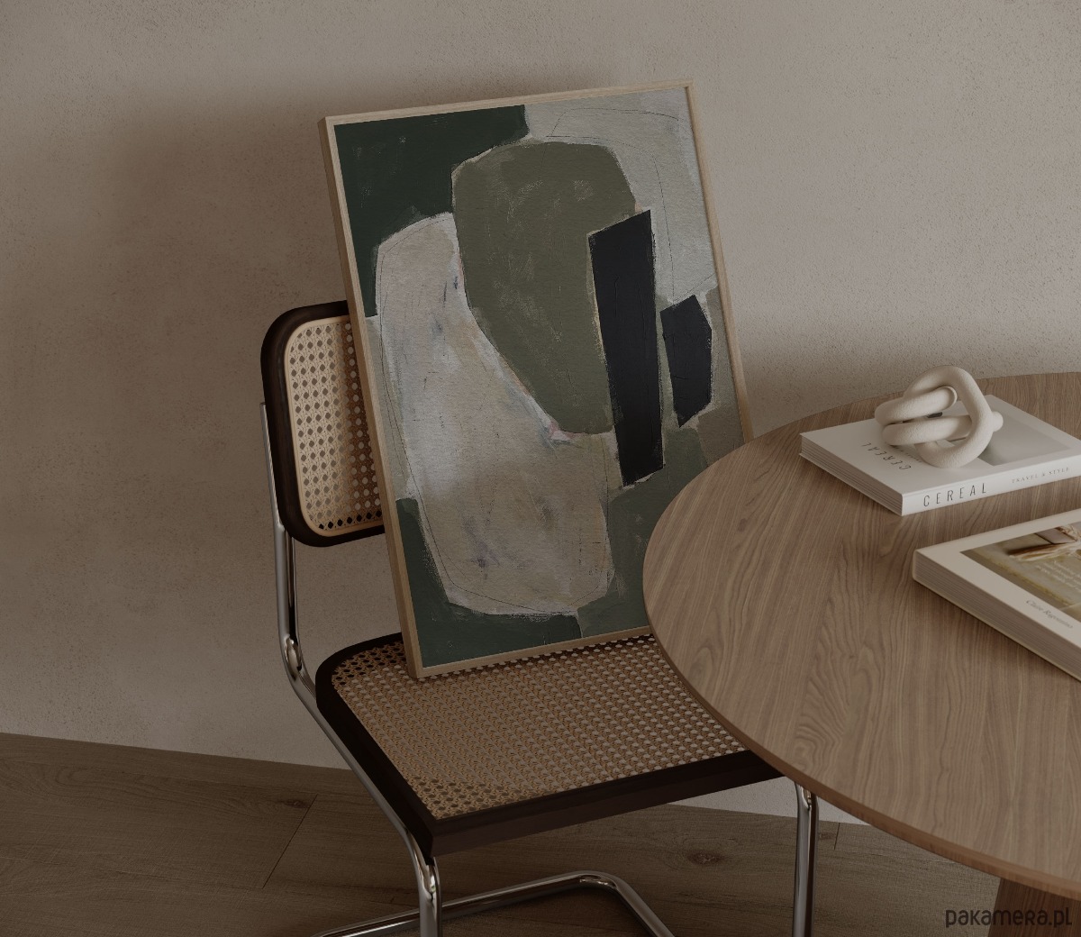 Zgaszone odcienie zieleni, beżu i ciepłej szarości nadają grafice elegancki, ponadczasowy charakter. Plakat doskonale wpisuje się w estetykę wnętrz minimalistycznych, japandi, skandynawskich oraz nowoczesnych przestrzeni mieszkalnych i komercyjnych.