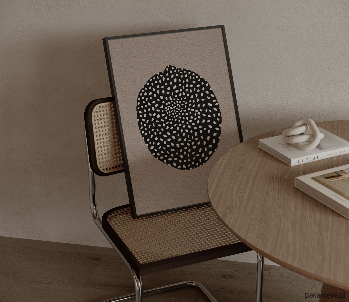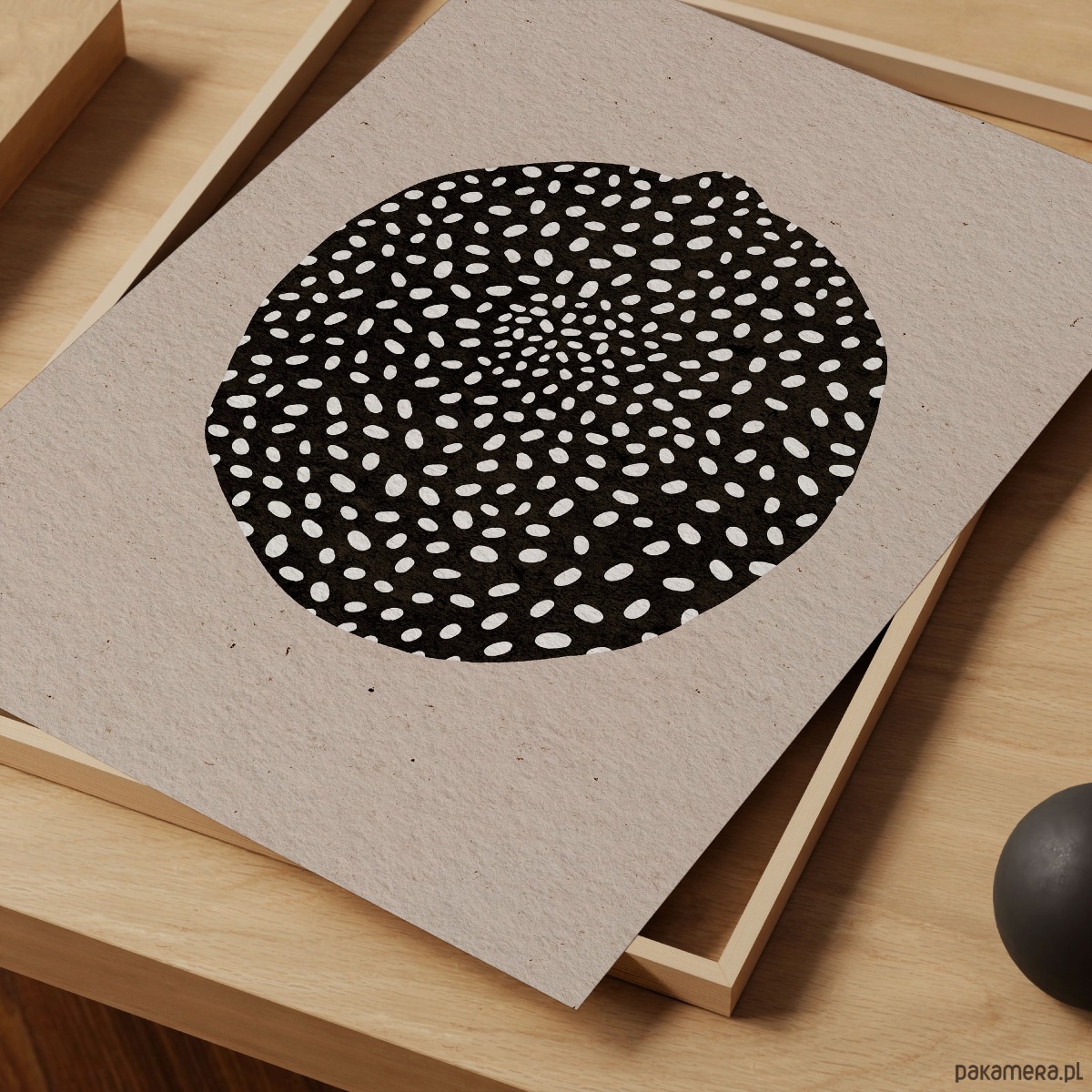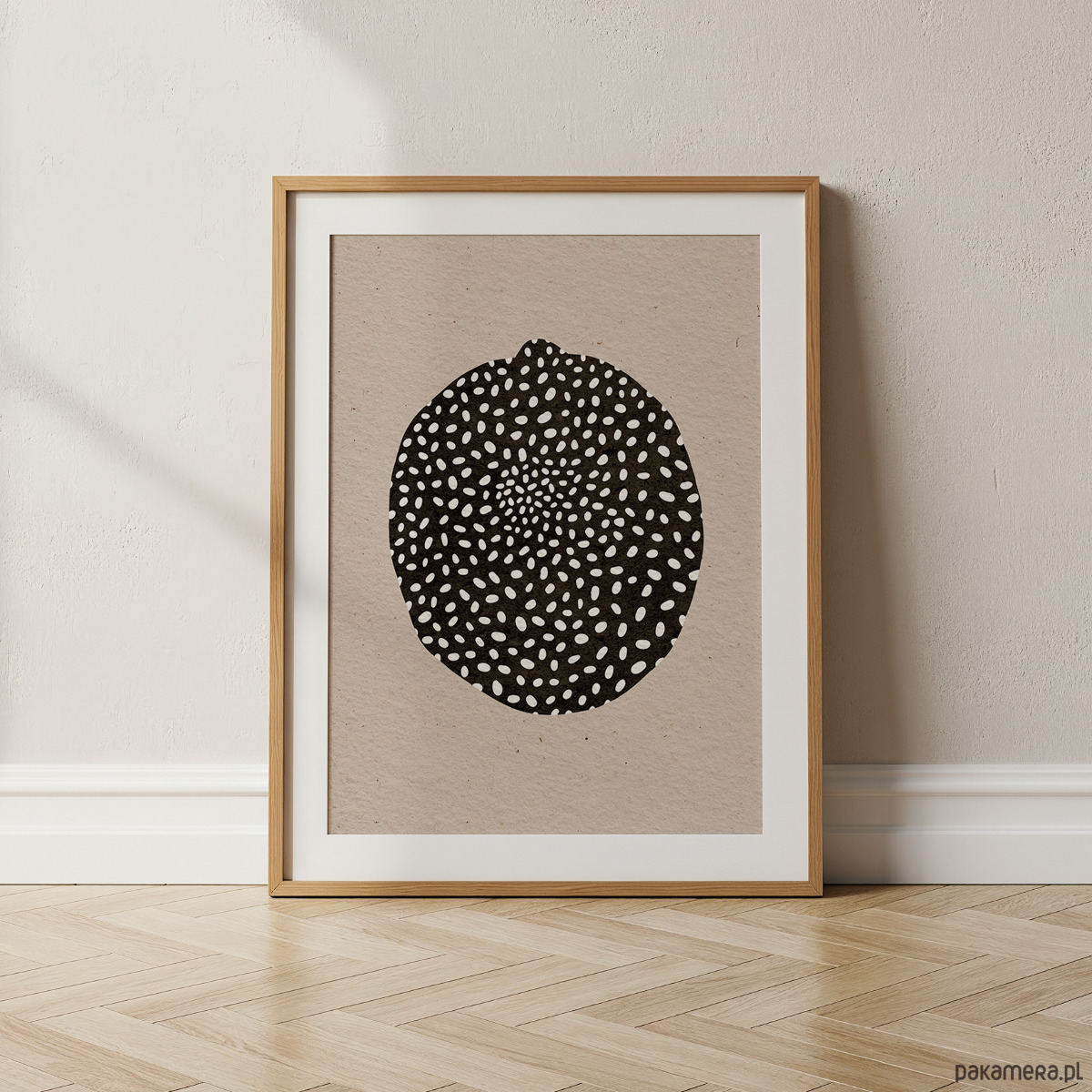 Minimalistyczny plakat abstrakcyjny z centralnym, organicznym motywem w kontrastowej czerni na ciepłym, beżowym tle. Prosta forma i rytmiczny wzór sprawiają, że grafika jest wyrazista, a jednocześnie łatwa do dopasowania do różnych wnętrz.