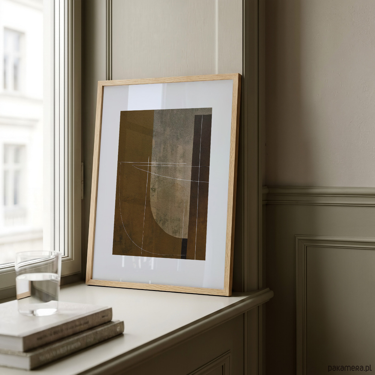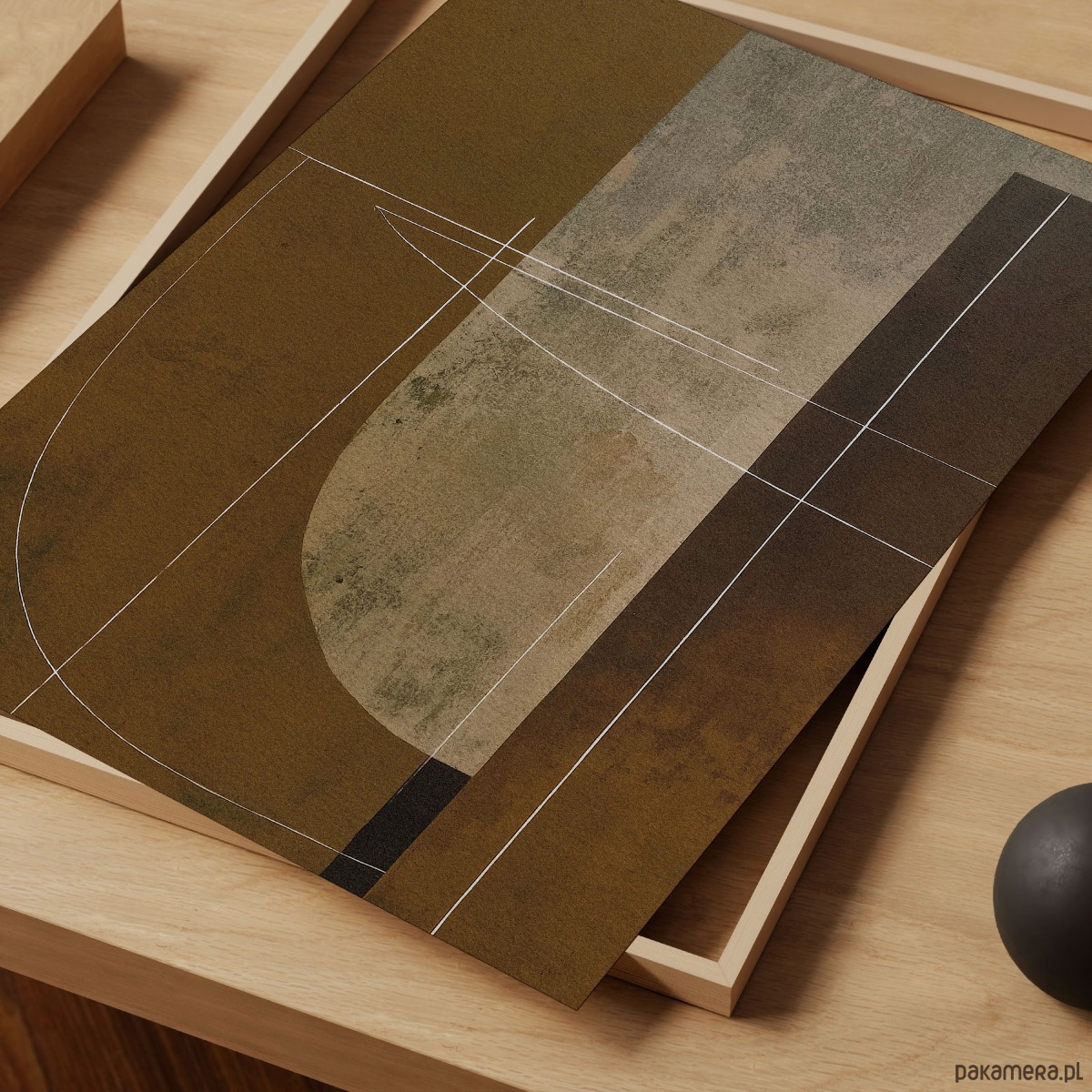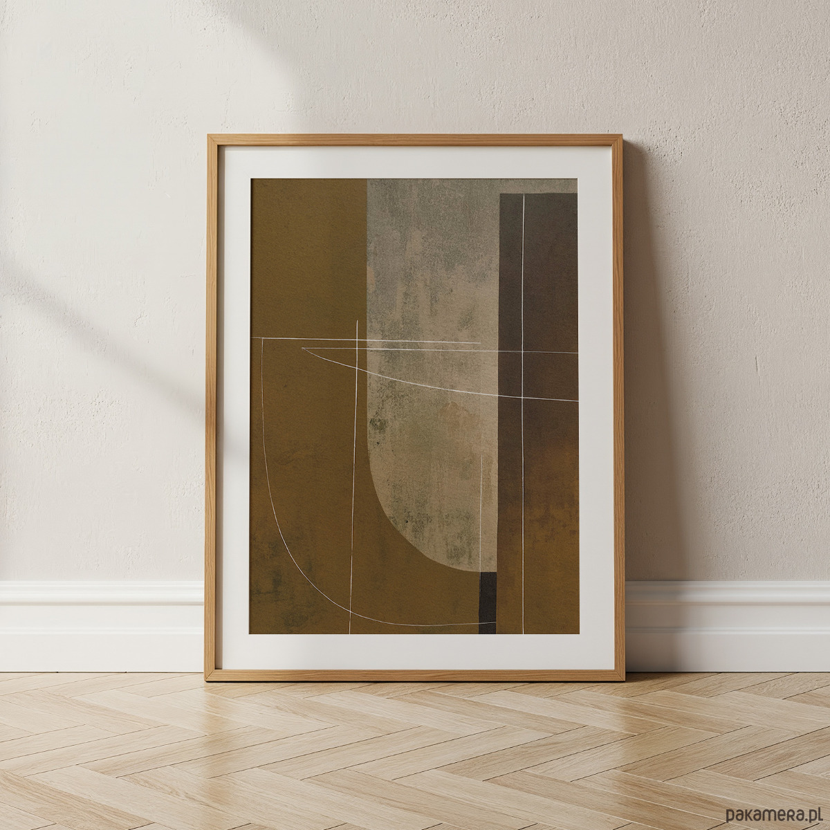 Minimalistyczny plakat abstrakcyjny utrzymany w głębokiej, ziemistej palecie barw. Kompozycja oparta jest na organicznych kształtach, geometrycznych podziałach oraz subtelnych, cienkich liniach, które wprowadzają rytm i spokojną dynamikę. Stonowane odcienie oliwkowej zieleni, brązu, beżu i grafitu tworzą harmonijną całość inspirowaną naturą, architekturą i nowoczesnym designem wnętrz.