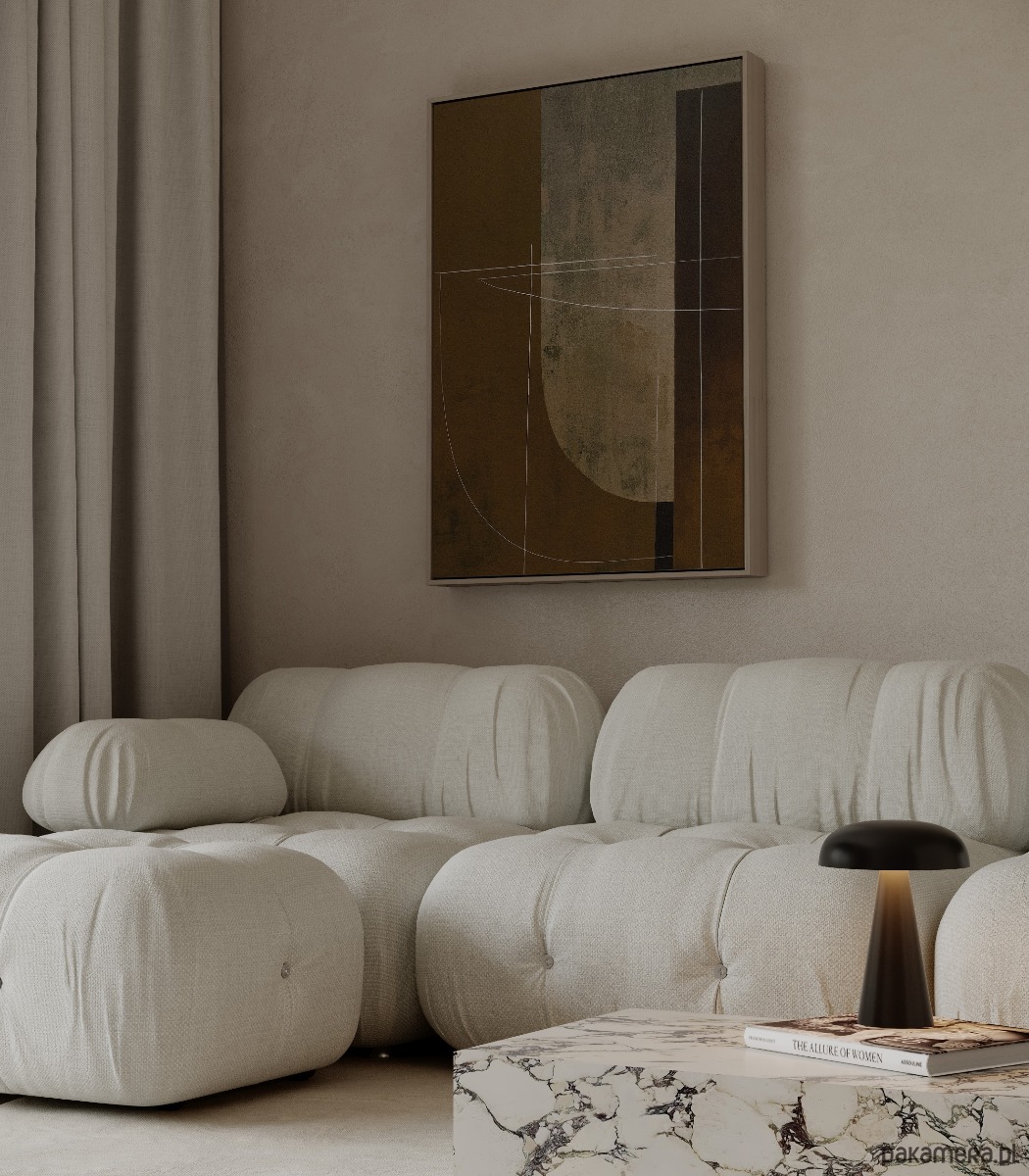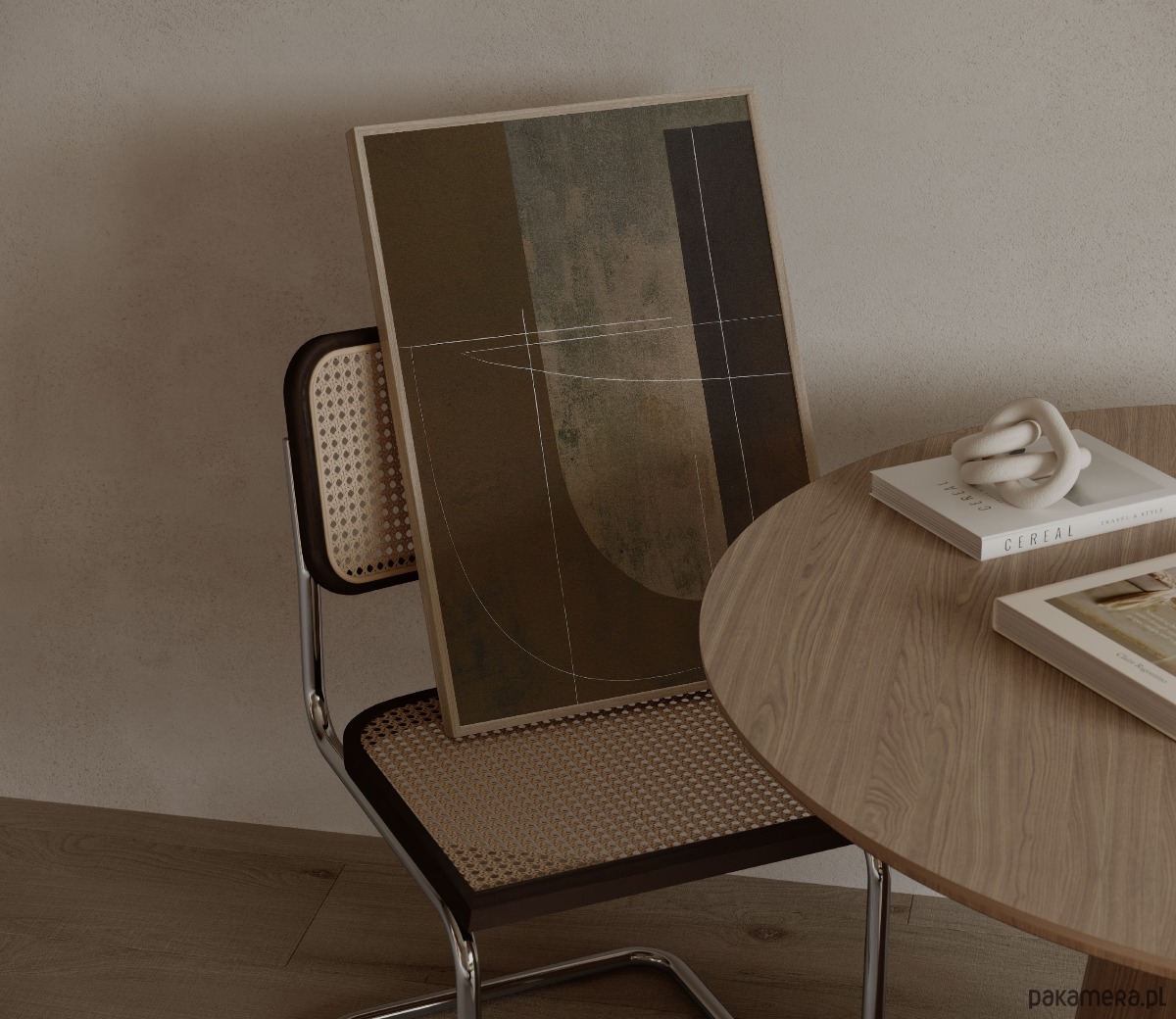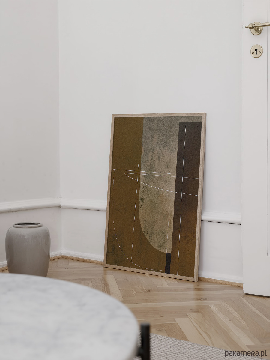 Minimalistyczny plakat abstrakcyjny utrzymany w głębokiej, ziemistej palecie barw. Kompozycja oparta jest na organicznych kształtach, geometrycznych podziałach oraz subtelnych, cienkich liniach, które wprowadzają rytm i spokojną dynamikę. Stonowane odcienie oliwkowej zieleni, brązu, beżu i grafitu tworzą harmonijną całość inspirowaną naturą, architekturą i nowoczesnym designem wnętrz.