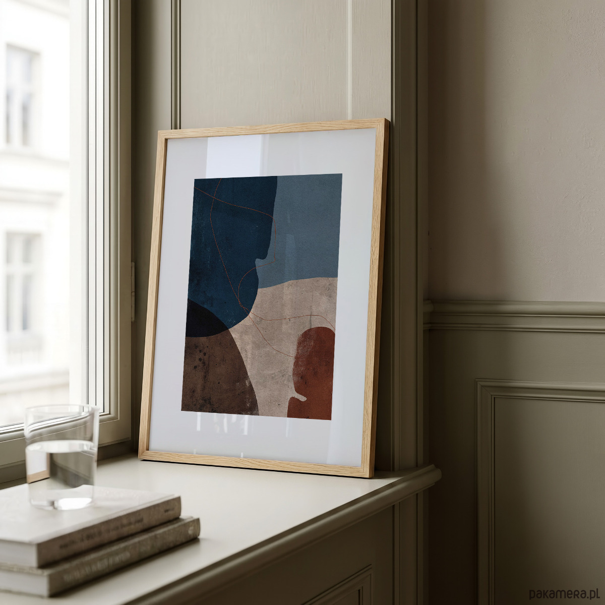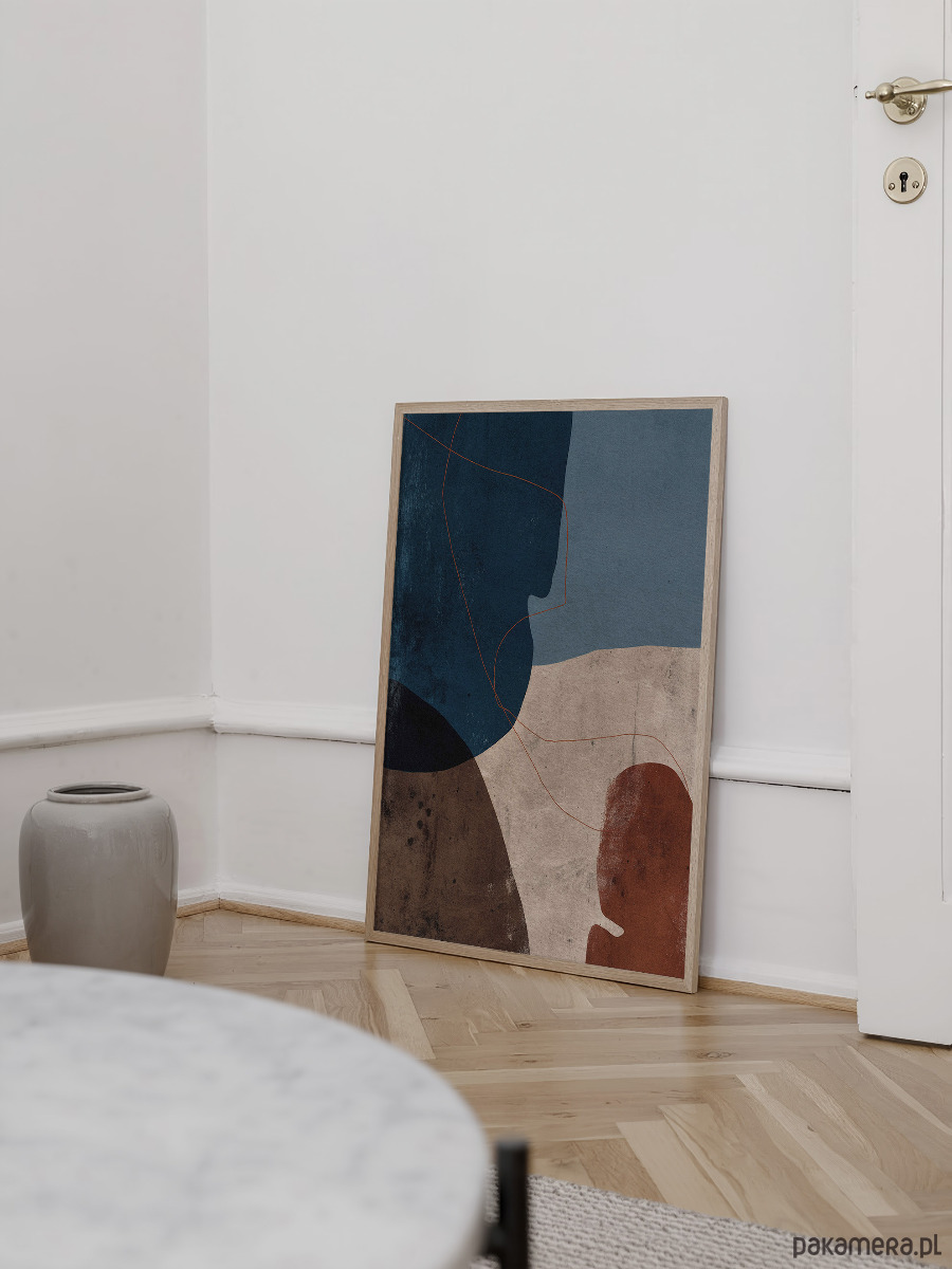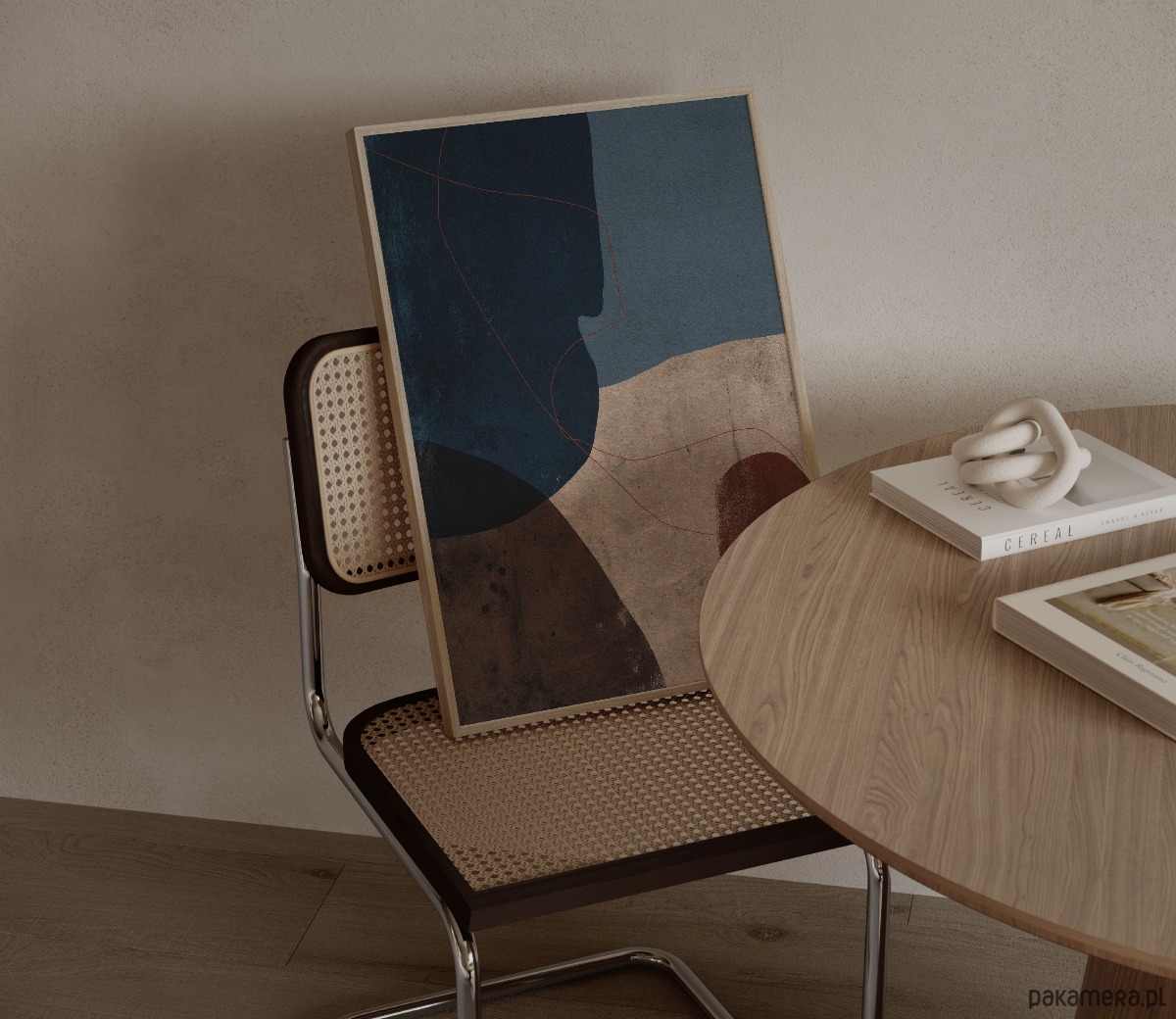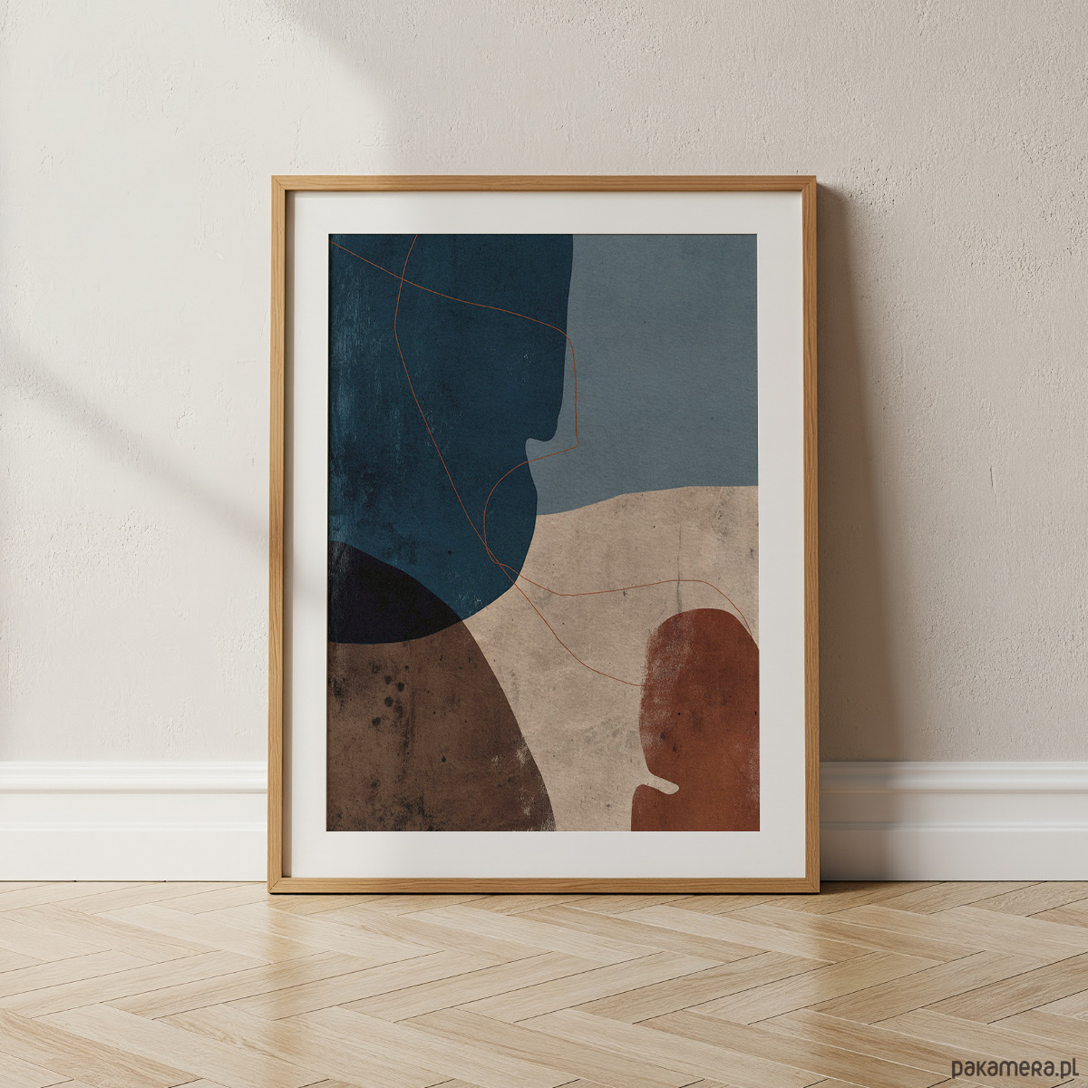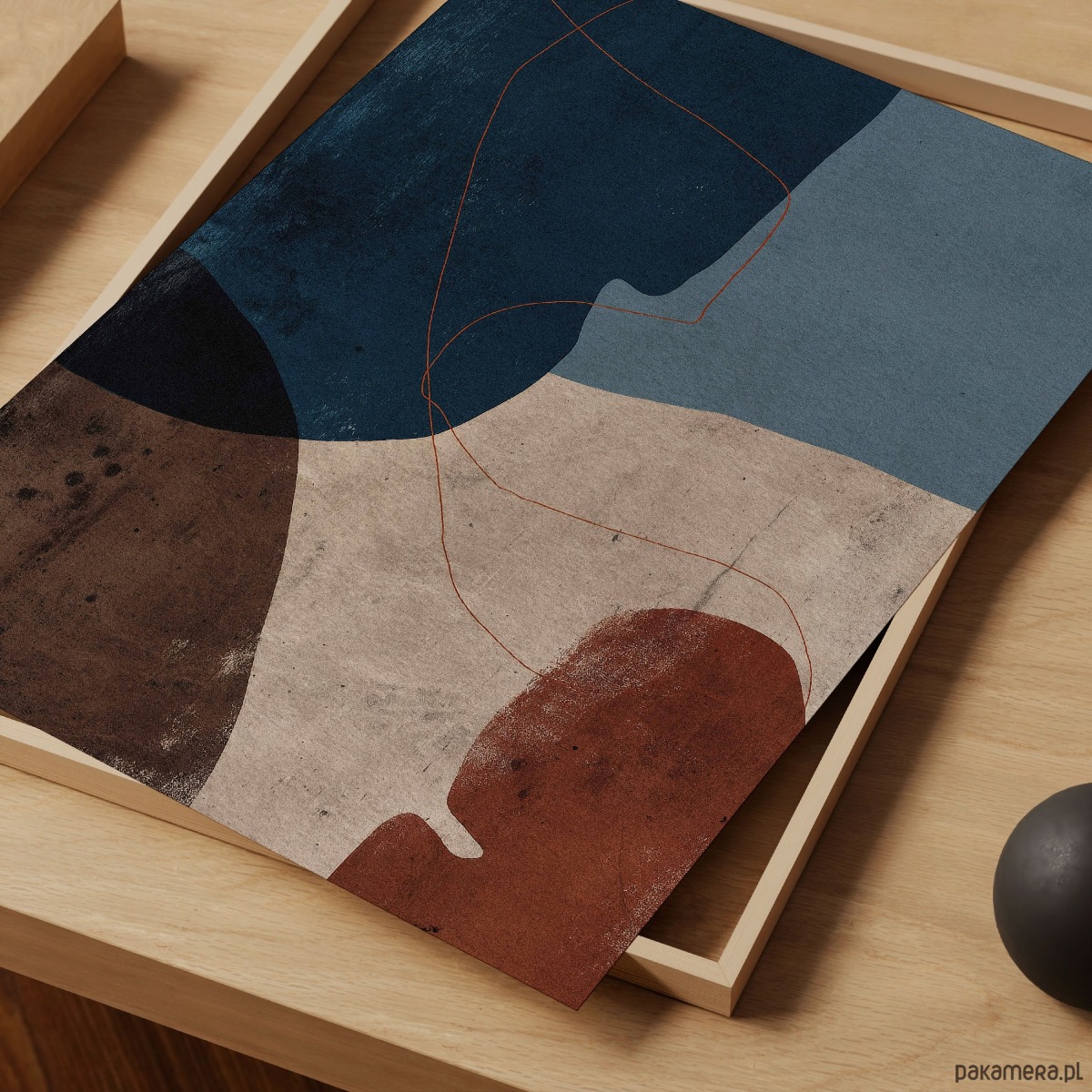 Minimalistyczny plakat abstrakcyjny w stonowanej, eleganckiej palecie barw inspirowanej naturalnymi materiałami i nowoczesnym, spokojnym wnętrzem. Połączenie głębokiego granatu, przygaszonego błękitu, ciepłych beży oraz rdzawych akcentów tworzy wyważoną, harmonijną kompozycję o organicznym charakterze. Delikatne, cienkie linie subtelnie prowadzą wzrok, nadając całości lekkość i nowoczesny rytm.