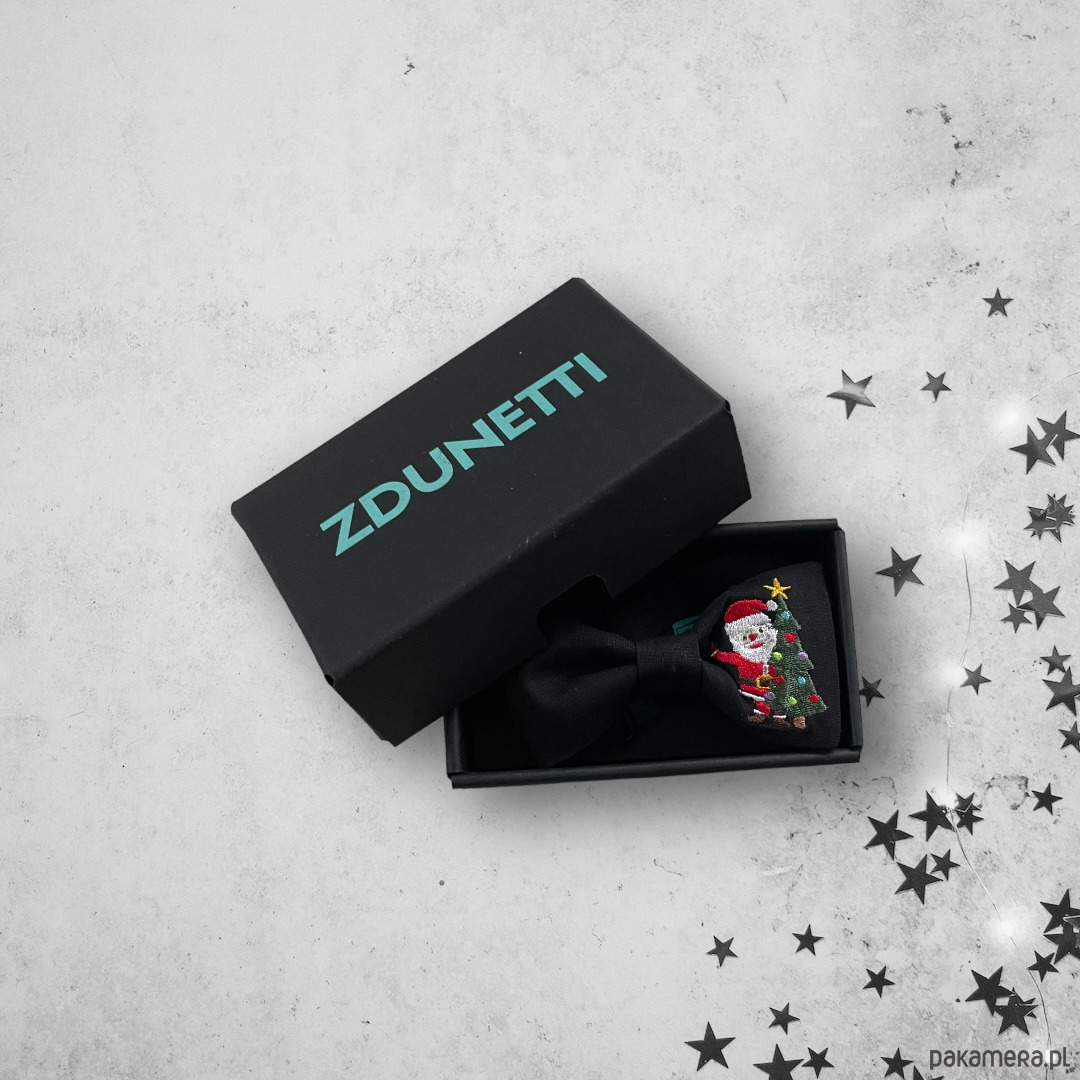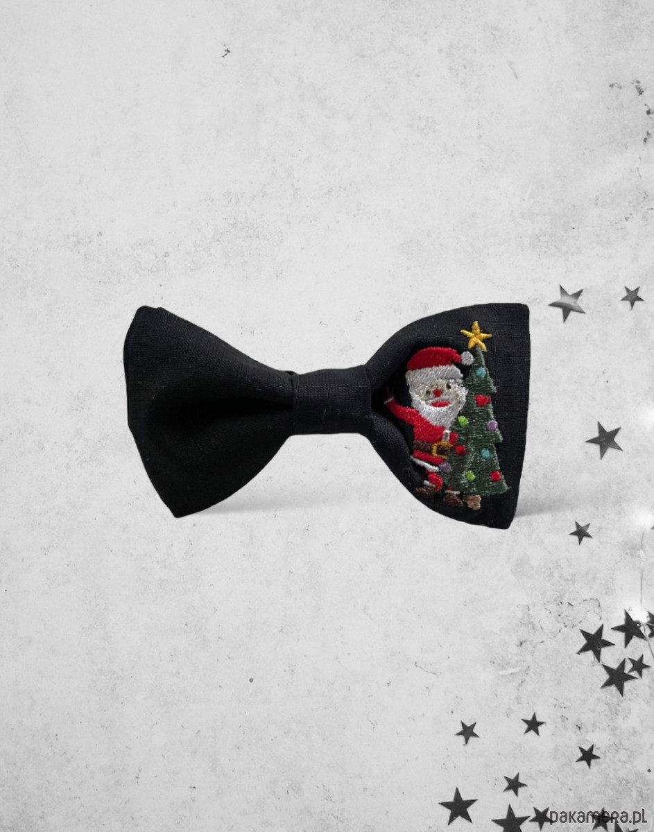 Wzór: muszka w kolorze czarnym, na niej haft - Mikołaj z choinką