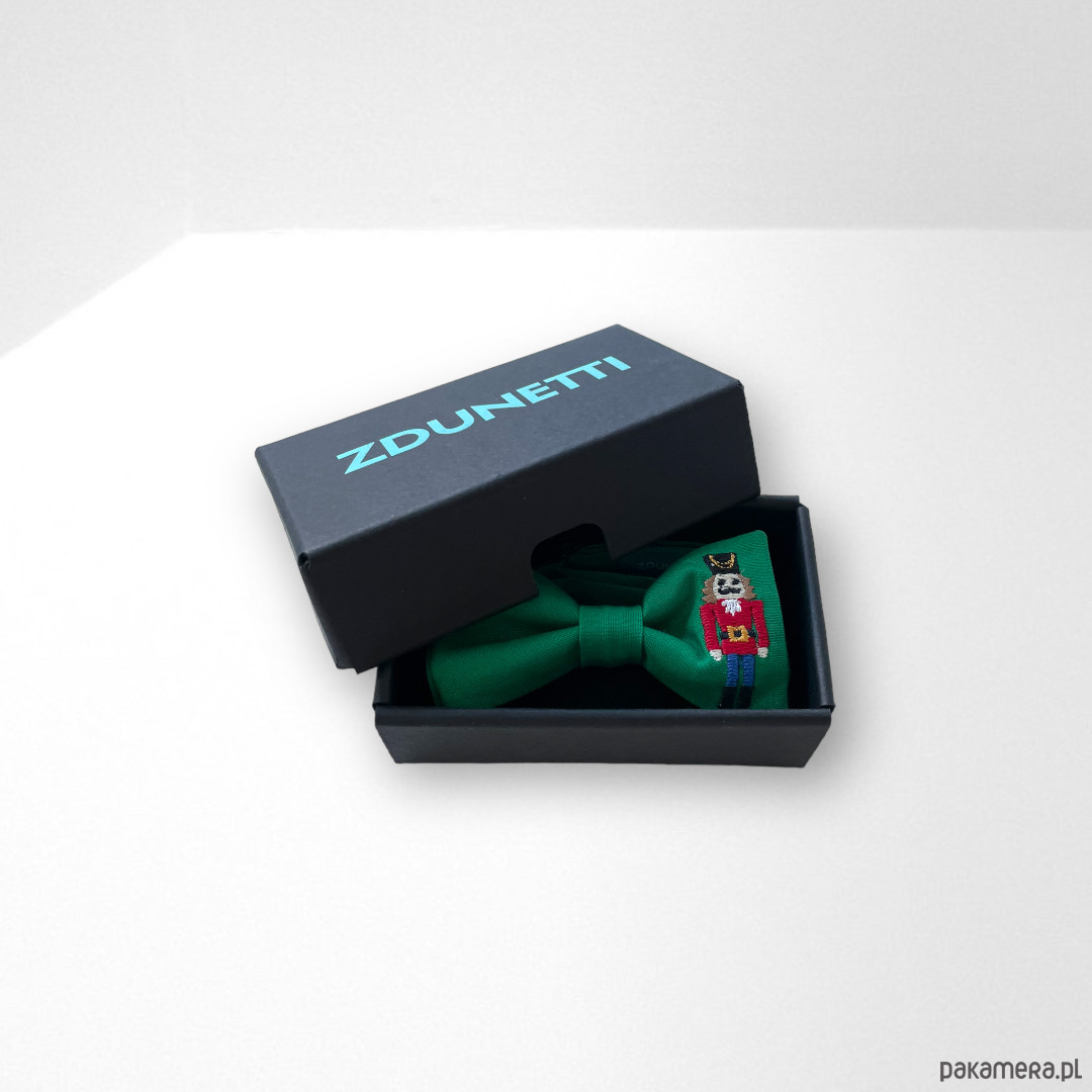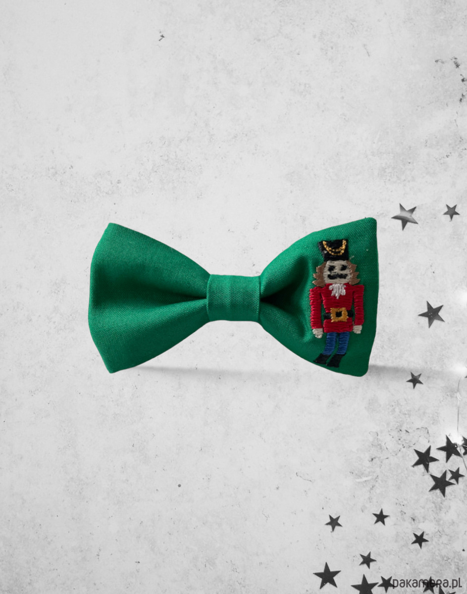 Wzór: muszka w kolorze zielonym, na niej haft - dziadek do orzechów