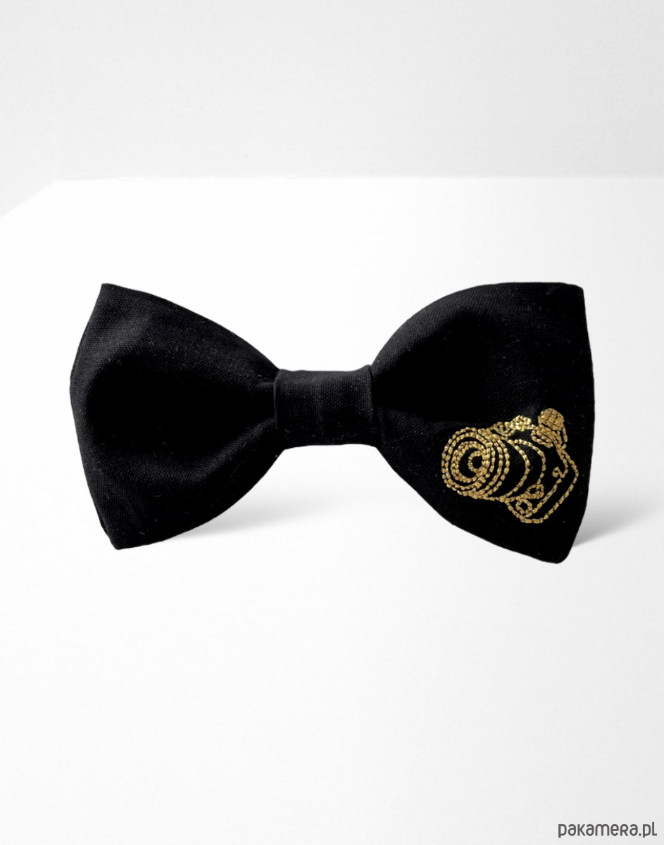 Wzór: muszka w kolorze czarnym, na niej haft - aparat fotograficzny (złota nić)