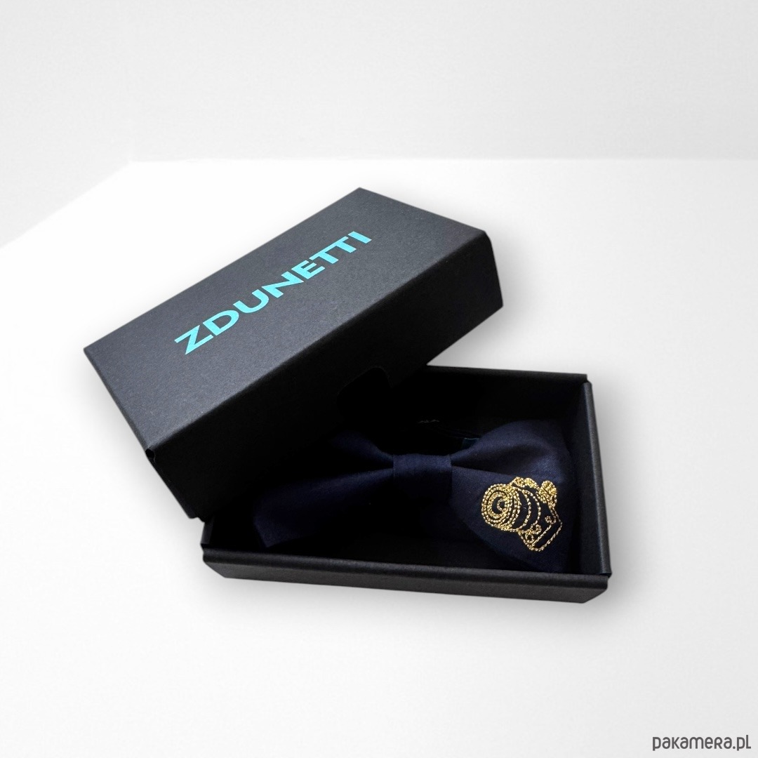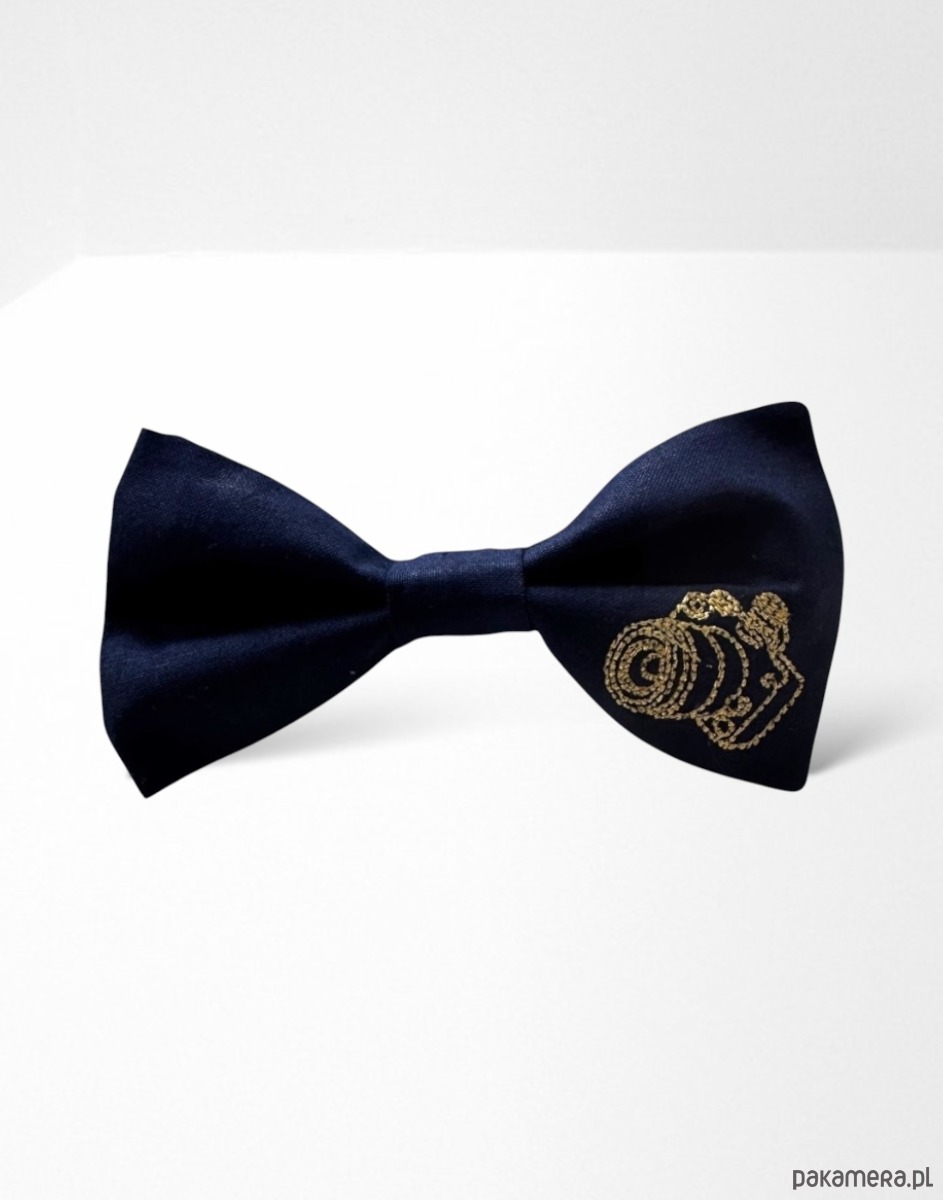 Wzór: muszka w kolorze granatowym ciemnym, na niej haft - złoty aparat fotograficzny