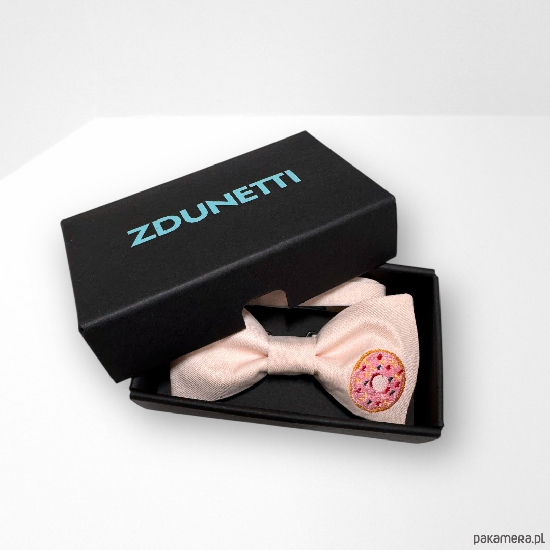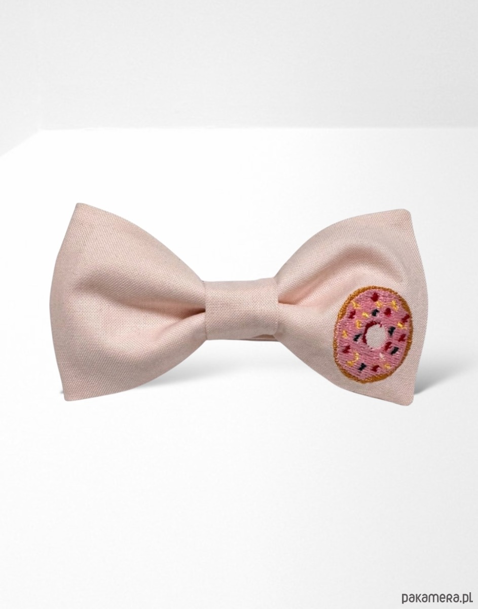 Wzór: muszka w kolorze różowym bladym, na niej haft - donut
