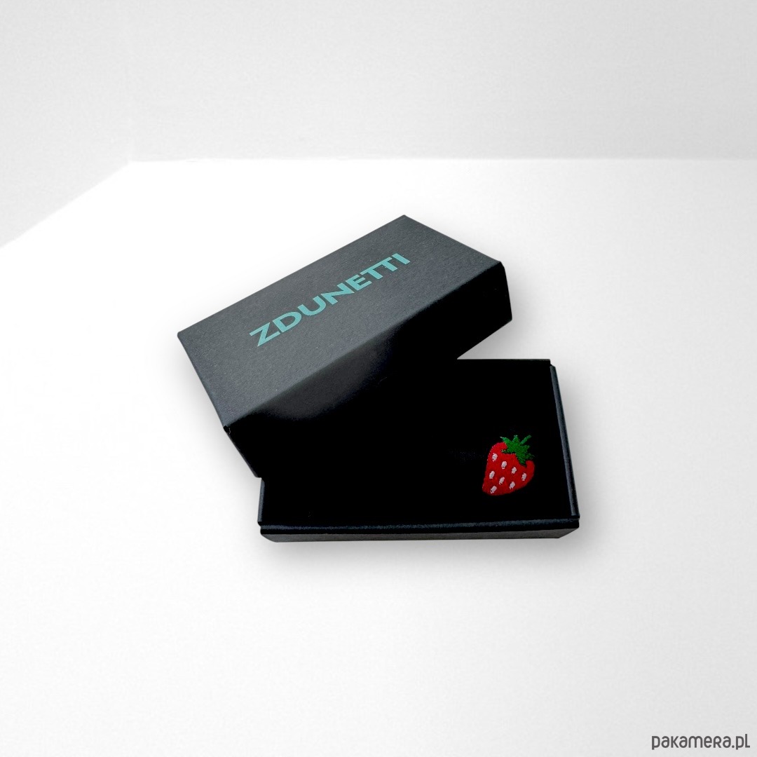 Wzór: muszka w kolorze czarnym, na niej haft - truskawka
