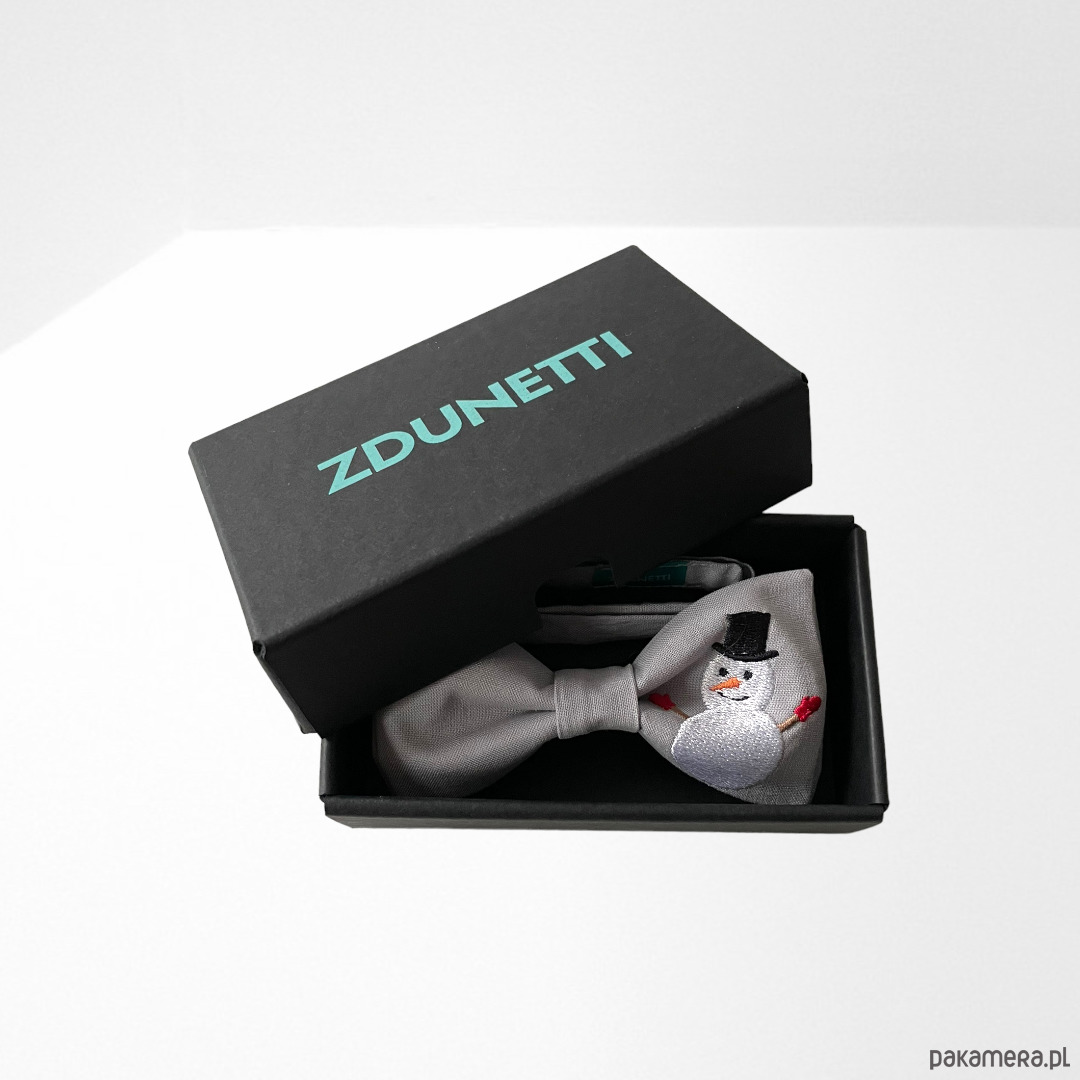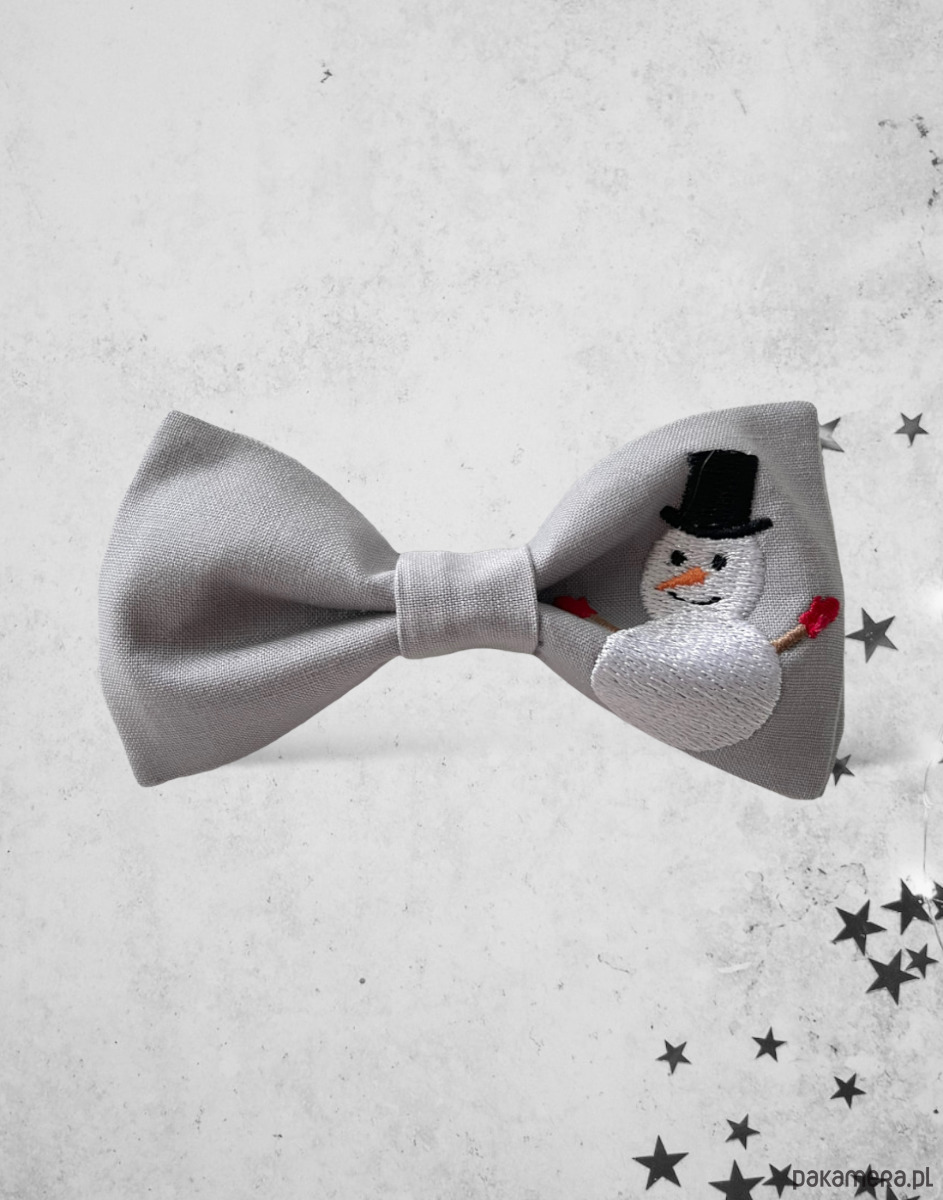 Wzór: muszka w kolorze szarym jasnym, na niej haft - bałwanek