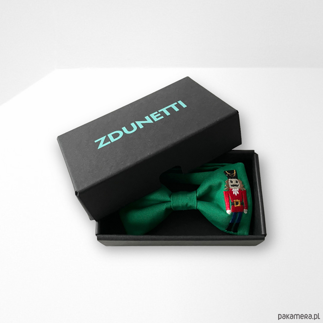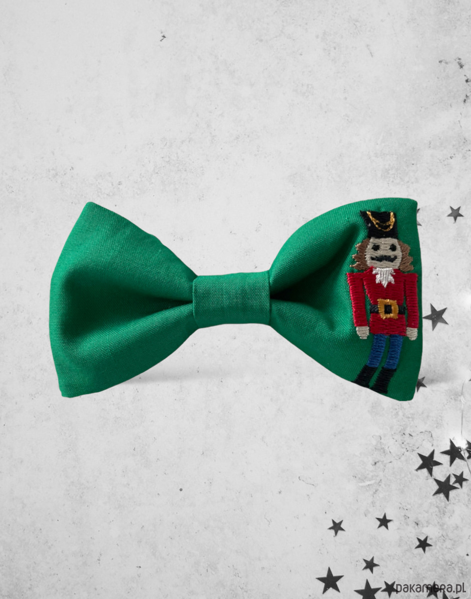 Wzór: muszka w kolorze zielonym żywym,na niej haft - dziadek do orzechów