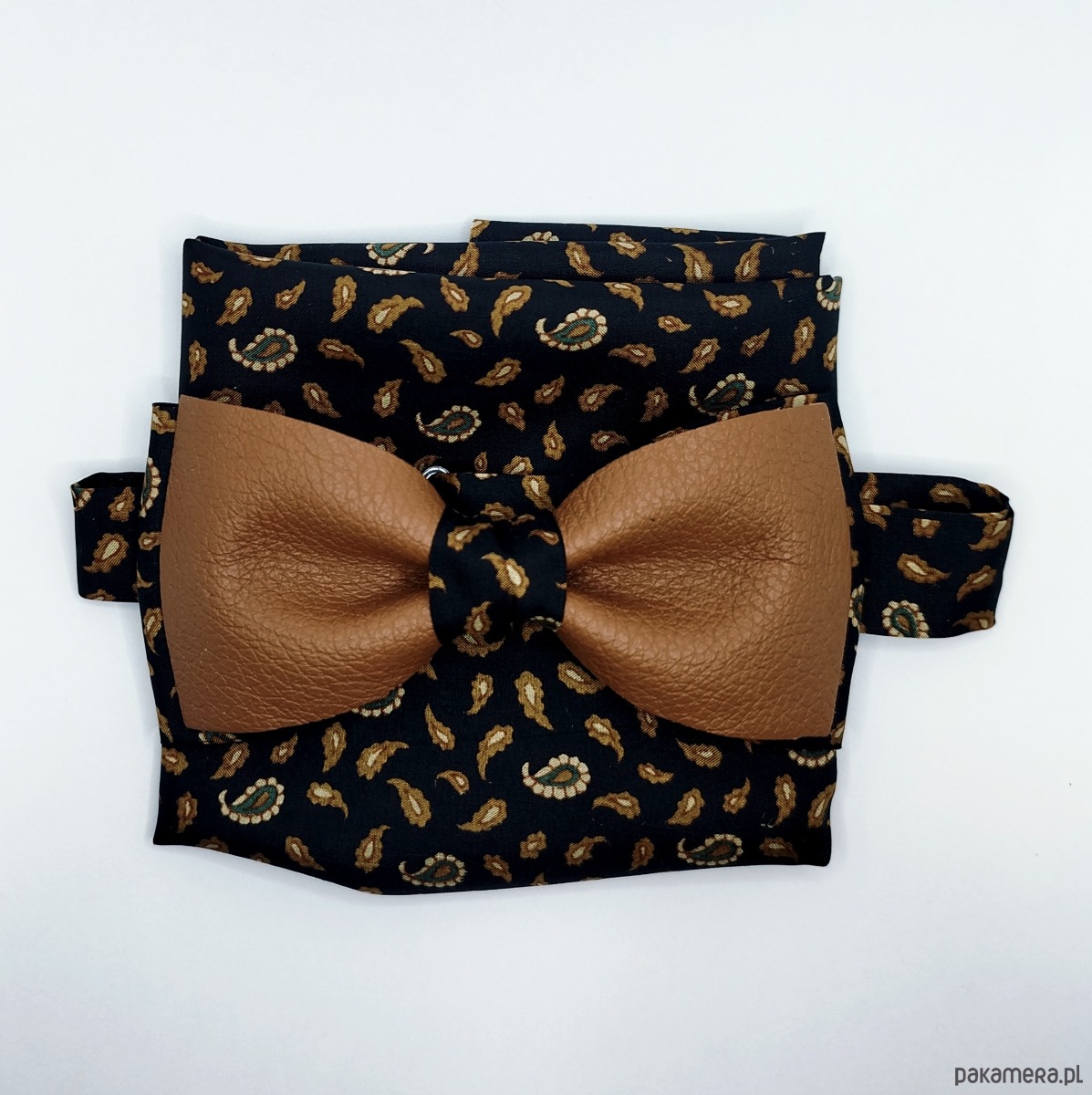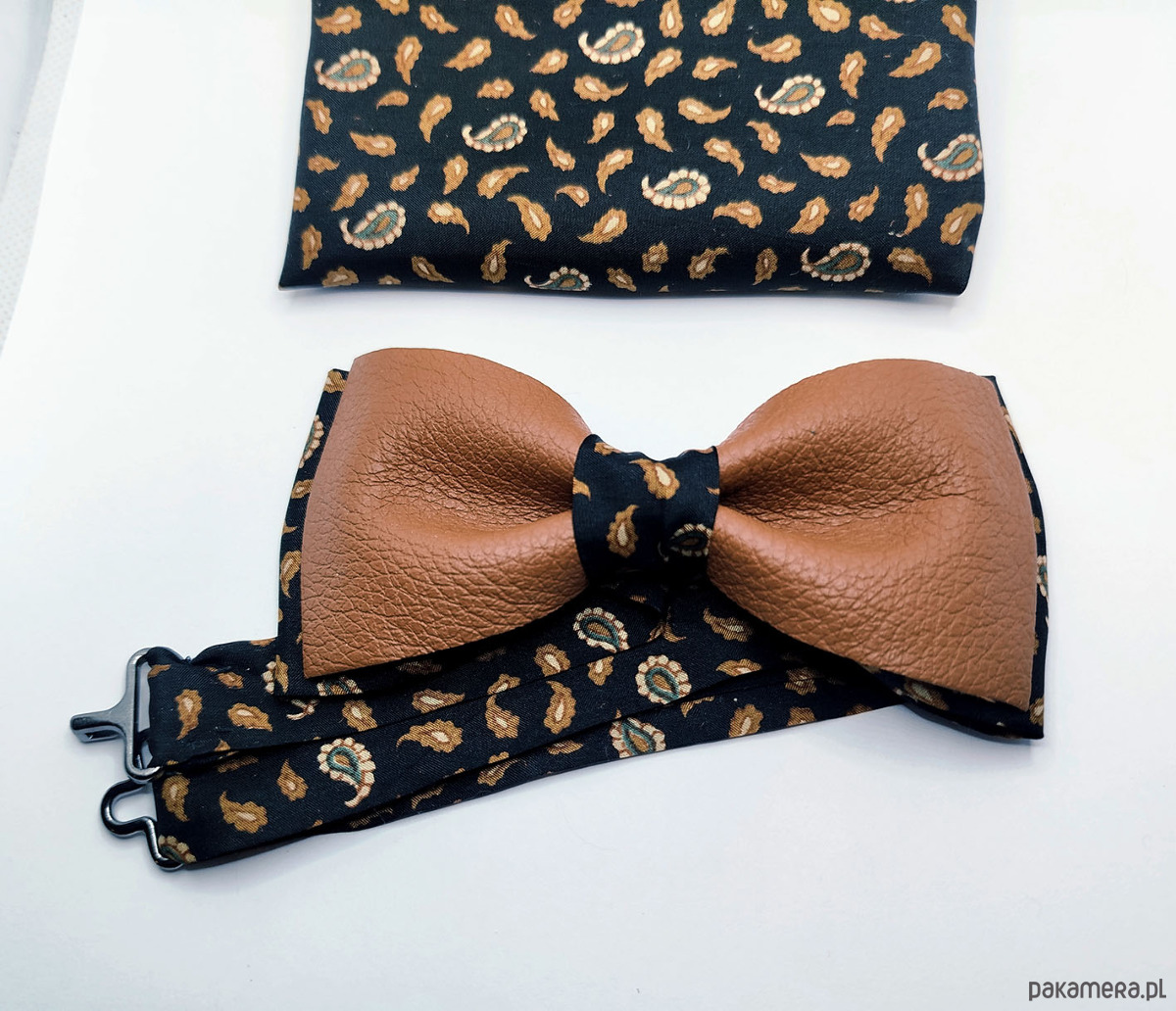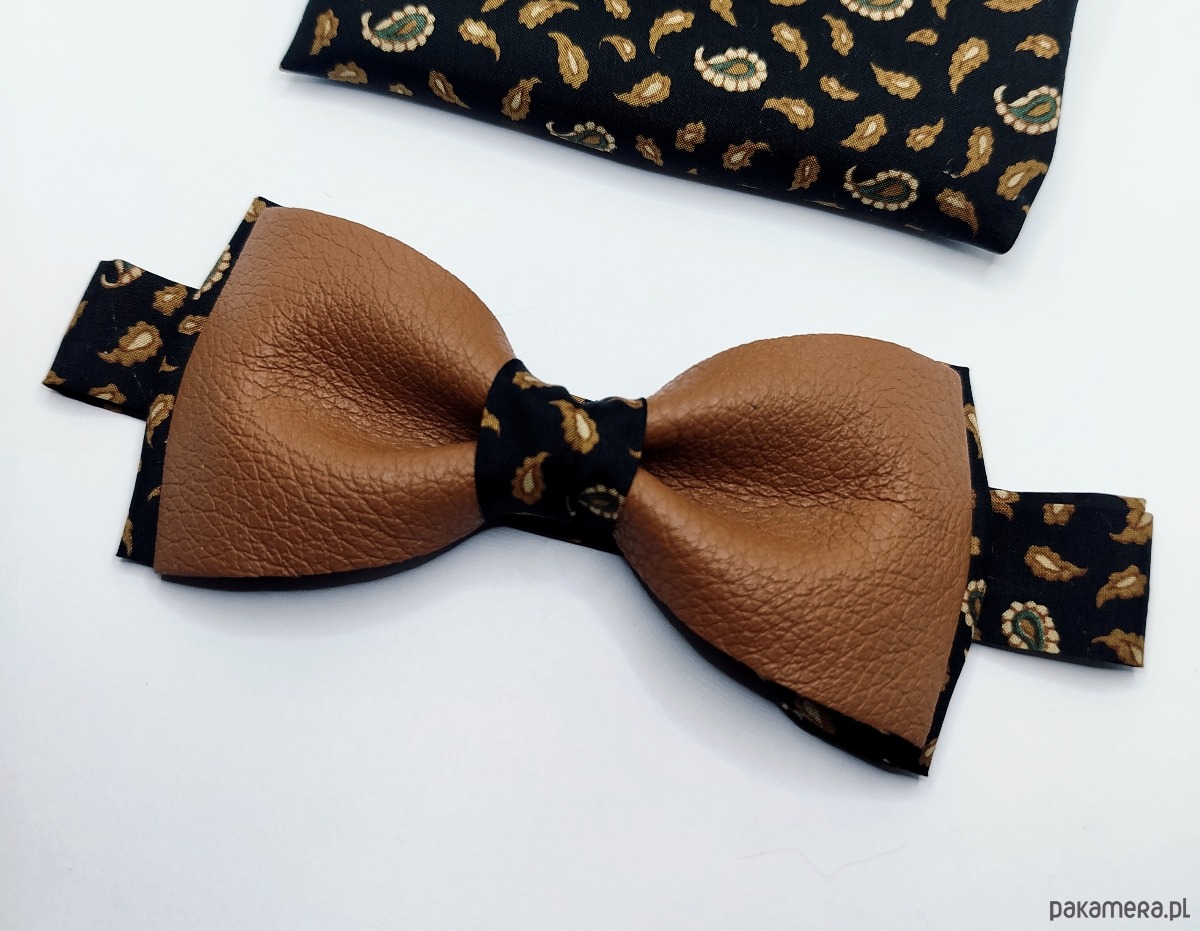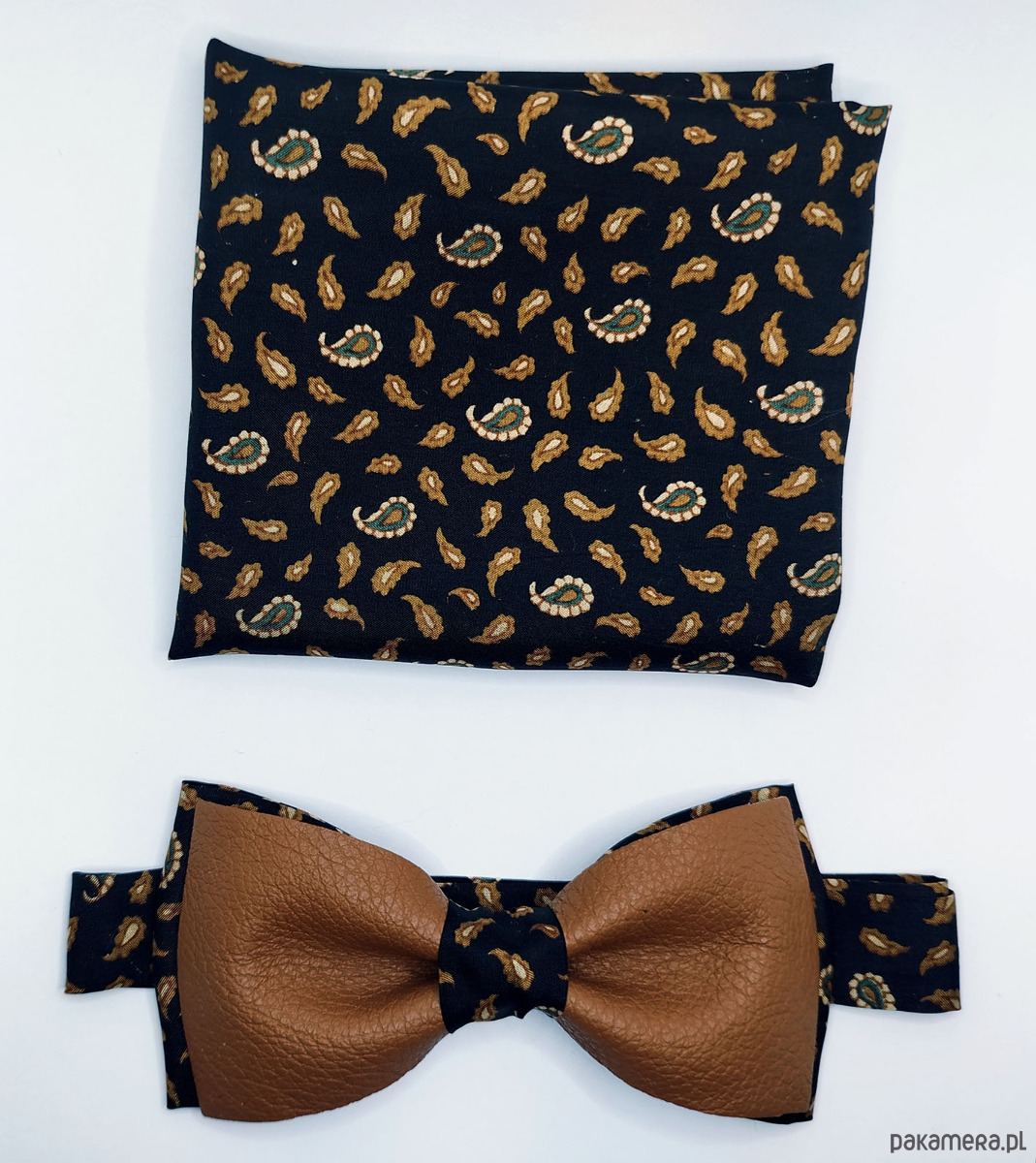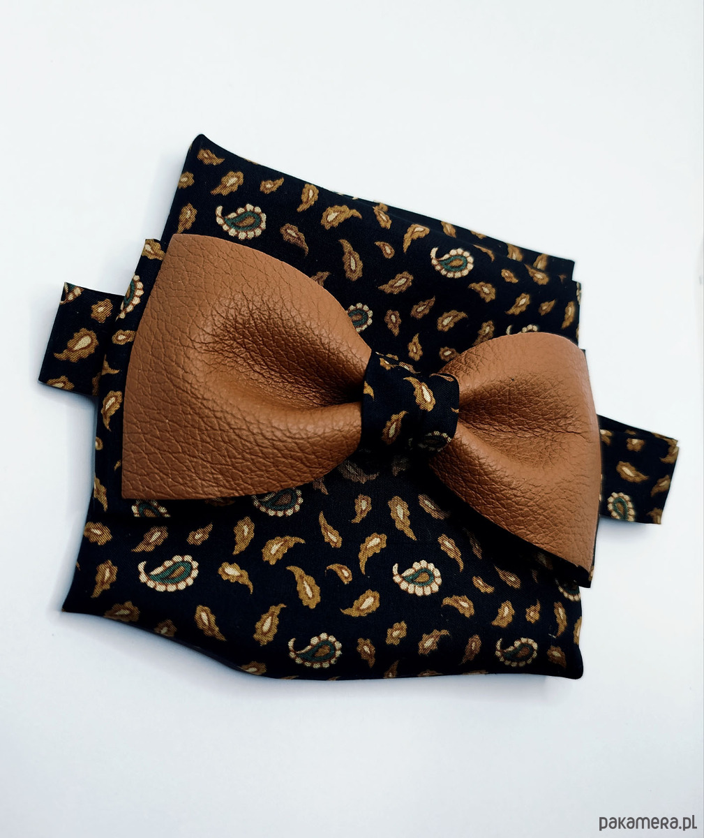 Muszka męska z poszetki z czarnego jedwabiu we wzory, połączona ze skórą naturalną w kolorze brązu. Taka kompozycja to pełna kwintesencja męskiej elegancji.