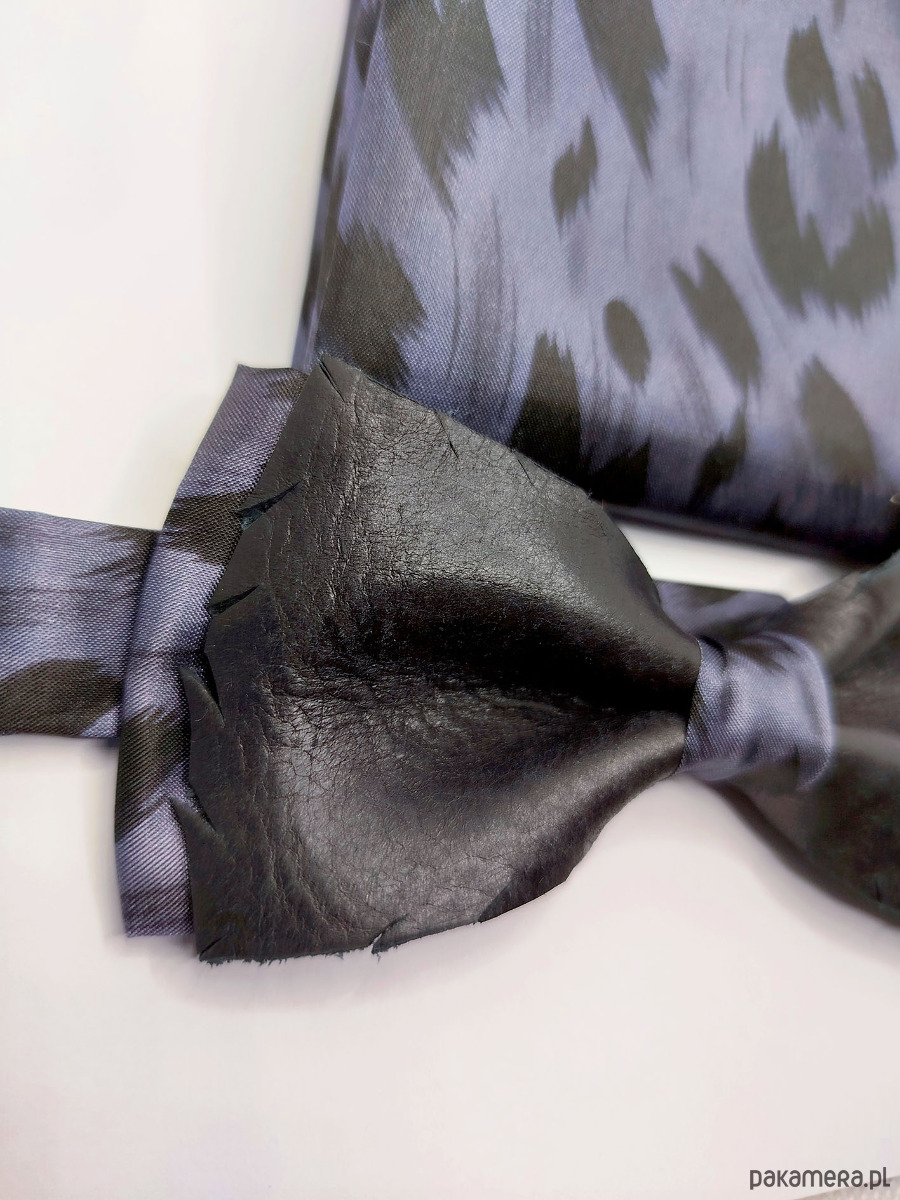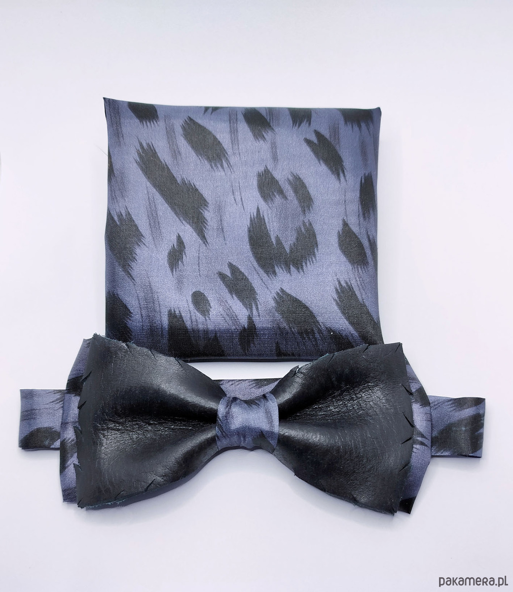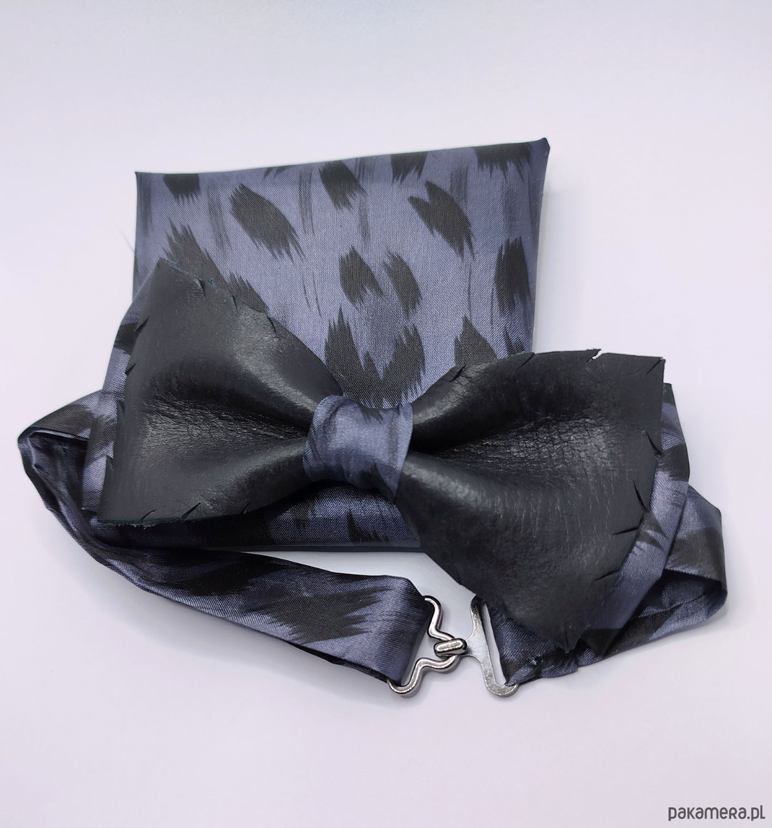 Muszka męska z poszetką w kolorze stonowanego granatu z czarnymi cieniami, połączona ze skórą w podobnym współgrającym odcieniu.