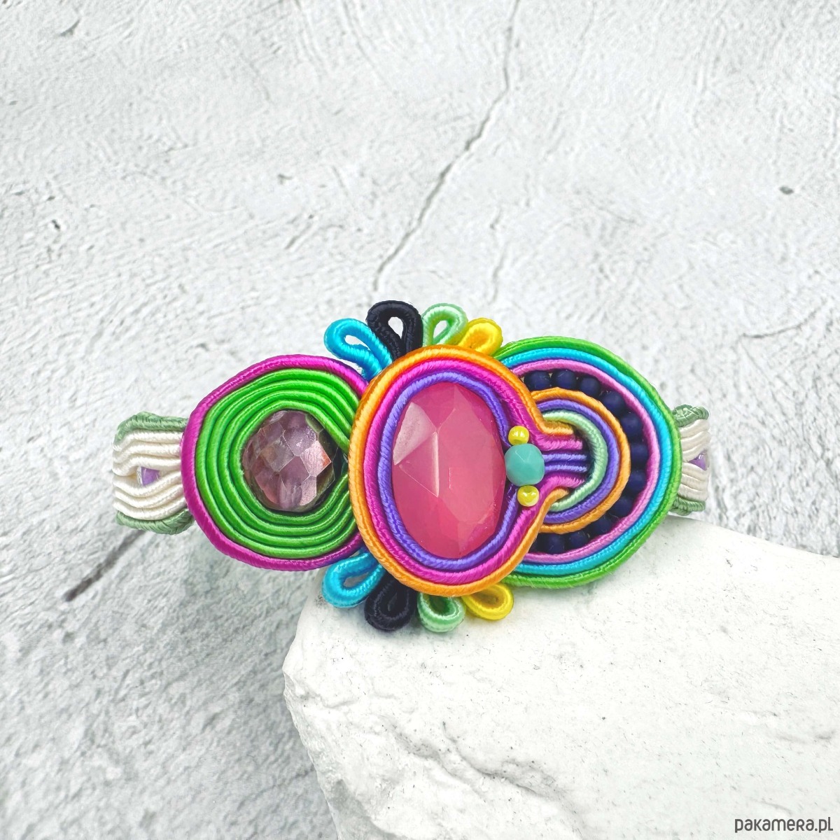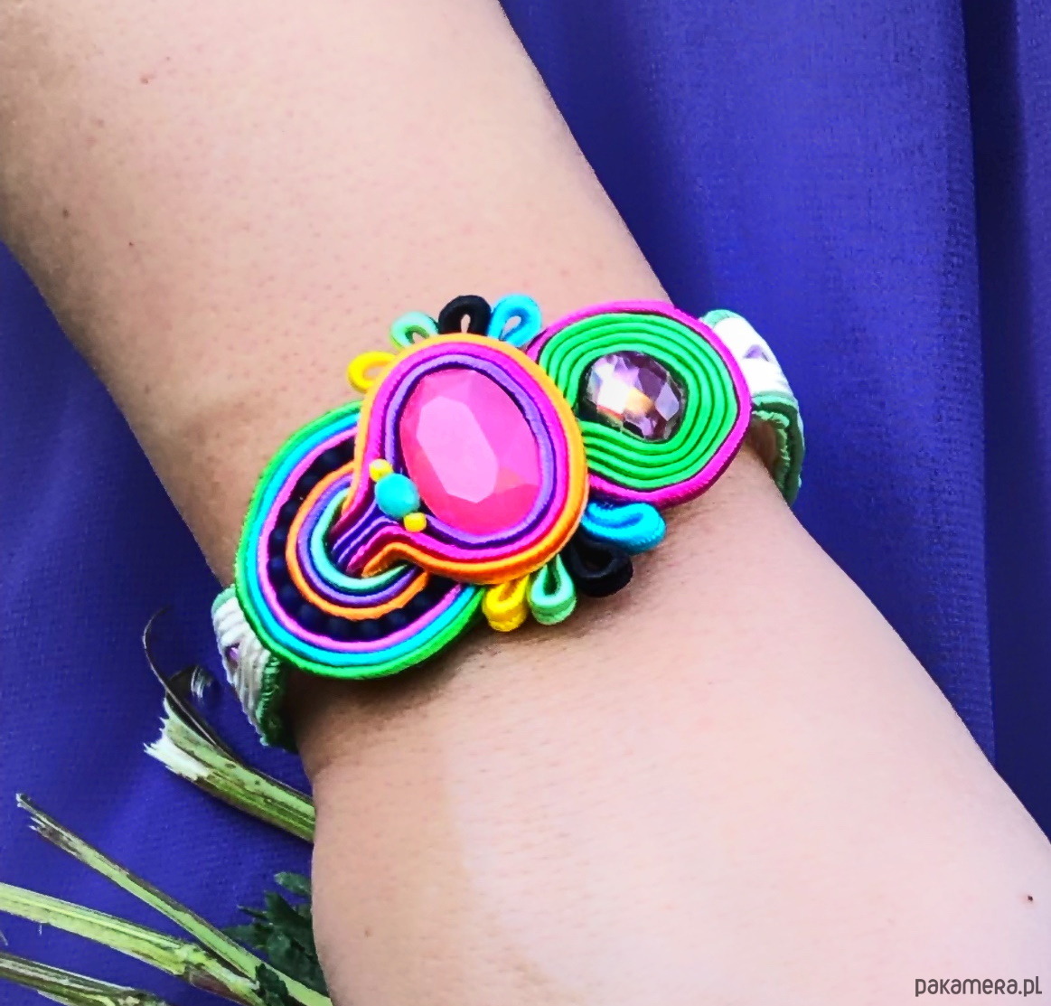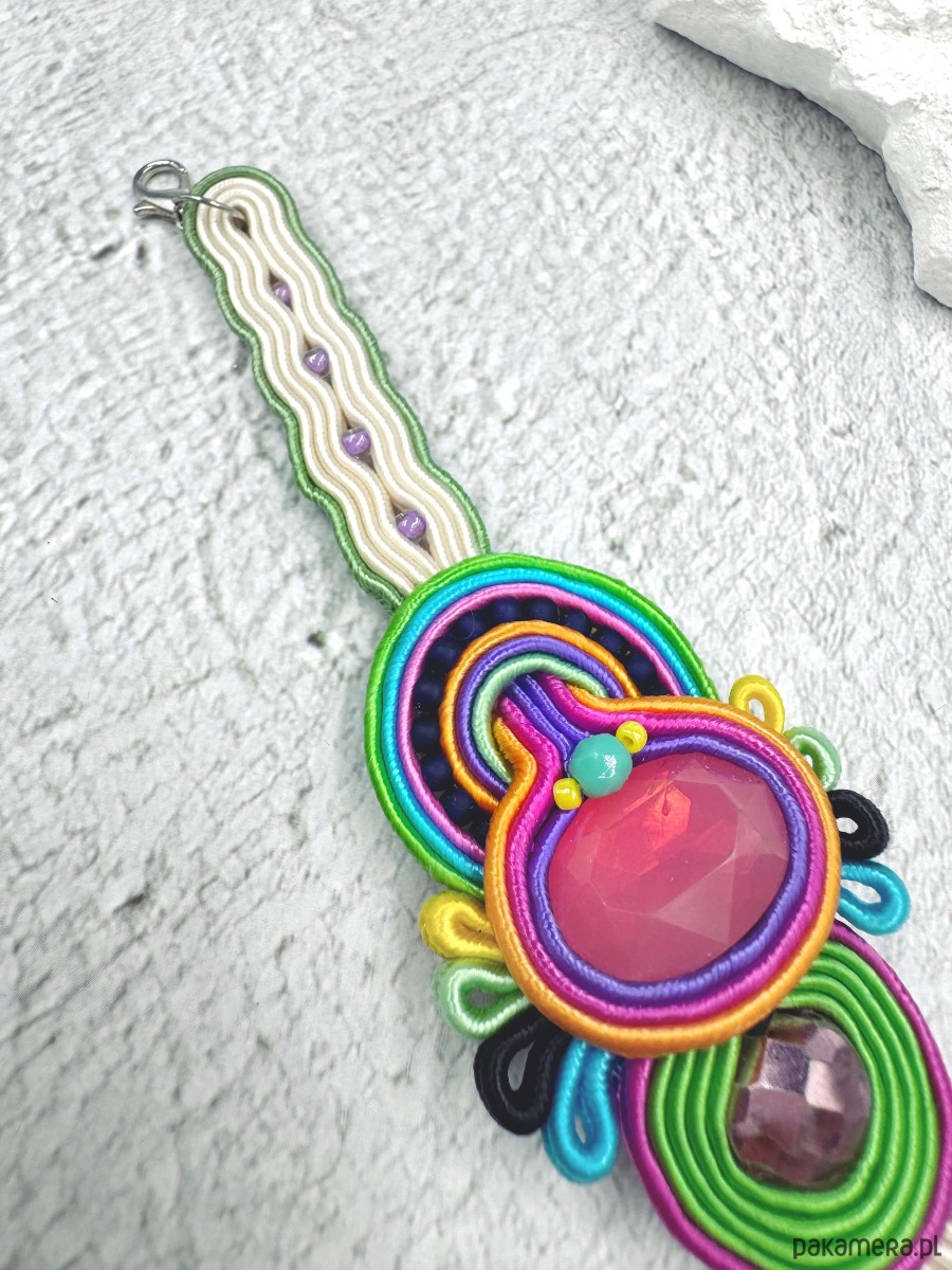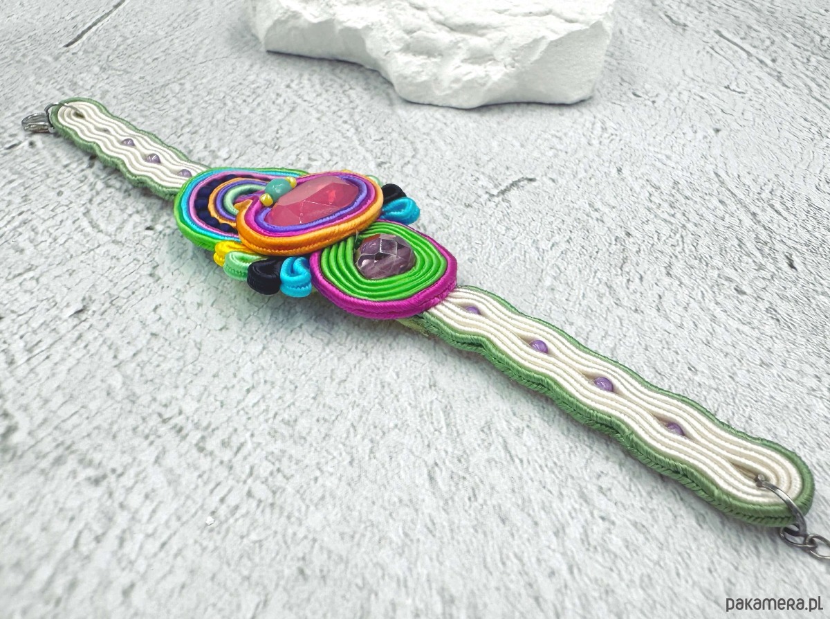 Multikolorowa bransoletka wykonana została pracochłonną metodą haftu sutasz.