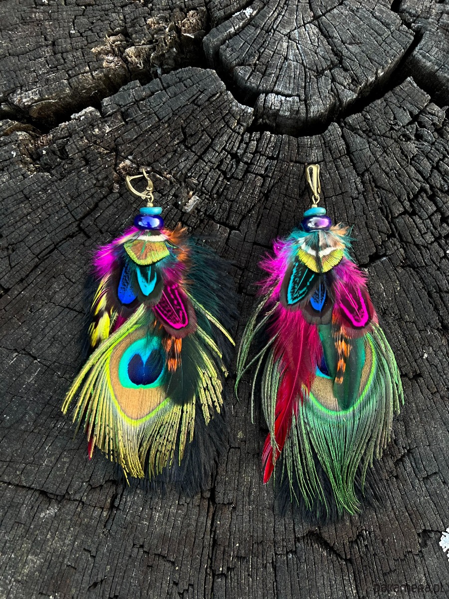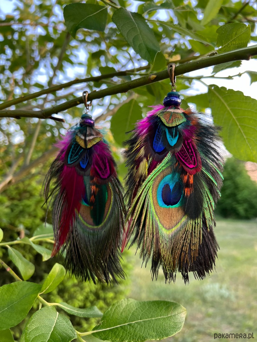 multikolorowe kolczyki z różnych gatunków naturalnych piór, wśród nich pióra pawia, bażanta, papugi, gęsi.