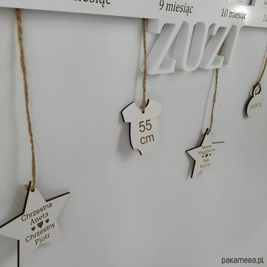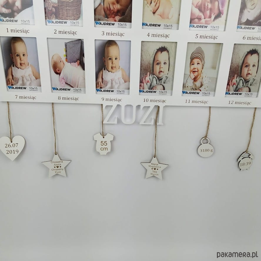 Materiał: Drewno(MDF), szkło.Ramka na 12 zdjęć w formacie 10x15 cm.Zdjęcia z przodu chronią szklane szybki, z tyłu ramki zamocowane są metalowe zawieszki dzięki którym łatwo zawiesisz ją na ścianie. Tekst na zawieszkach grawerowany laserowo. Pod każdym zdjęciem napis 1 miesiąc, 2 miesiąc itd. napisy grawerowane laserowo. Dostępne kolory: Surowy, Biały, Czarny, Brązowy, Różowy, Błękitny, Szary, Niebieski, Czerwony, Pudrowy róż, Złoty. Srebrny