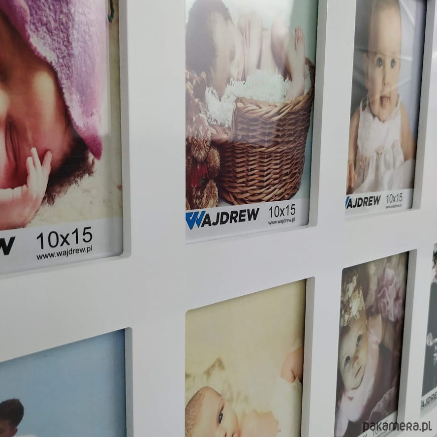 Materiał: Drewno(MDF), szkło. Ramka na 12 zdjęć w formacie 15x10 Zdjęcia z przodu chronią szklane szybki, z tyłu ramki zamocowane są metalowe zawieszki dzięki którym łatwo zawiesisz ją na ścianie. Dostępne kolory: Surowy, Biały, Czarny, Brązowy, Różowy, Błękitny, Szary, Niebieski, Czerwony, Pudrowy róż, Złoty, Srebrny