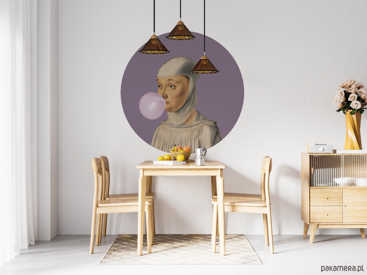 Mural DOTS Kobieta z Gumą Balonową FIOLETOWY- okrągła dekoracja ścienna