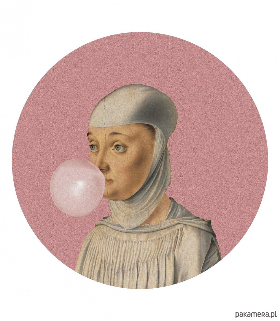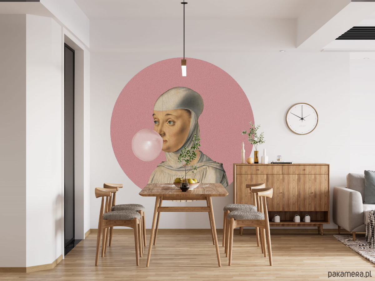 Mural DOTS Kobieta z Gumą Balonową RÓŻOWY- okrągła dekoracja ścienna