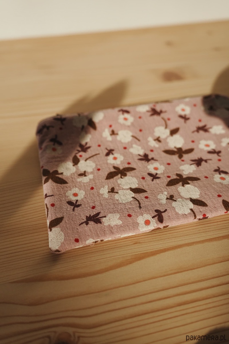 Na zewnątrz muślinowa, bawełniana tkanina, wewnątrz szara, bawełniana podszewka. Całość zapinana na dopasowany kolorystycznie zamek błyskawiczny.