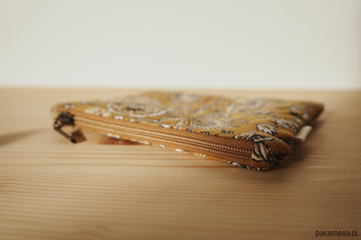 Na zewnątrz muślinowa, bawełniana tkanina, wewnątrz miodowa, lniana podszewka. Całość zapinana na dopasowany kolorystycznie zamek błyskawiczny.