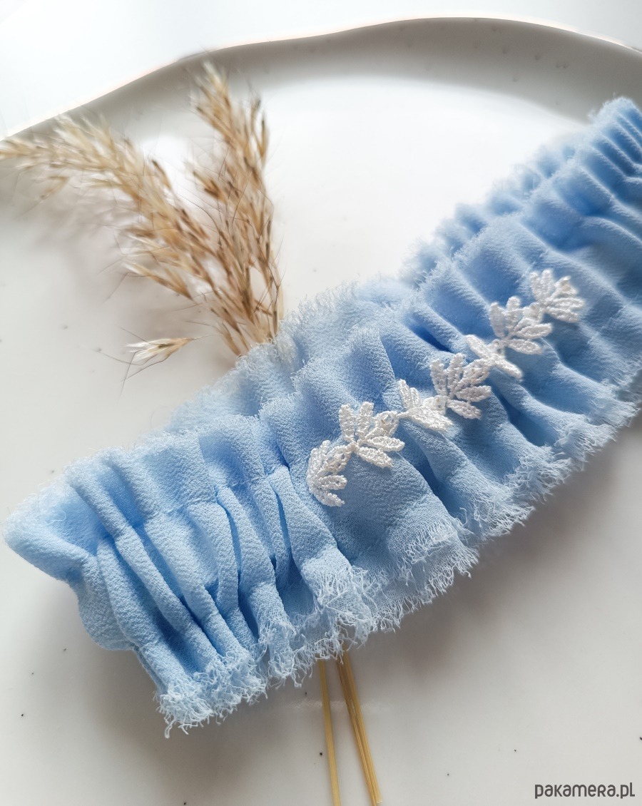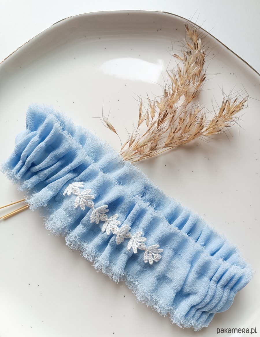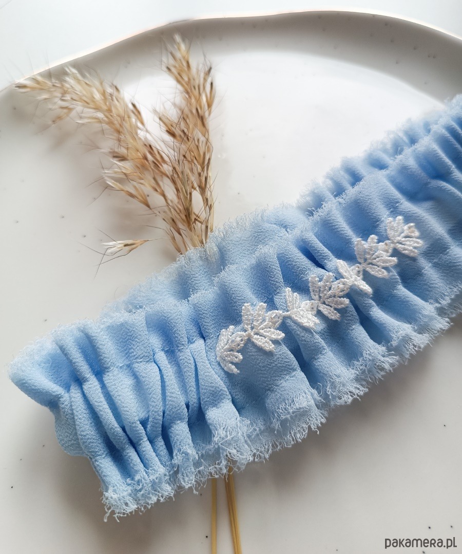 Podwiązka została uszyta z dwóch warstw miękkiego muślinu w kolorze zgaszonego błękitu.