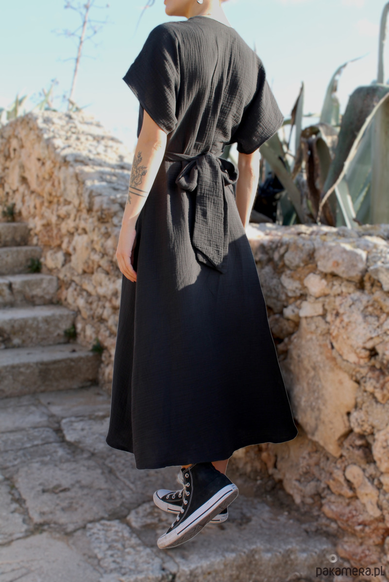 Muślinowa sukienka midi z wiązaniem w talii. Krótki rękaw, dekolt V, dobrej jakości bawełniana tkanina. Sukienka z muślinu jest odpowiednia na każdą porę roku.