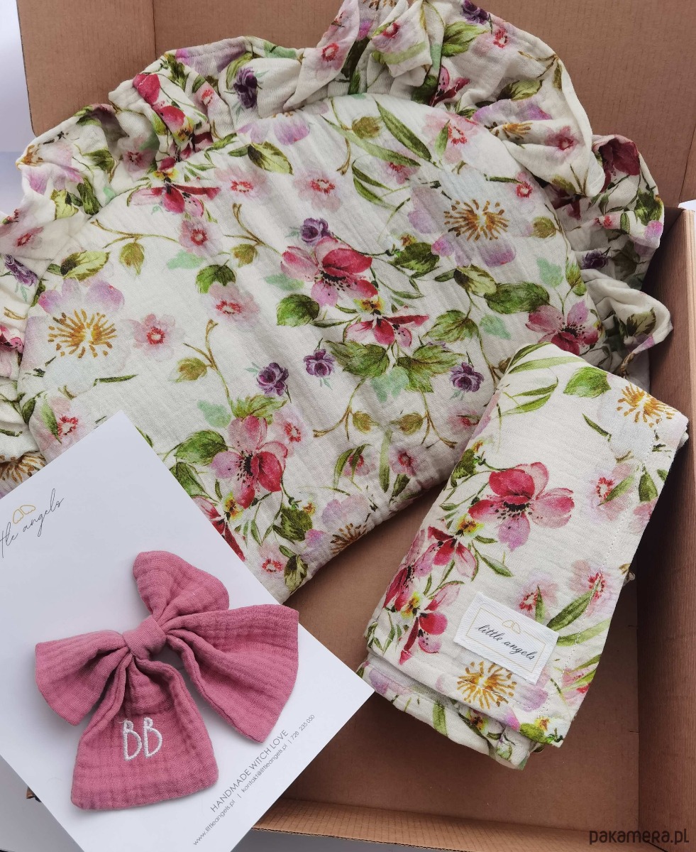 Muślinowy kocyk (100x75)+poduszka + kokardka (kolory, wzory)