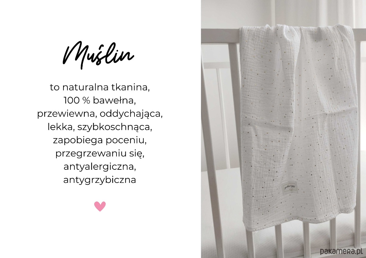 Idealny kocyk na drzemki, zwłaszcza w upalne dni. Jest cieniutki, przewiewny i oddychający, dzięki czemu Twój aniołek się nie przegrzeje. Ochroni zarówno przed słońcem jak i wiatrem. Jest dość duży, więc gdy zrobi się chłodniej na dworze, otulone dzieciątko nie zmarznie. Niezastąpiony przy usypianiu maluszka - pieluszka nasiąknie zapachem mamy, przez co będzie mu się lepiej spało, będzie się czuł bezpieczniej. Pomoże dyskretnie nakarmić dziecko w miejscu publicznym. Jest bardzo chłonny, dlatego sprawdzi się również jako ręczniki. W dodatku szybko schnie. Może służyć jako mata, podkład do przewijania. Jest lekki (lekki kocyk, lżejsza torebka, mniej do dźwigania). Jest nie tylko praktyczny ale i bezpieczny dla delikatnej skóry maluszka (wykonany ze 100 % bawełny - muślinu).