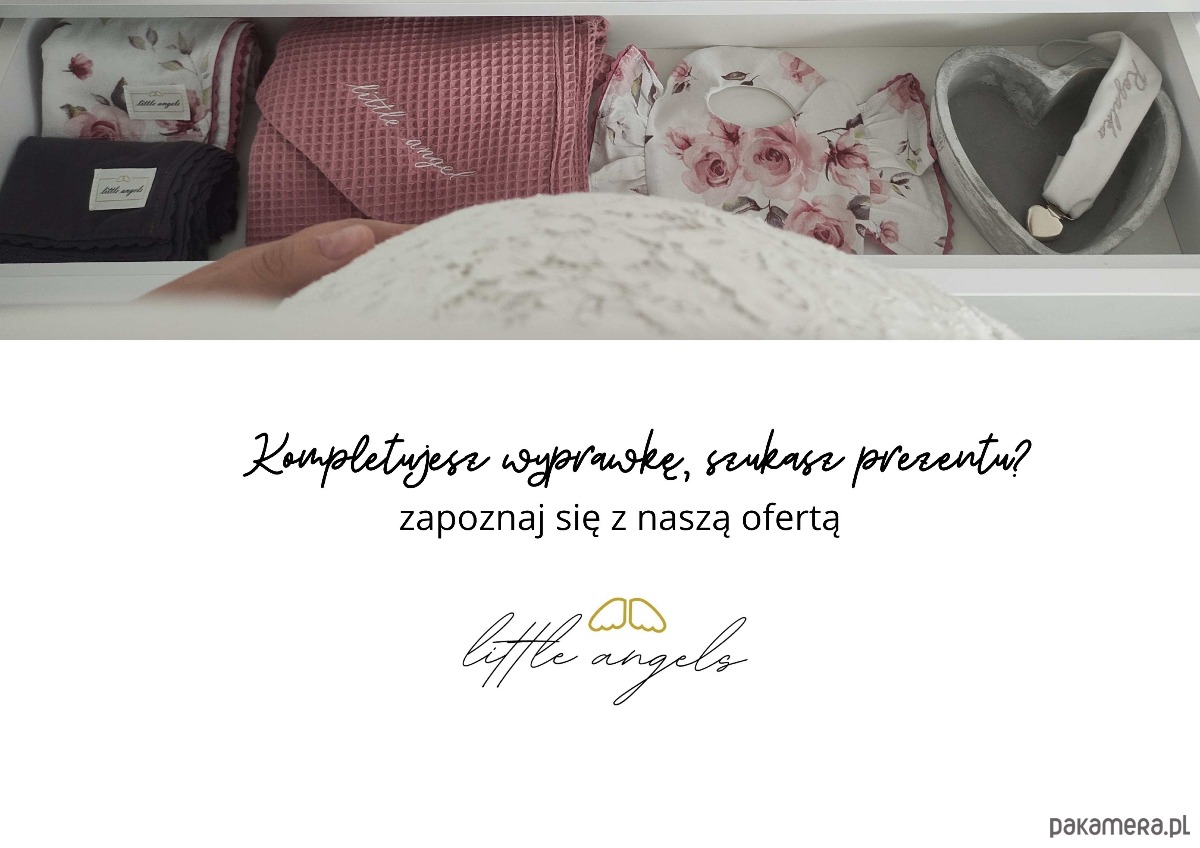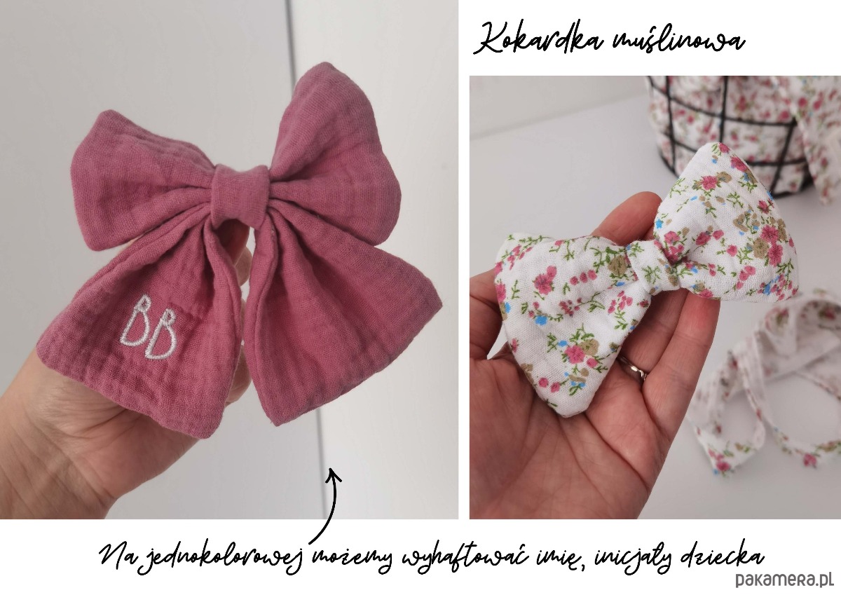 Do każdego kocyka płaska poduszka w kształcie misia lub mini misia, serduszka, skrzydełek, półokrągła. W zestawie również kokardka do włosów na opasce bezuciskowej lub spince. Kokardka może być wykonana z bawełnianej koronki lub muślinu. Na jednokolorowym muślinie możemy wyhaftować np. literkę imienia dziecka.