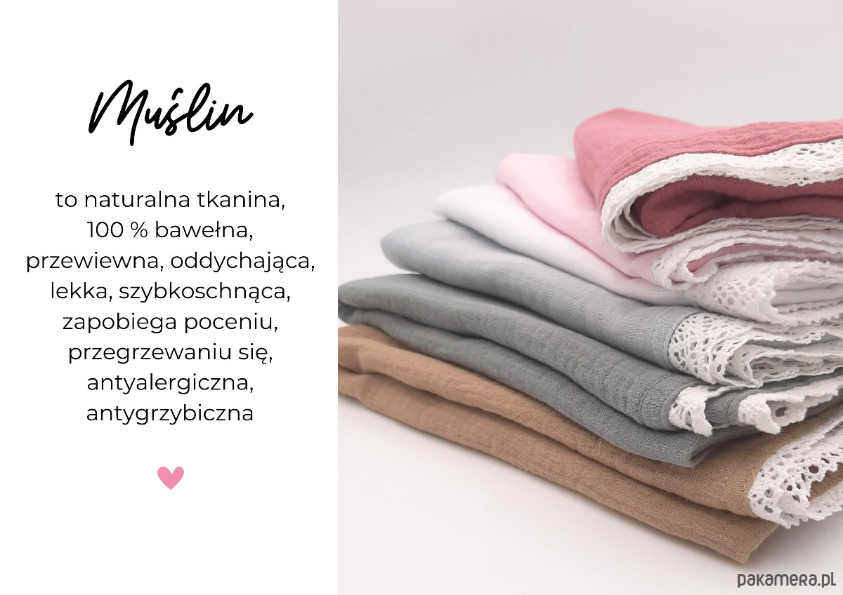 Jest cieniutki, przewiewny i oddychający, dzięki czemu Twój aniołek się nie przegrzeje. Idealny na drzemki, zwłaszcza w upalne dni. Ochroni zarówno przed słońcem jak i wiatrem. Jest dość duży, więc gdy zrobi się chłodniej na dworze, otulone dzieciątko nie zmarznie. Niezastąpiony przy usypianiu maluszka - pieluszka nasiąknie zapachem mamy, przez co będzie mu się lepiej spało, będzie się czuł bezpieczniej. Pomoże dyskretnie nakarmić dziecko w miejscu publicznym. Jest bardzo chłonny, dlatego sprawdzi się również jako ręczniki. W dodatku szybko schnie. Może służyć jako mata, podkład do przewijania. Jest lekki (lekki kocyk, lżejsza torebka, mniej do dźwigania). Jest nie tylko praktyczny ale i bezpieczny dla delikatnej skóry maluszka (wykonany ze 100 % bawełny - muślinu), oraz piękny. Do kocyka dołączamy płaską poduszeczkę miś.