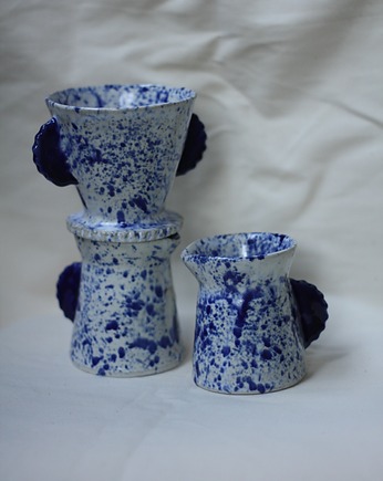 Ceramiczny dripper w kobaltowe ciapki i dzbanuszek. Ceramika ręcznie robiona
