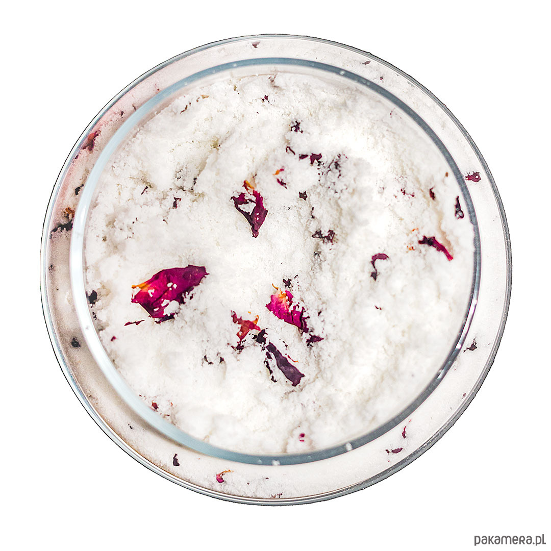 Skład: soda oczyszczona, kwasek cytrynowy, kozie mleko w proszku, skrobia ziemniaczana, olej z pestek winogron, suszone płatki róży, kompozycja zapachowa różana, witamina E