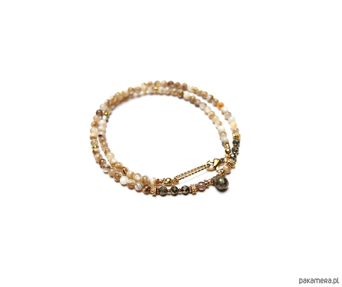 Krótki, delikatny naszyjnik wykonany w całości z pozłacanej stali szlachetnej oraz muszli [4mm], pirytu fasetowanego [4mm], hematytu fasetowanego, platerowanego o matowej powierzchni [2mm], przekładek z hematytu [1mm], oraz zawieszki z fasetowanym pirytem. Naszyjnik o długości ok. 43cm. Biżuteria ozdobnie zapakowana.