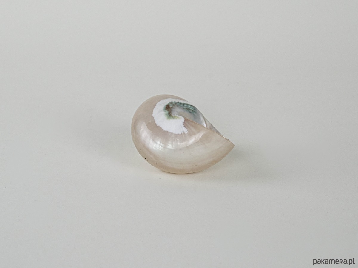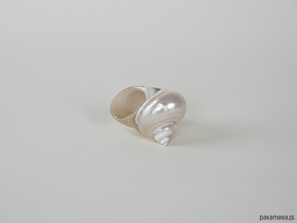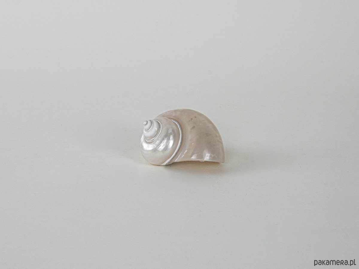 Dekoracyjna muszla z naturalnej masy perłowej o pięknym spiralnym układzie i perłowym połysku. Idealna jako elegancki element dekoracyjny w stylu nadmorskim lub glamour. Prawdopodobnie wyrób z drugiej połowy XX wieku, chętnie stosowany w aranżacjach wnętrz jako ozdoba lub pojemnik na drobne biżuteryjne akcenty.