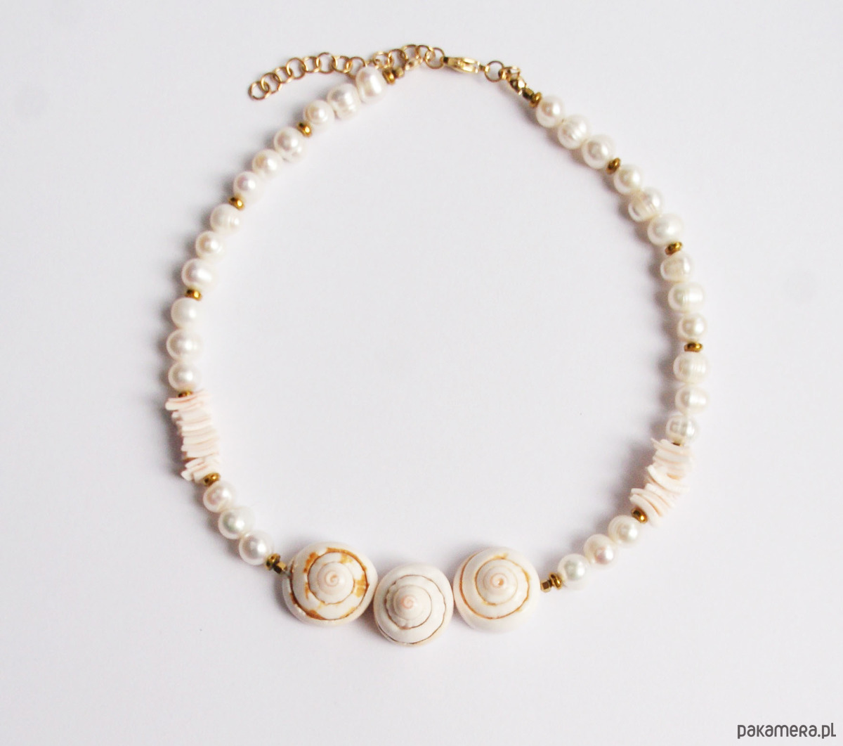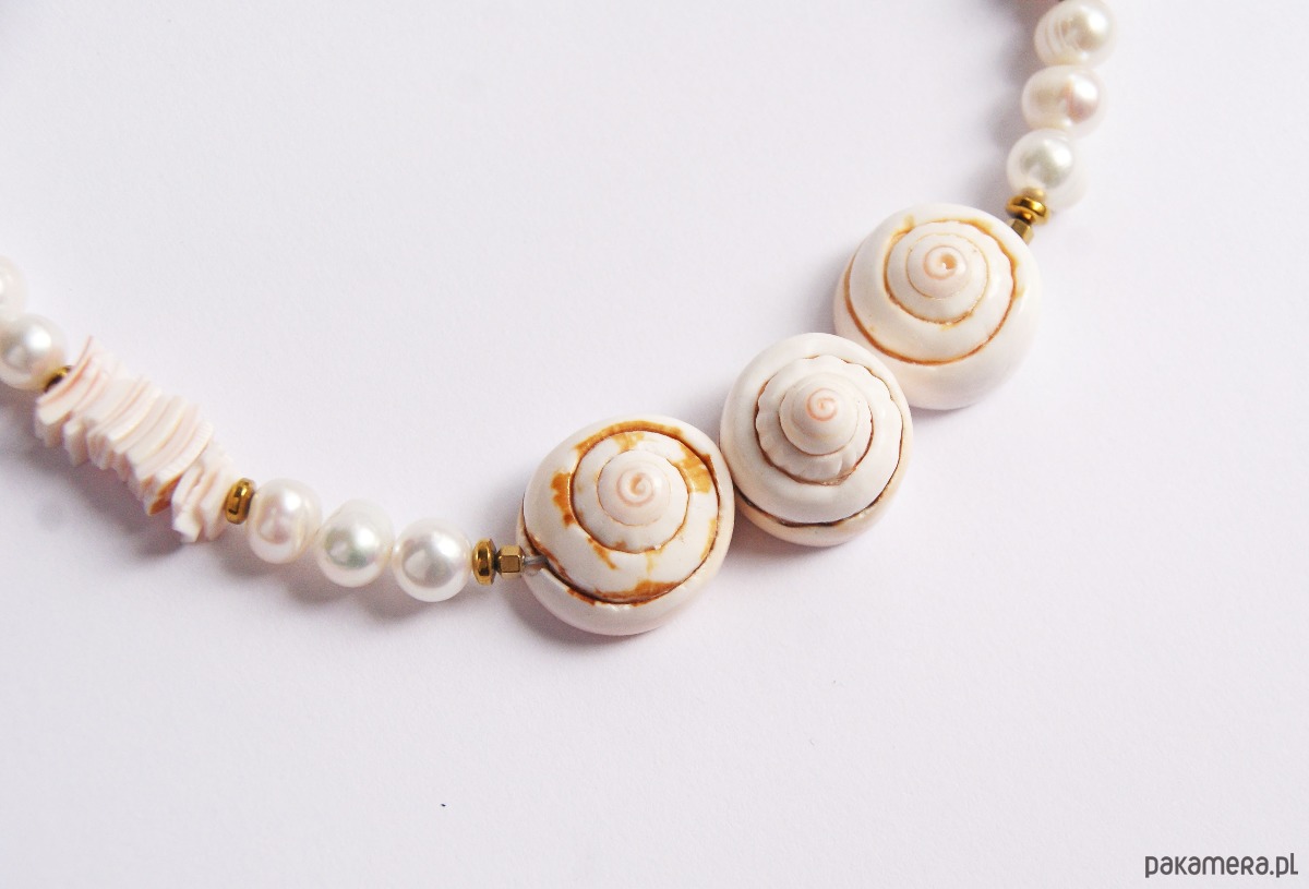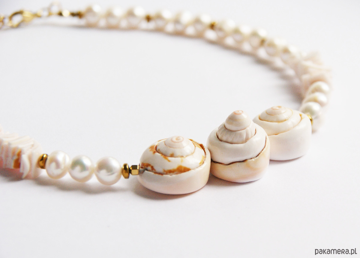 Krótki, okazały naszyjnik wykonany z naturalnych pereł słodkowodnych, muszli ciętej (biało-różowa) złotego hematytu (przekładki) oraz trzech mocno przestrzennych muszli.